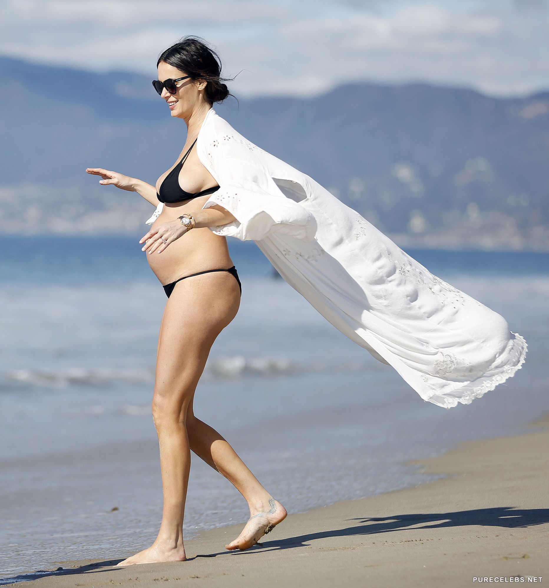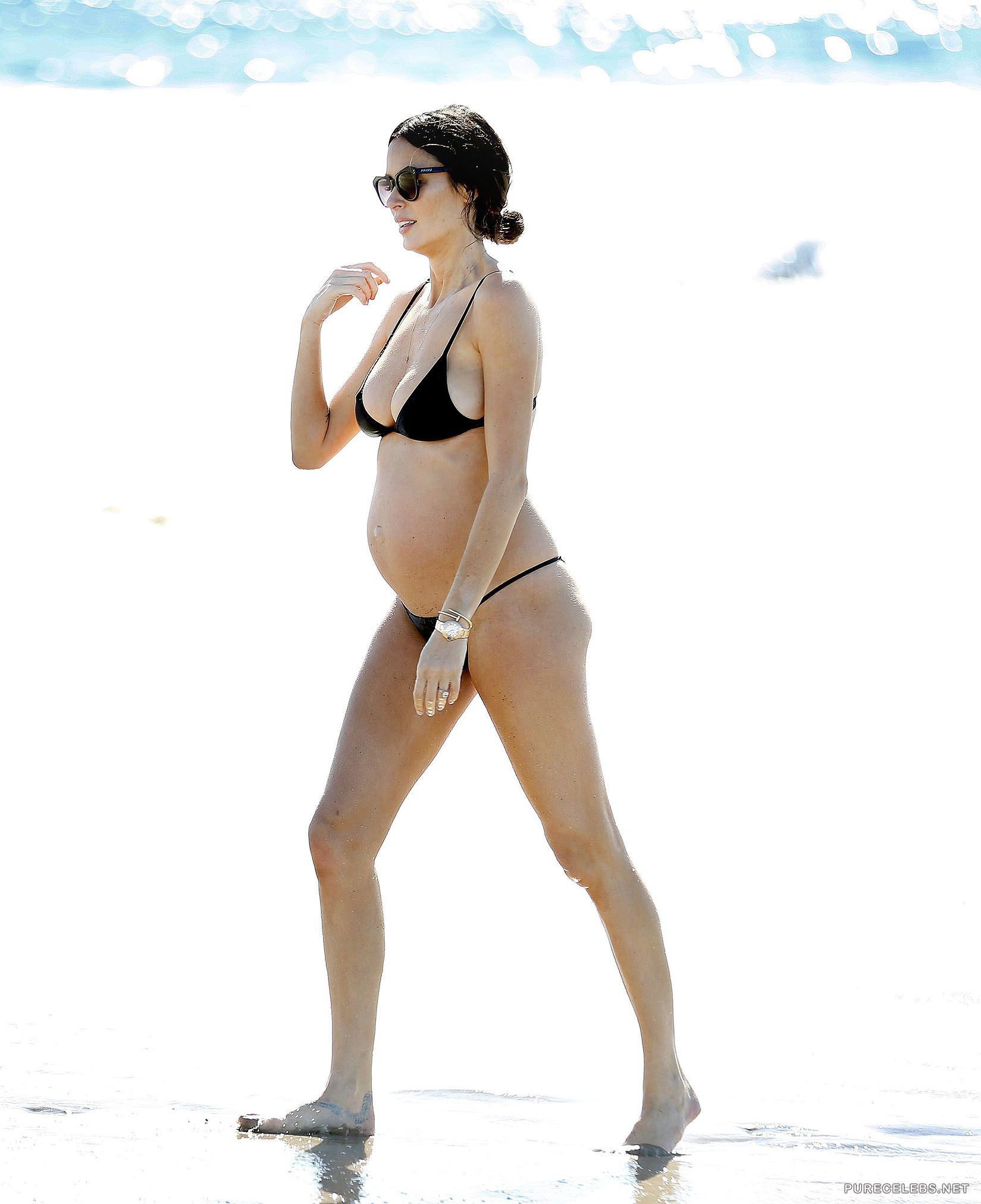 31 year old Australian model Nicole Trunfio announced earlier this year that she and her husband are expecting their first child. If you are interested in this babe’s pregnancy development, you are in the right pace. We have some candid beach photos of the stunning brunette in a miniature black bikini with her baby belly sticking out. It looks like she has been working hard to maintain that amazing body.