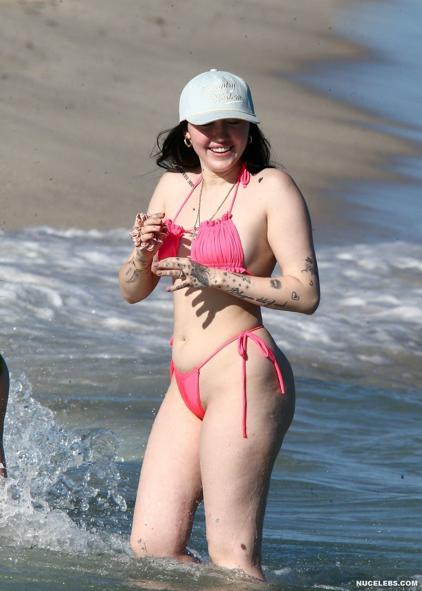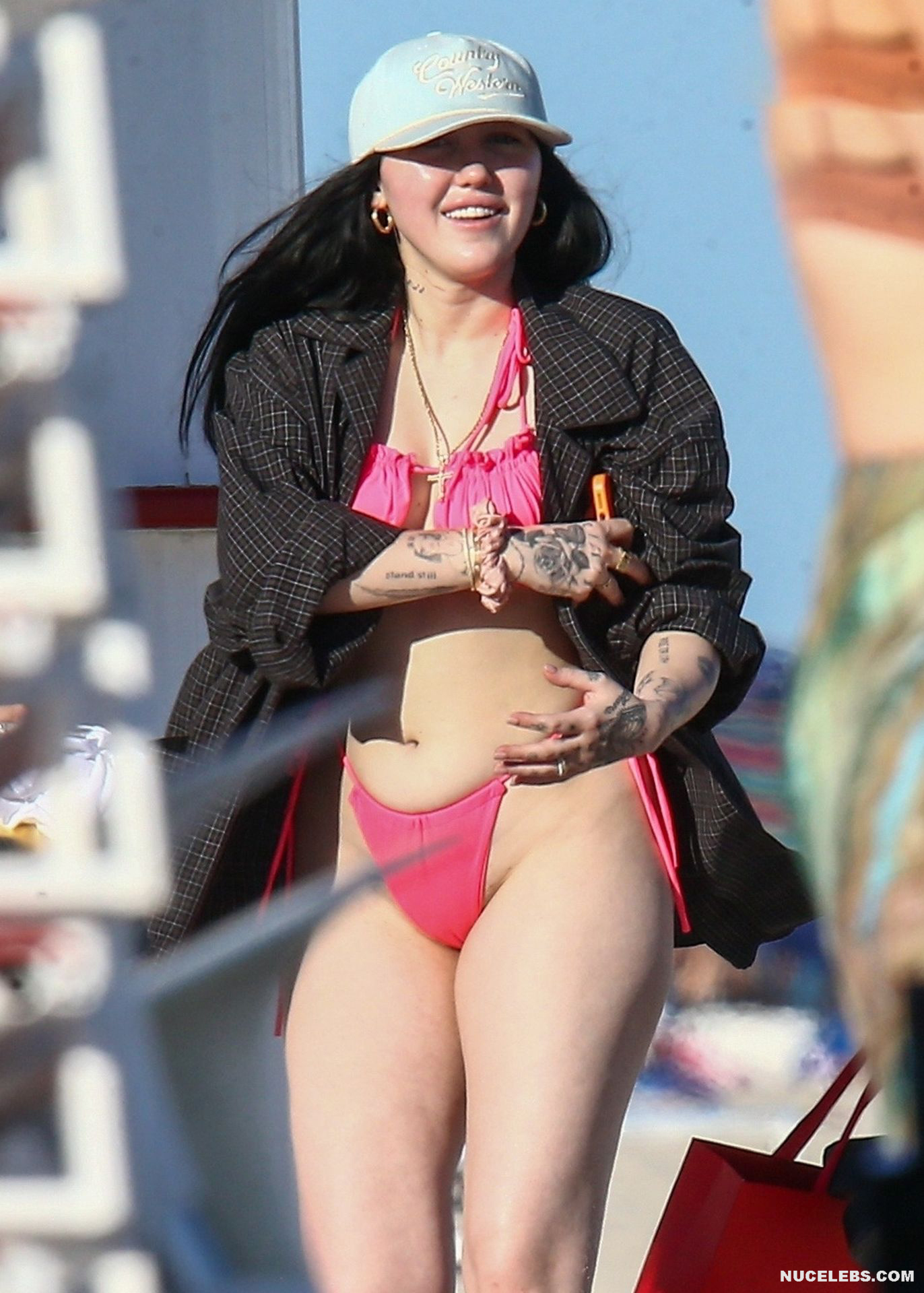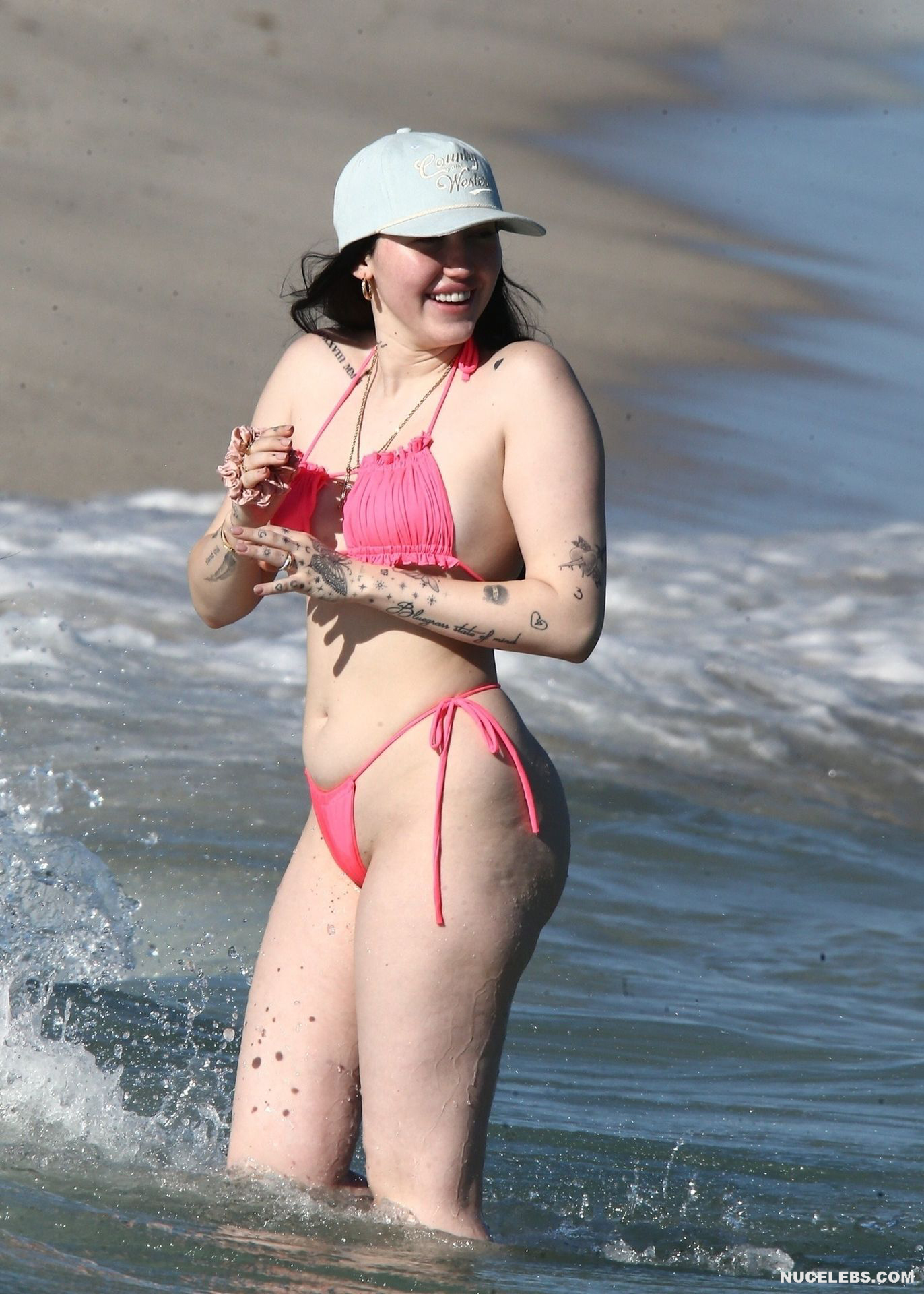 It seems that Noah Cyrus has decided to keep up with her famous sister, who often appears nude. Although this 21-year-old singer did not dare to completely strip herself. The paparazzi photographed her in a petite pink bikini on the beach. A small bra barely covered her big juicy tits. And when you look at her Noah Cyrus big butt in pink thongs, it could seem that it is nude!