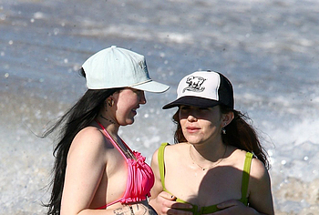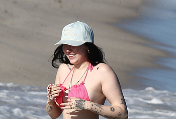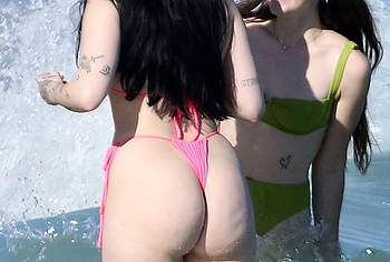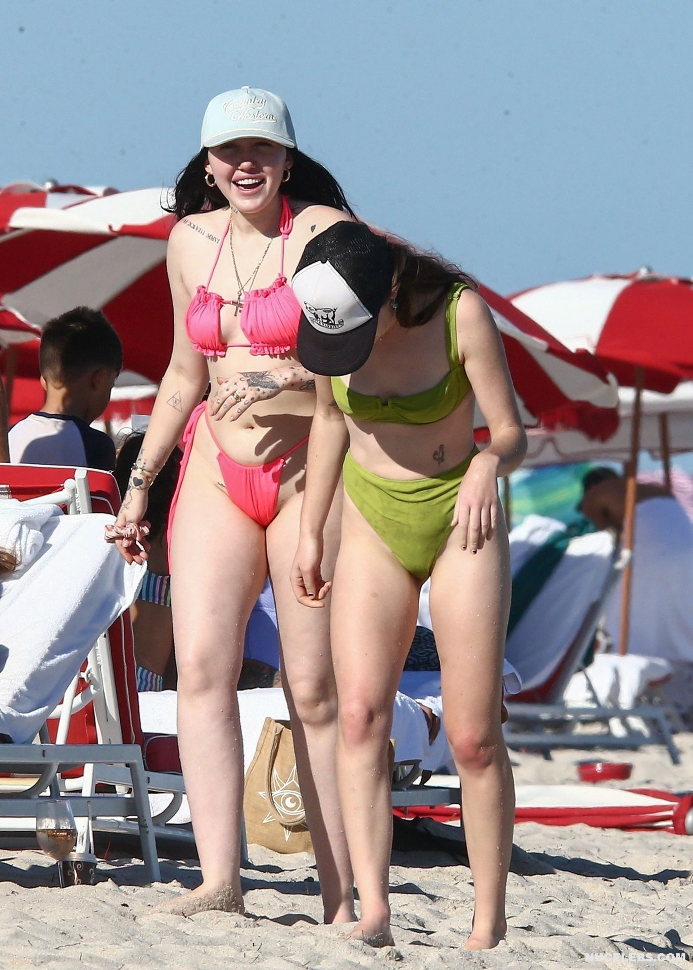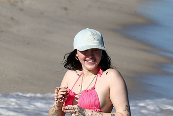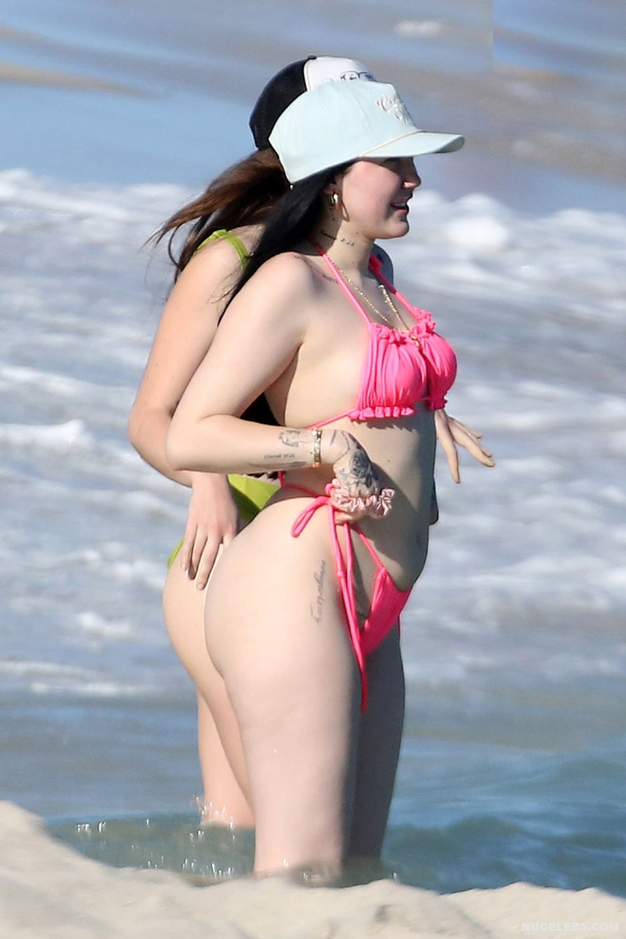 It seems that Noah Cyrus has decided to keep up with her famous sister, who often appears nude. Although this 21-year-old singer did not dare to completely strip herself. The paparazzi photographed her in a petite pink bikini on the beach. A small bra barely covered her big juicy tits. And when you look at her Noah Cyrus big butt in pink thongs, it could seem that it is nude!