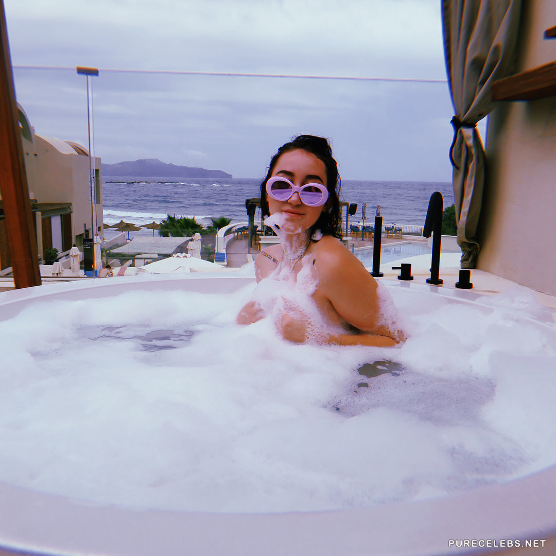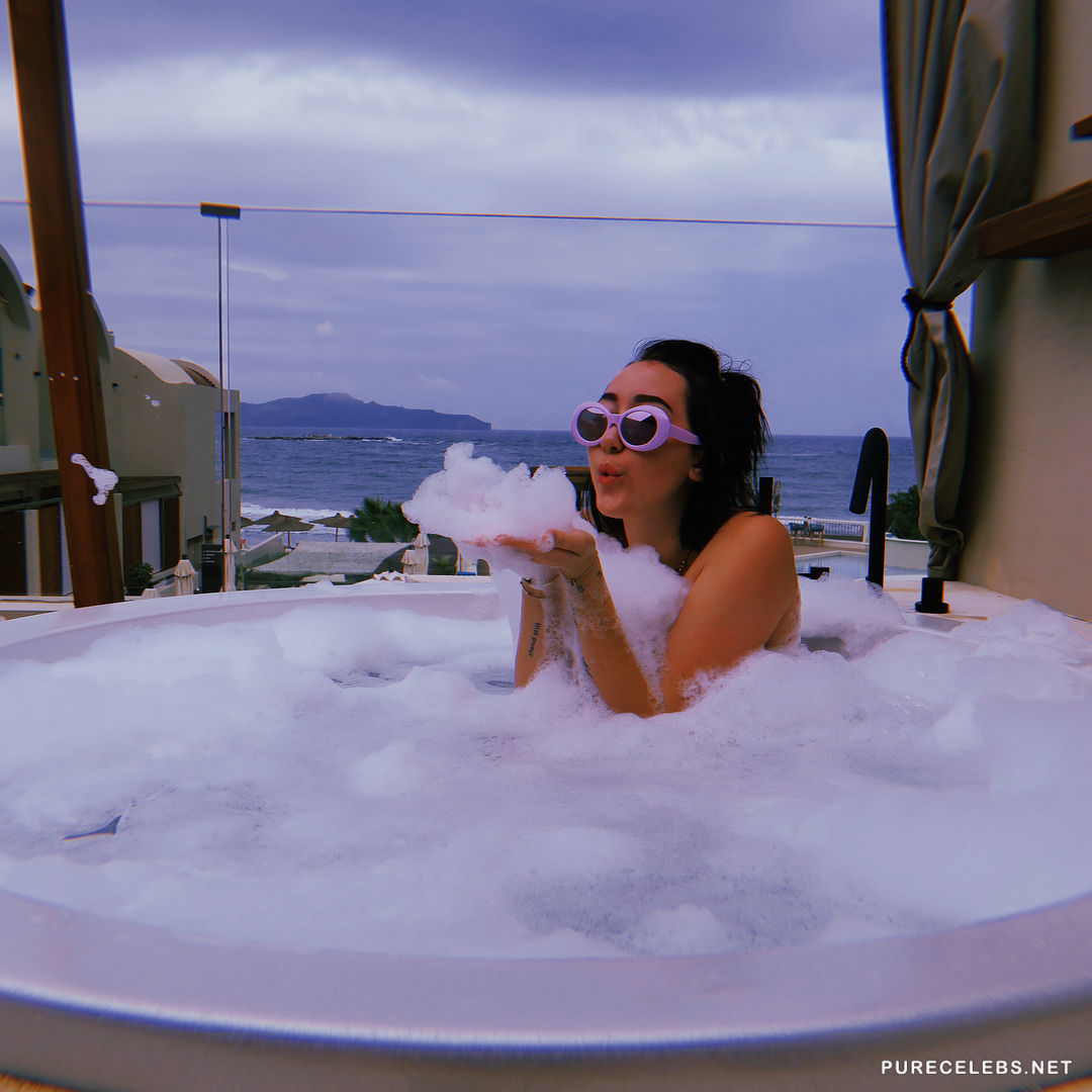 Noah Cyrus is a striving actress and model, this sweet looking brunette is barely 19 years old yet she made a quite a name for herself in the show business. It’s so hard to resist her slender body and her pretty face. Now you can see how she chills! Noah bathtub photo session will satisfy all her fans and Pure Celebs visitors. She plays with soap foam and covers her natural boobs in a seductive way.