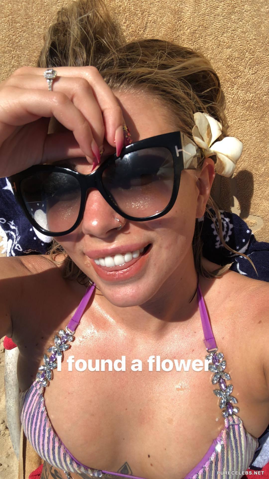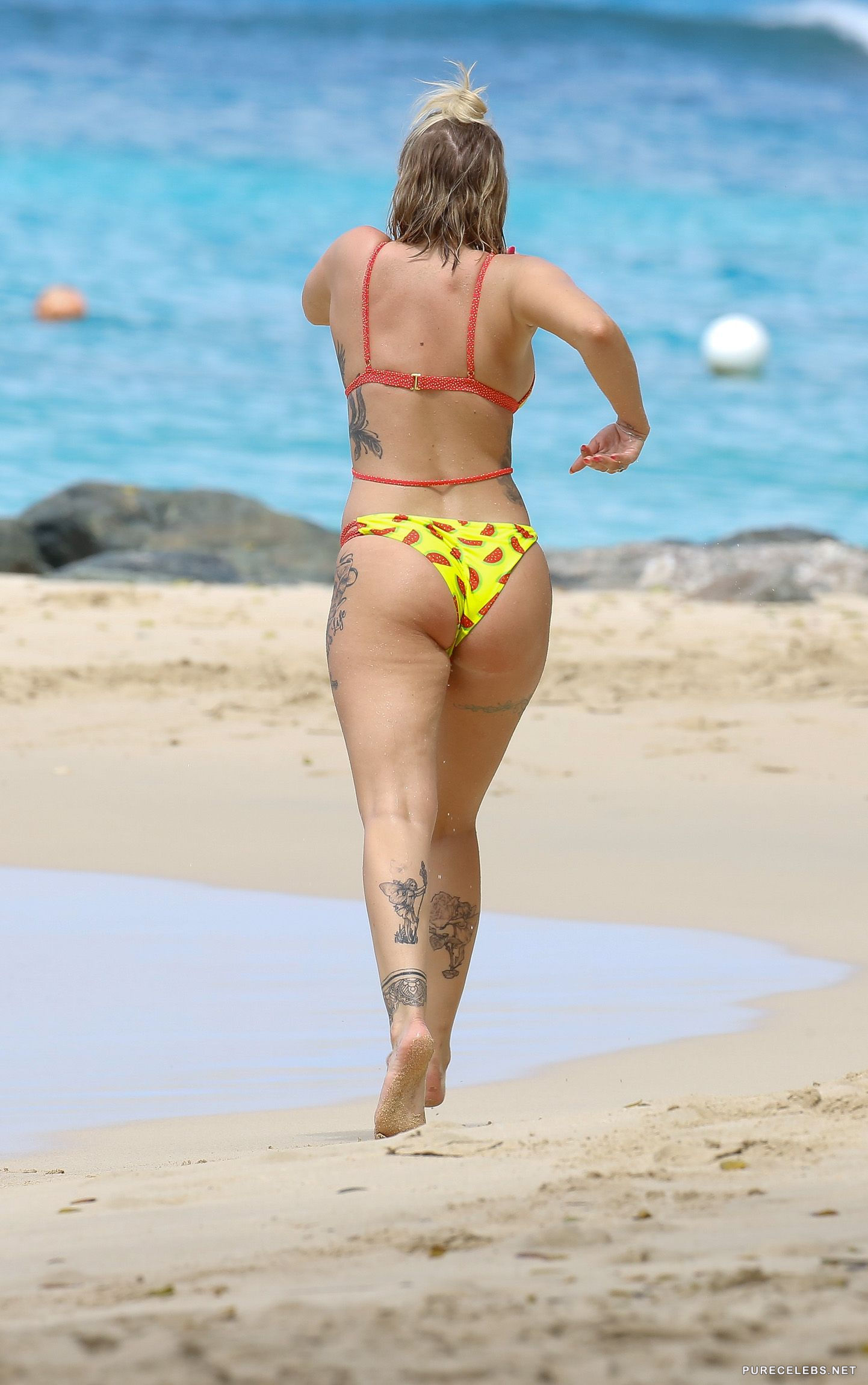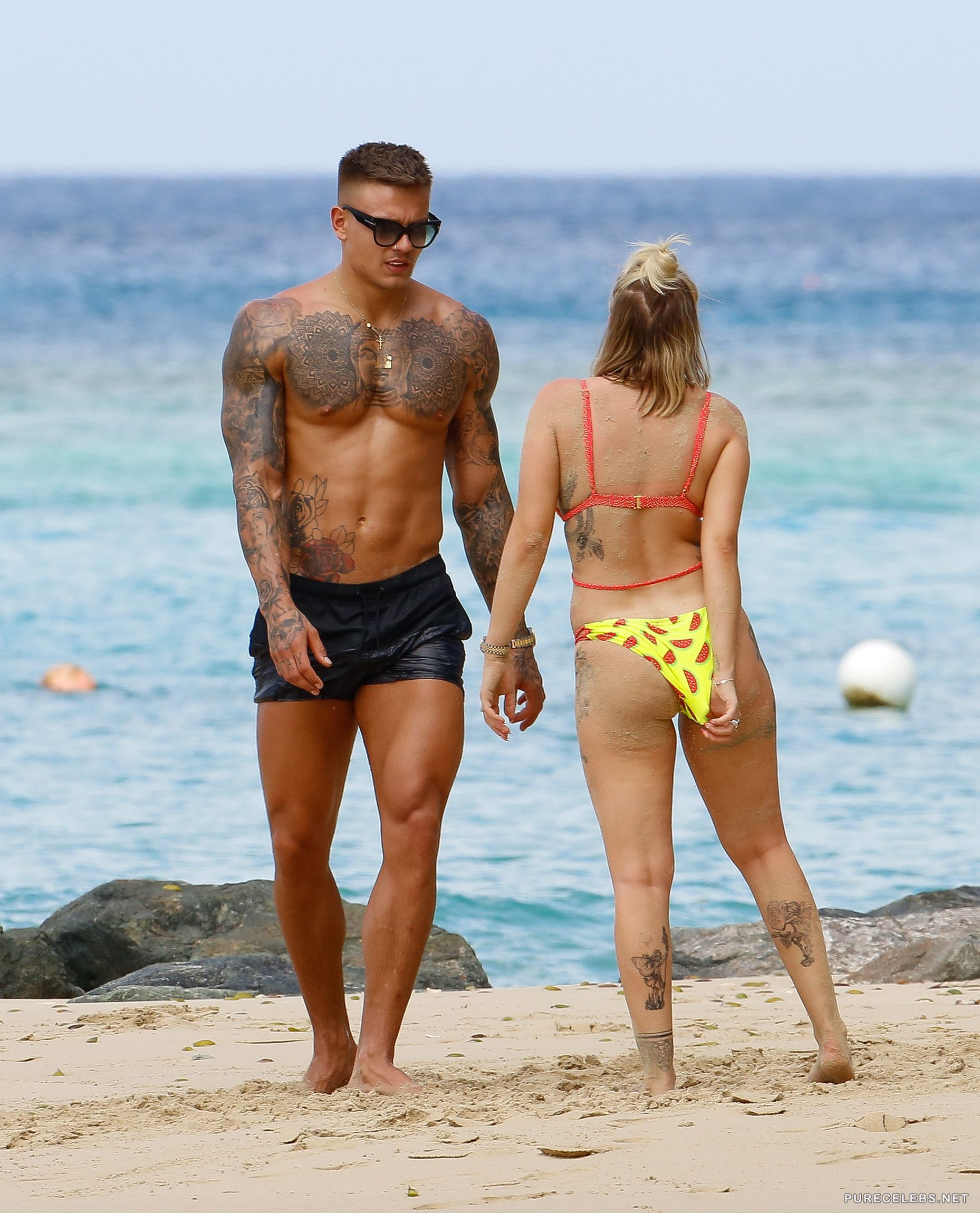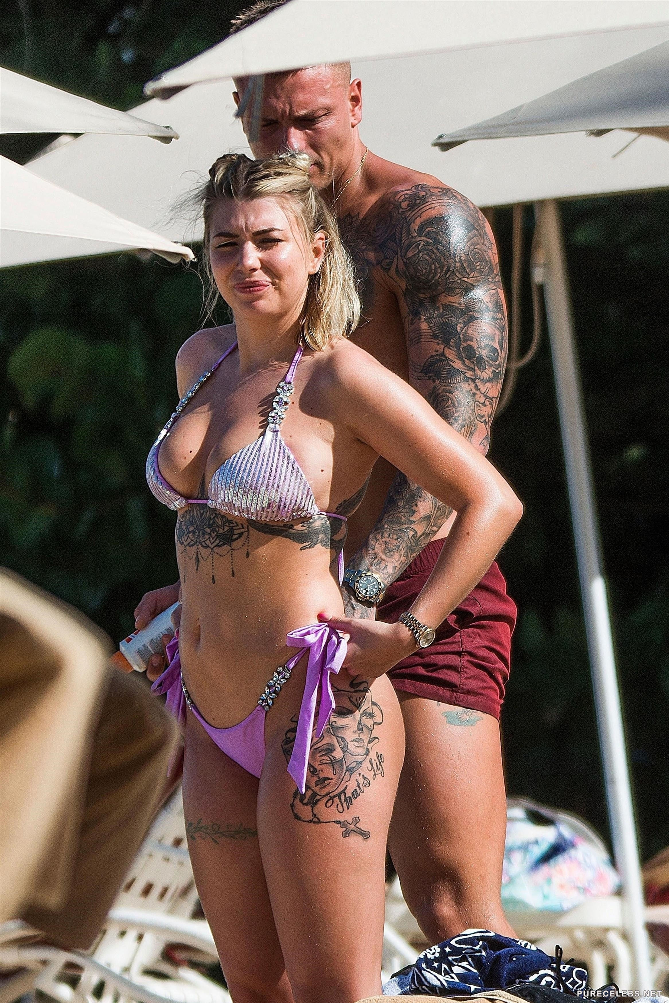 Olivia Buckland and her boyfriend seem to be enjoying their vacation. Paparazzi can see them and photograph them on the beach every single day. While her boyfriend is the quiet type and enjoys sunbathing, Olivia is more athletic and likes to run around among the waves and even do some squats to keep that plump butt of hers nice and tight. Her purple jeweled bathing suit went so far up her ass, it looked like a proper thong.