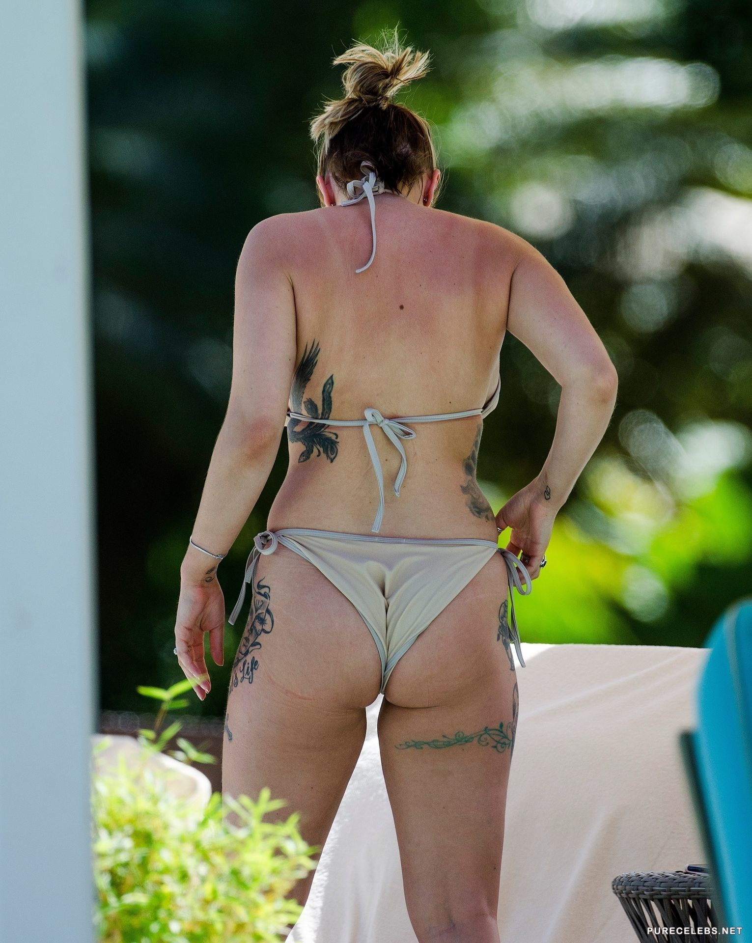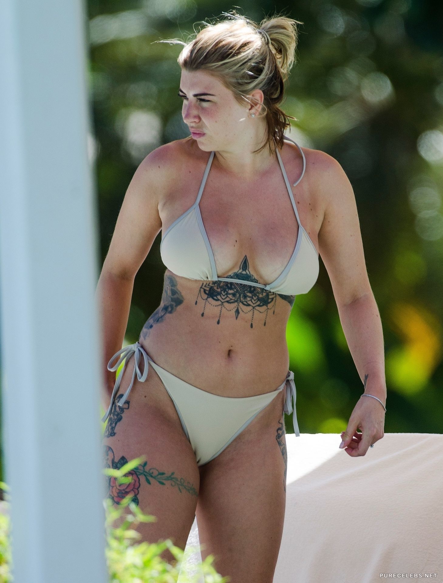 Olivia Buckland is best known to viewers of the reality show Love Island. Not long ago, this 25 year old beauty decided to sunbathe in a miniature bikini showing off her gorgeous figure. Her boobs looked very seductive and huge in her bra and her booty was very seductive in tight thongs. Thongs are fitting her so well that we can see her wonderful cameltoe.