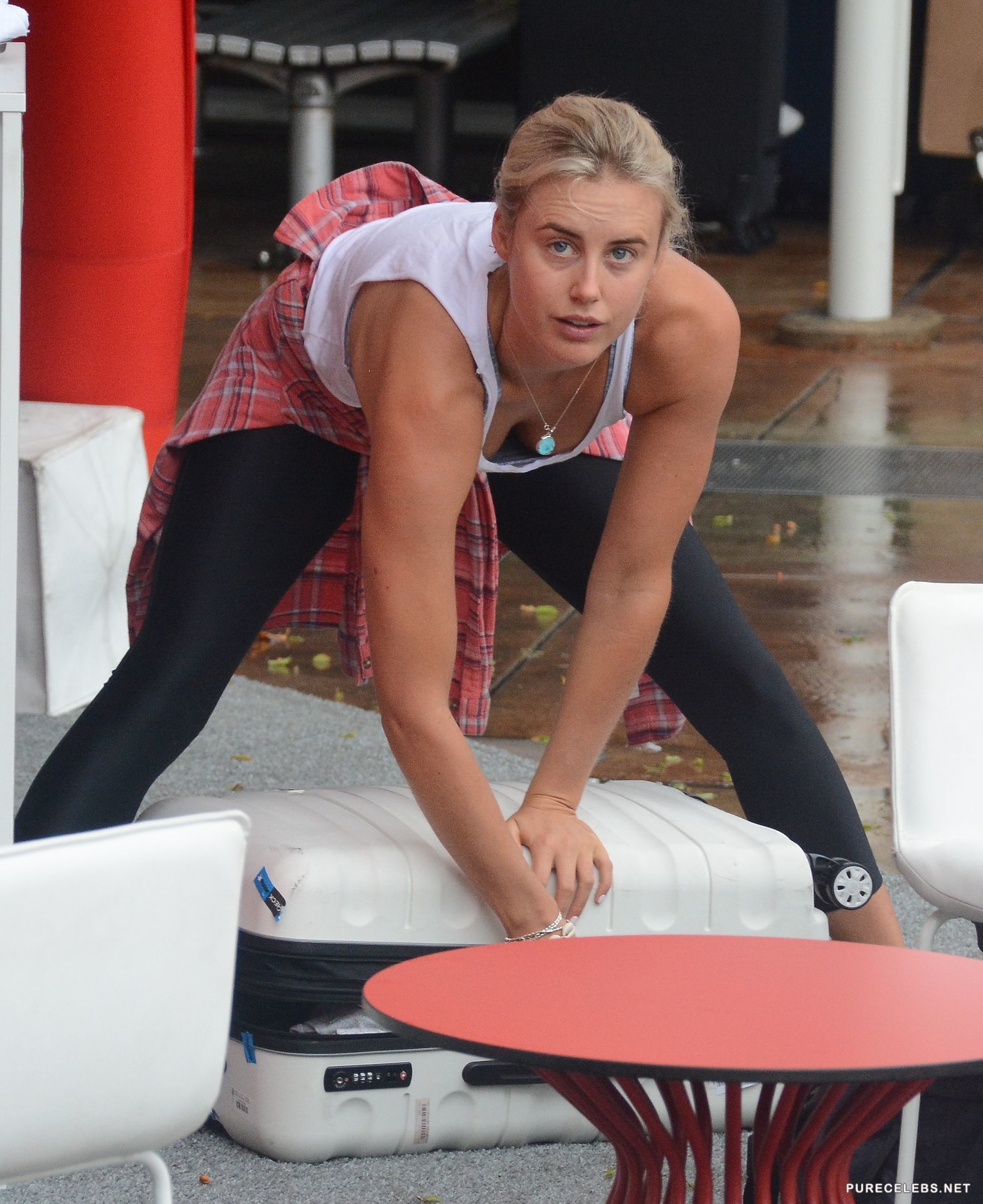 Olivia Phyland is a TV celebrity with blonde hair and pretty blue eyes and she keeps her body fit by working out. Today she does not look around to see if there are any paparazzi around and one dude manages to catch her as she is doing her stretches. He manages to snap photos of her cleavage as she is bending over.