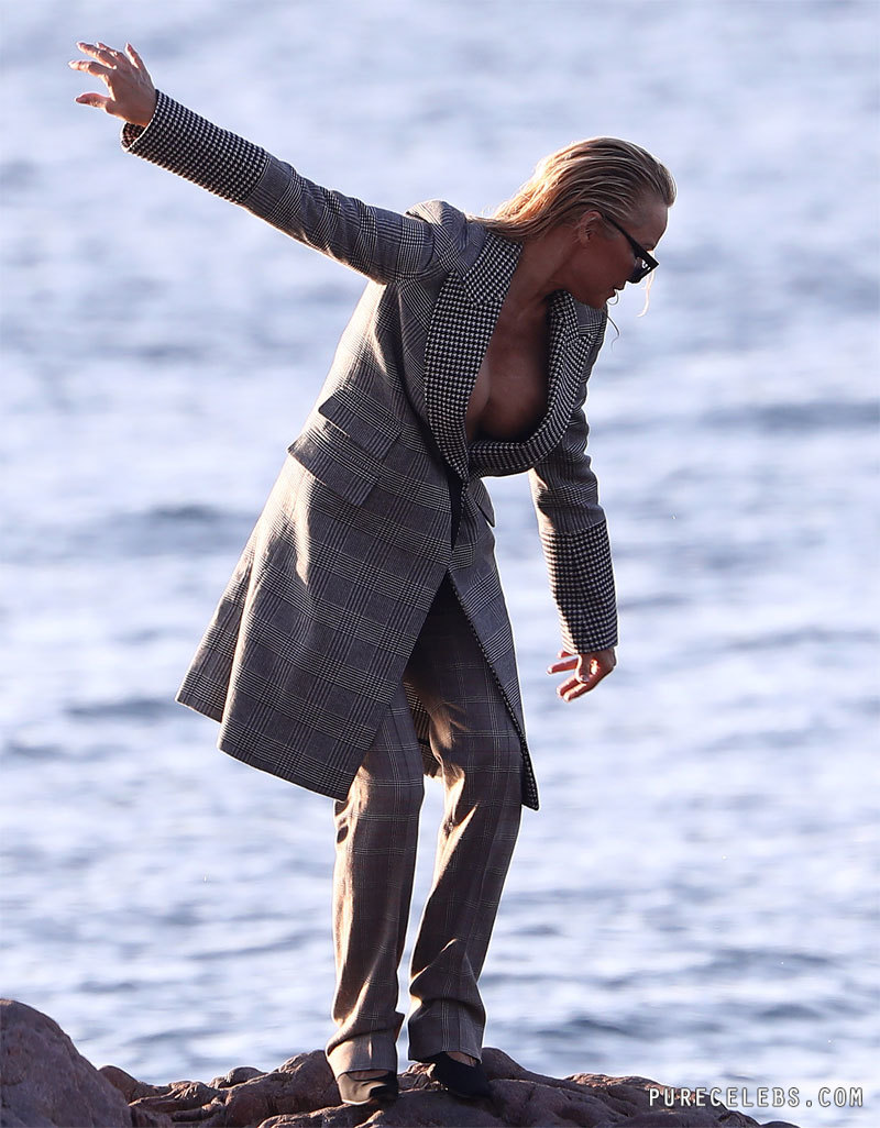 Hurrah! Paparazzi finally managed to capture Pamela Anderson’s nude titties. The actress was photographed on the beach in gray pants and a gray coat. The celebrity did not wear a bra, and her coat had a deep neckline. So it is not surprising that when Pamela Anderson bent over, a nude tit with a brown nipple slipped out of a deep cut. Awesome nipple slip moment, what do you think?