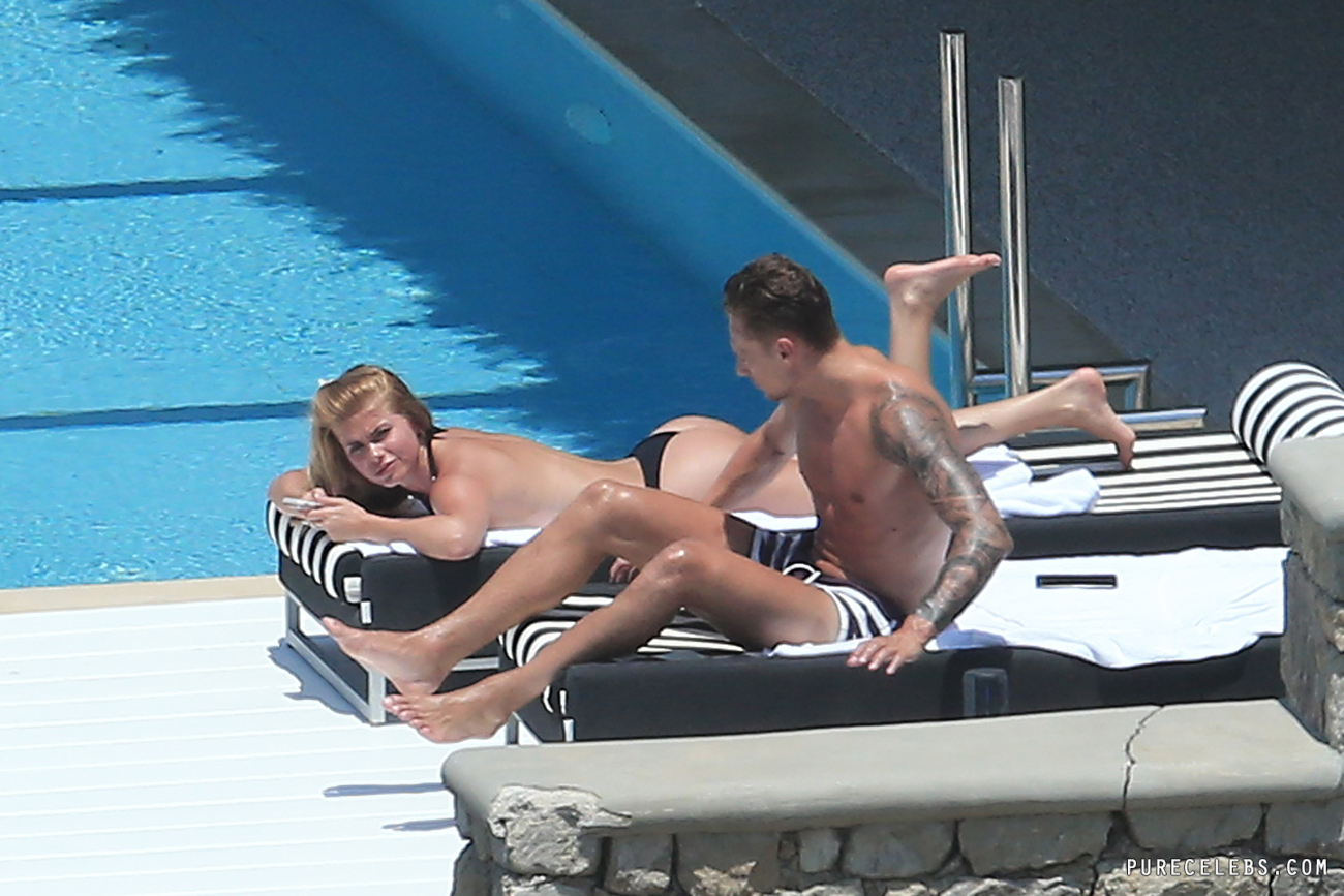 Paparazzi love to hunt for the hot beauty Pamela Reif. So they caught this celebrity during her vacation near the pool. The girl was dressed in a small black bikini, which barely covered her beautiful body. But the most attention was attracted by her awesome booty in narrow thongs. From far away it seemed that the Pamela Reif butt was completely nude.