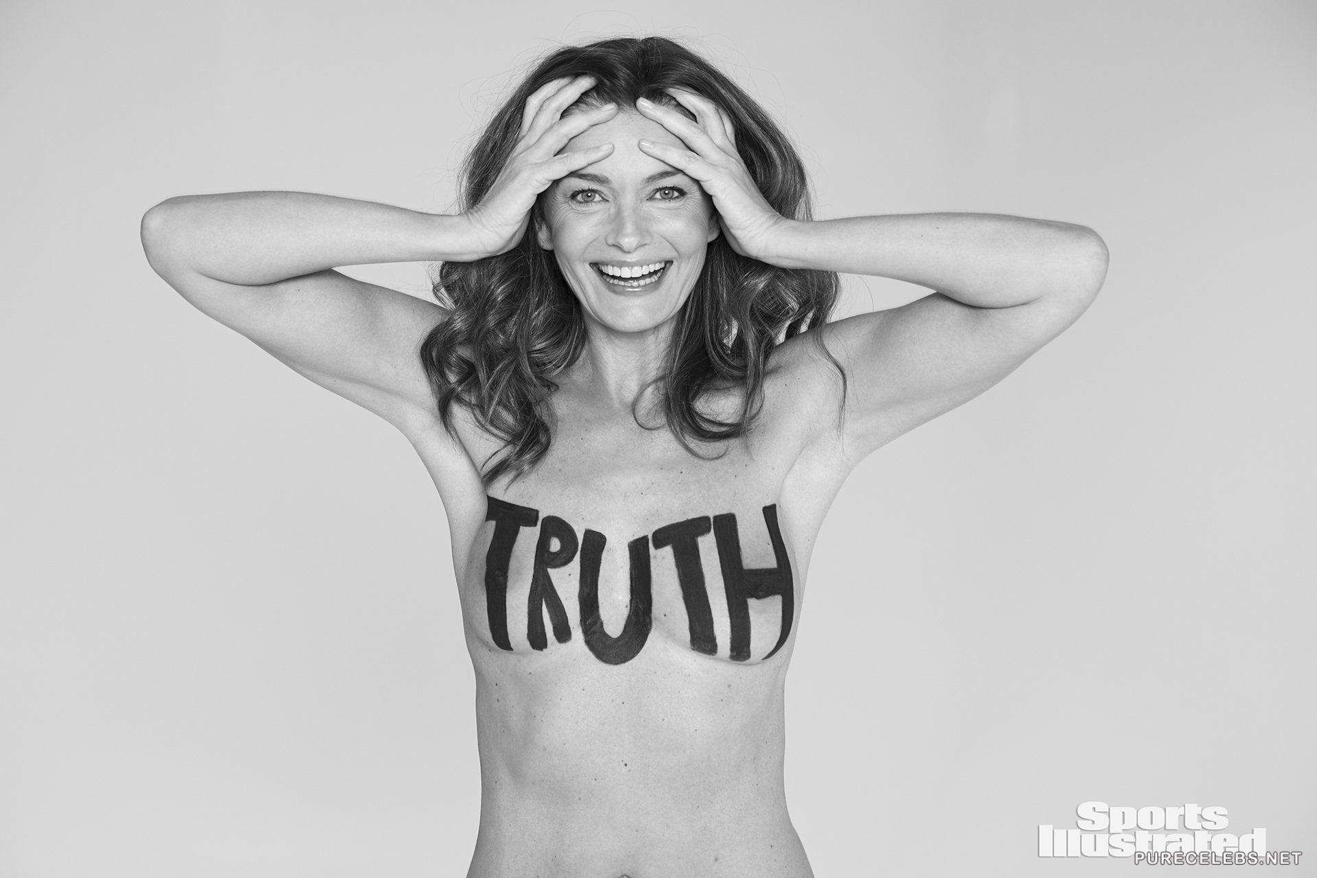It seems like all the famous models want to be a part of the Sports Illustrated campaign to promote female beauty. As part of this movement the lovely Paulina Porizkova stripped down until she was completely nude and wrote only one words across her chest in big black letters. Her naked body looks amazing in these photos and her powerful message of promoting the truth is clear just by looking at these pictures.