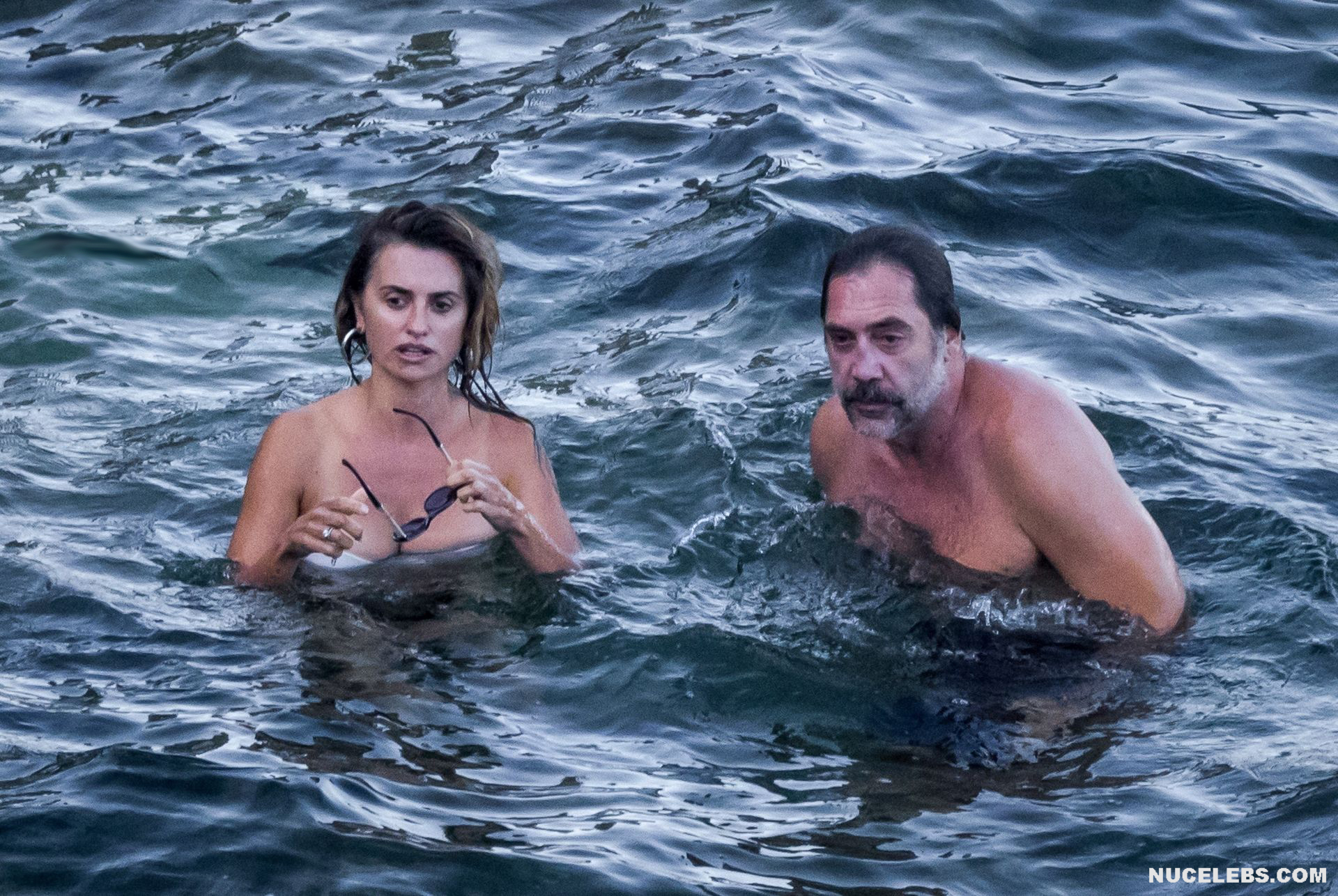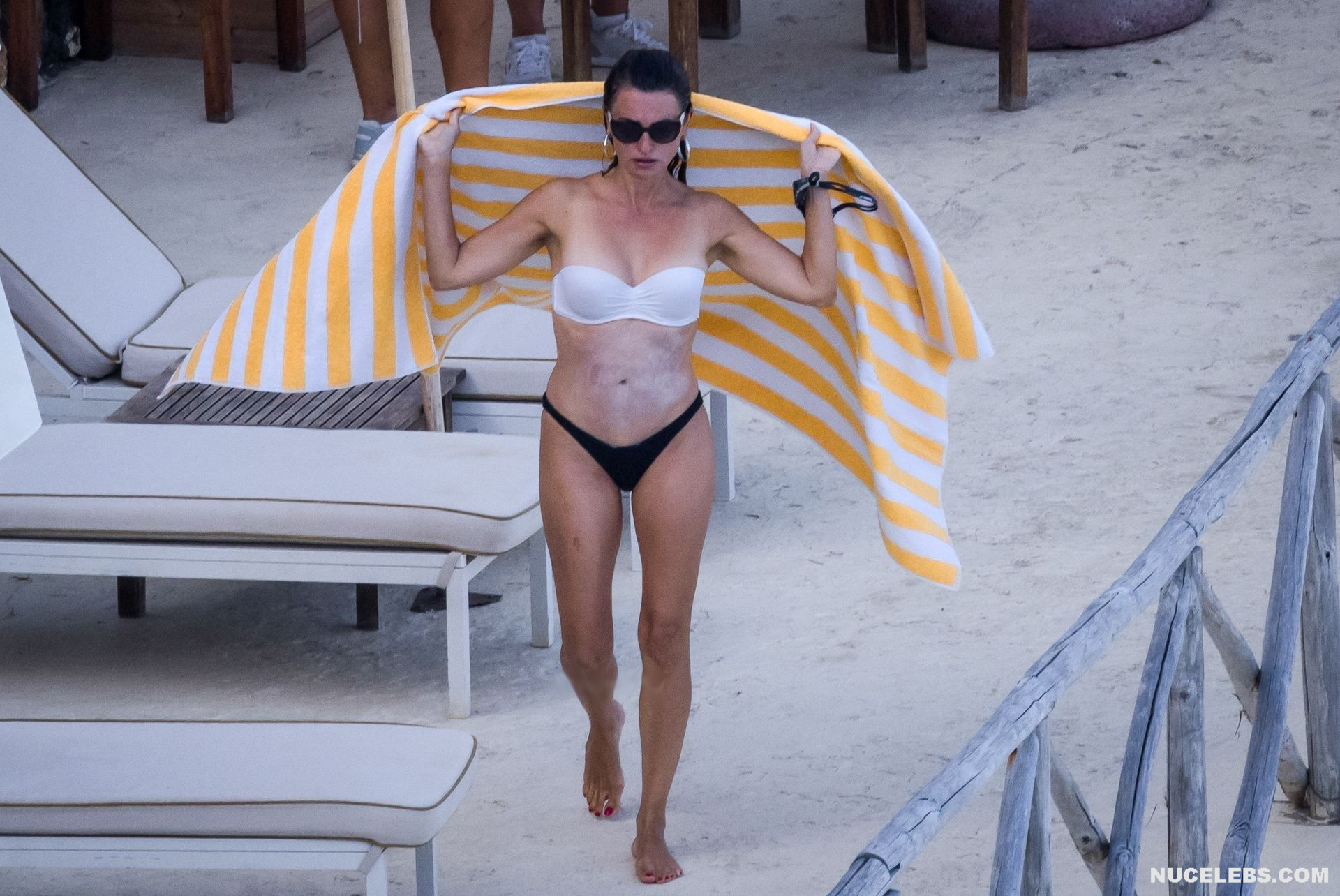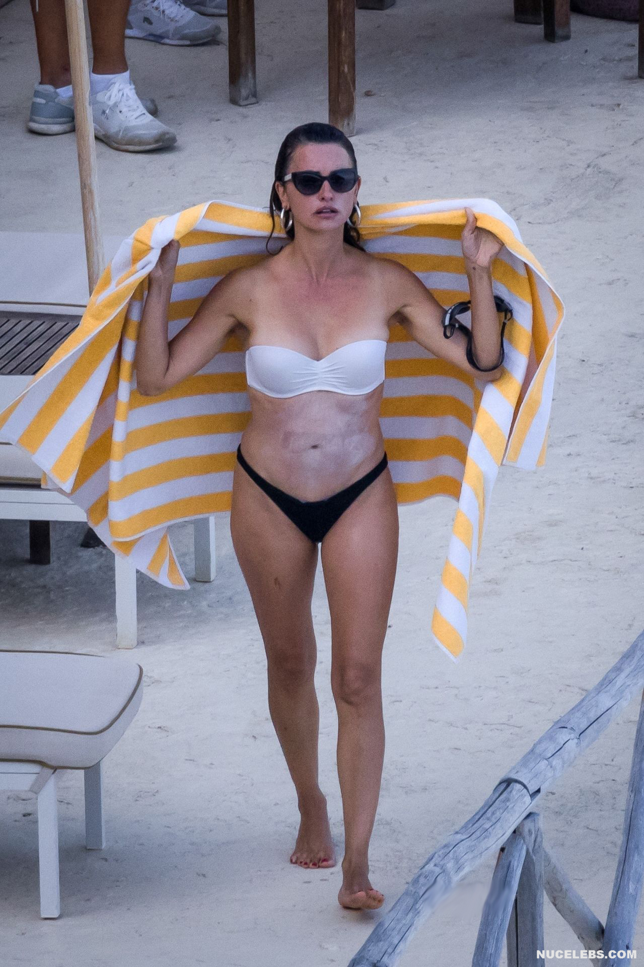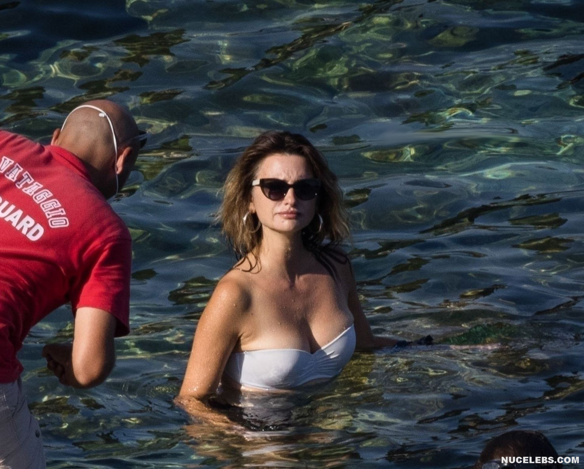 Spanish actress Penelope Cruz loves to spend her free time by the sea. Recently, the paparazzi photographed this celebrity while she was relaxing on the beach. The girl was dressed in a black and white bikini, in which she looked incredibly sexy. It’s amazing how the little white bra didn’t slip off Penelope Cruz’s nude boobs as she stepped out of the water! After all, her tits looked too big for that! And her black panties were so tight that Penelope Cruz’s nude pussy lips seemed to slide out of them with every step she took!