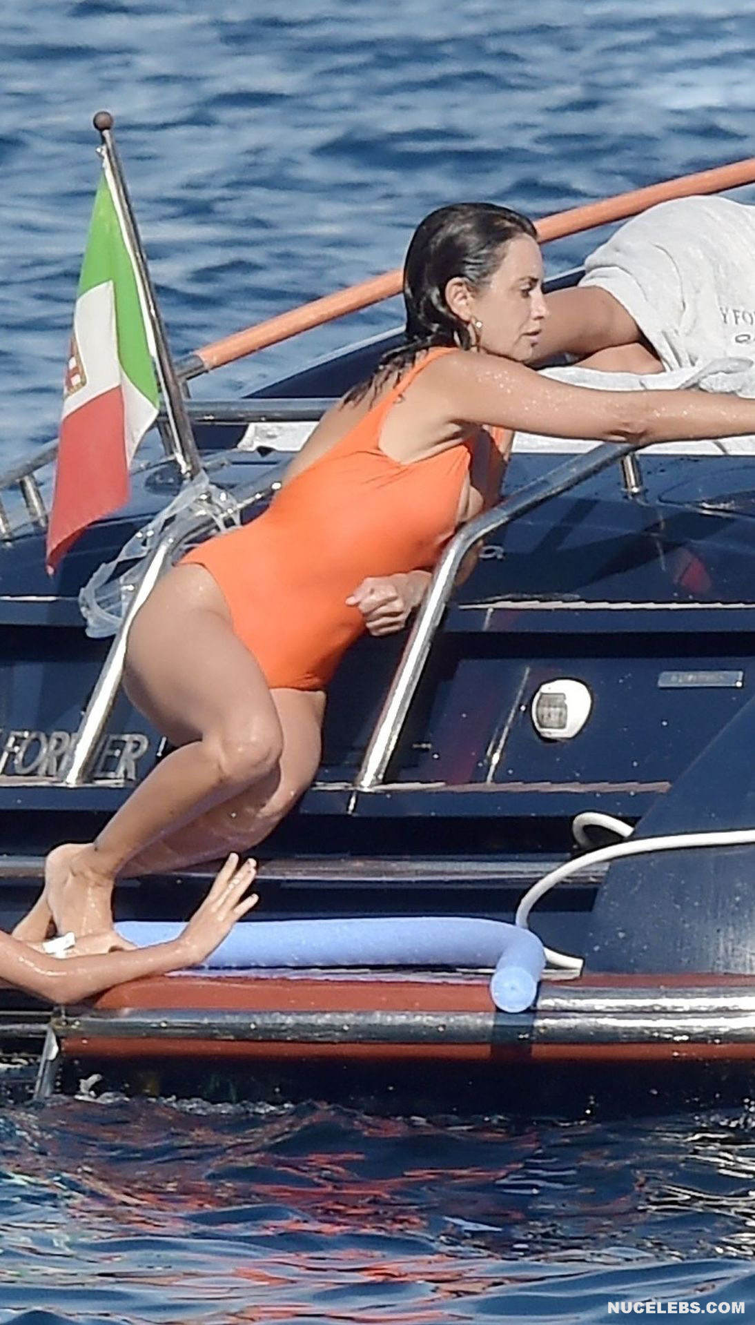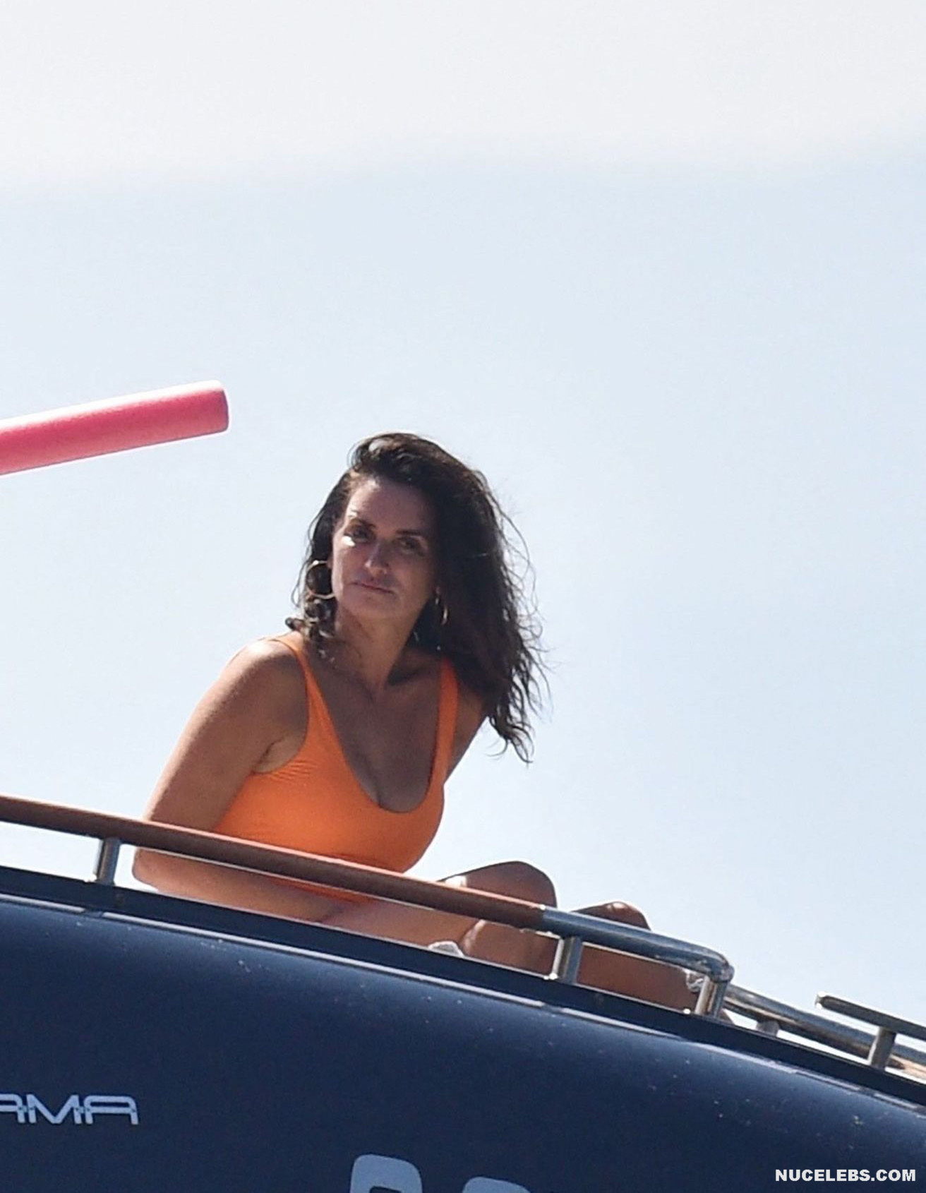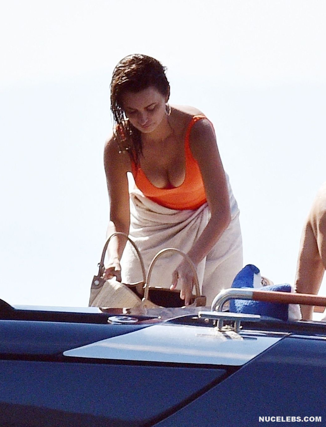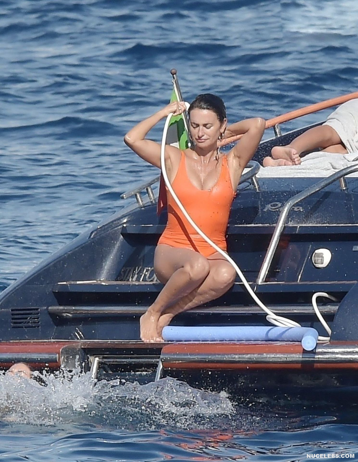 You’ll be drooling over Penelope Cruz’s awesome booty in an orange swimsuit during her vacation. Check out her awesome boobs in her low cut swimsuit. This charming brunette was having a great time jumping from a yacht into the sea. And it will turn you on when you see how Penelope Cruz watered her sultry body from the shower on the yacht.
