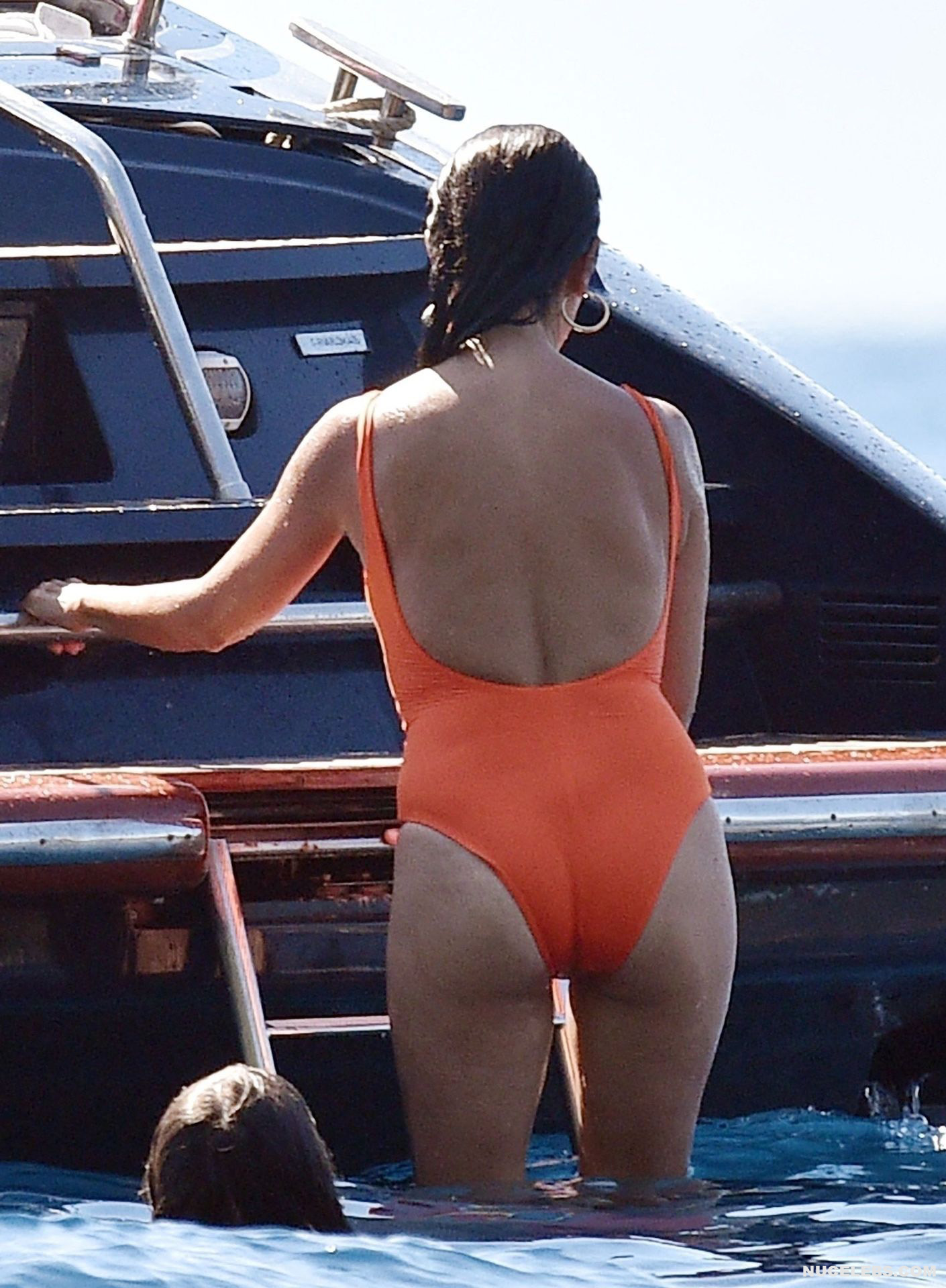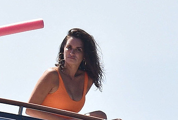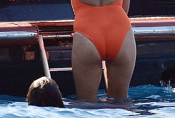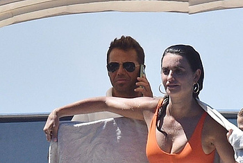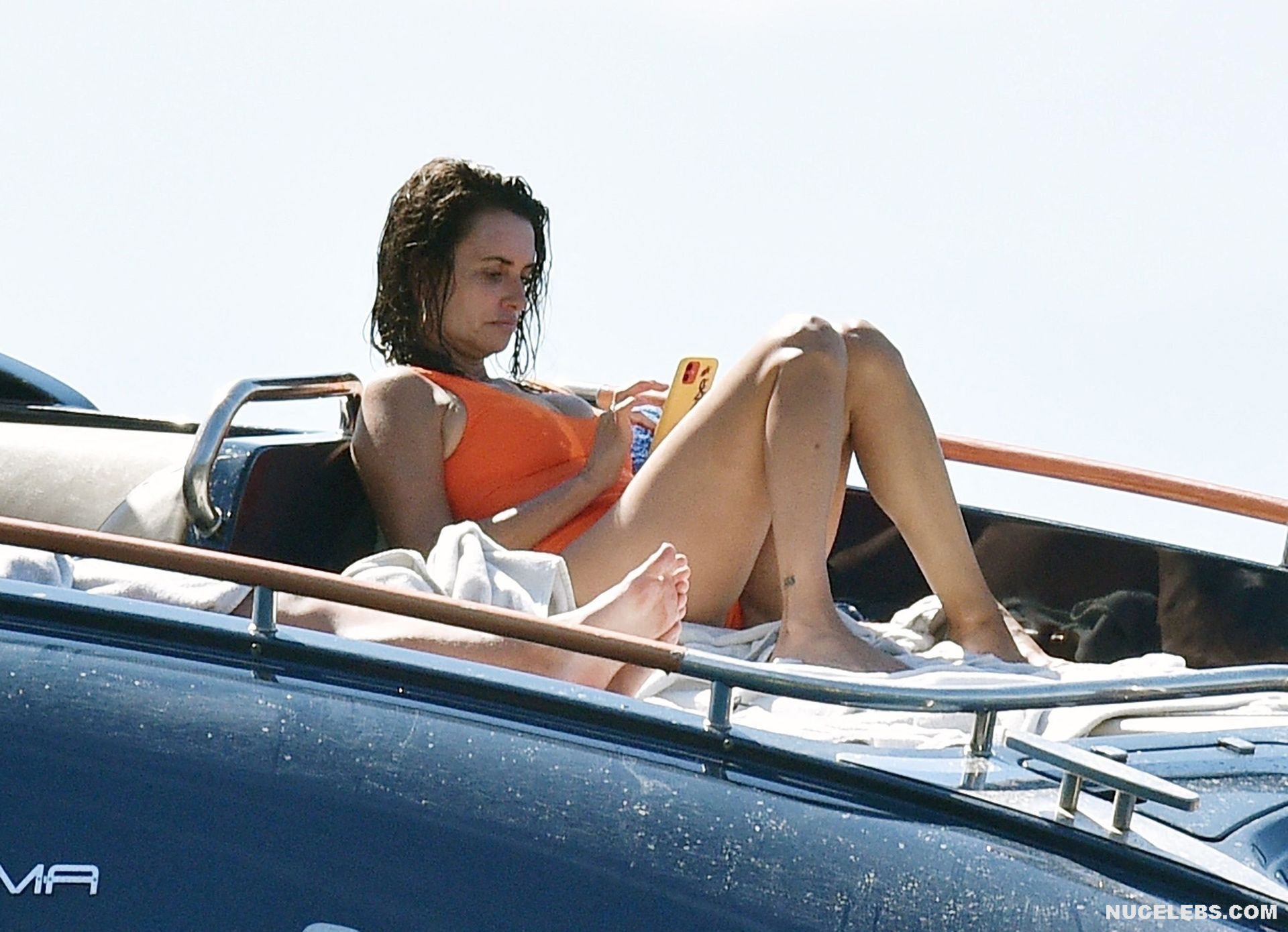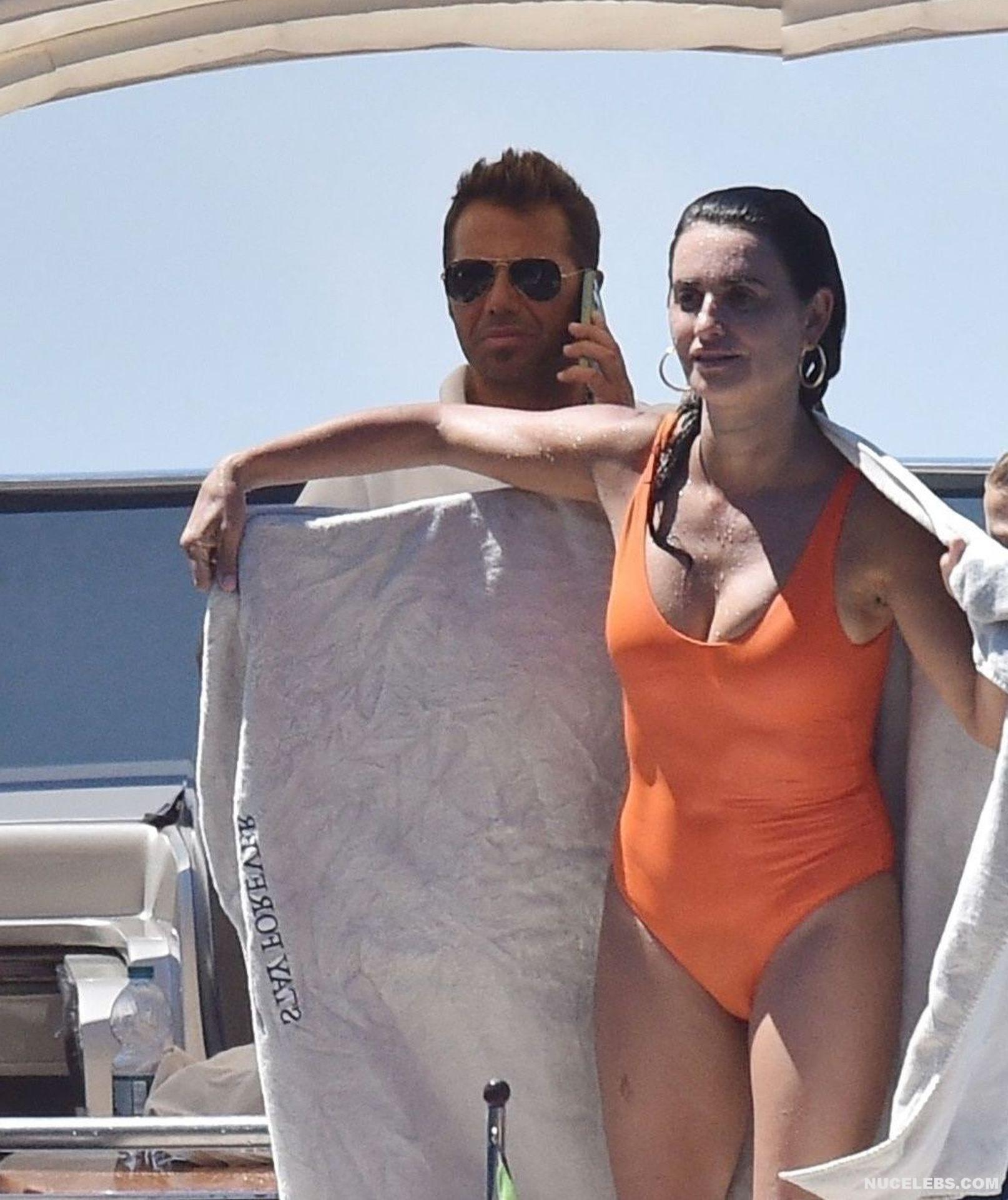 You’ll be drooling over Penelope Cruz’s awesome booty in an orange swimsuit during her vacation. Check out her awesome boobs in her low cut swimsuit. This charming brunette was having a great time jumping from a yacht into the sea. And it will turn you on when you see how Penelope Cruz watered her sultry body from the shower on the yacht.