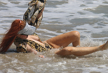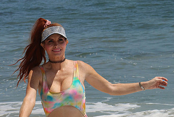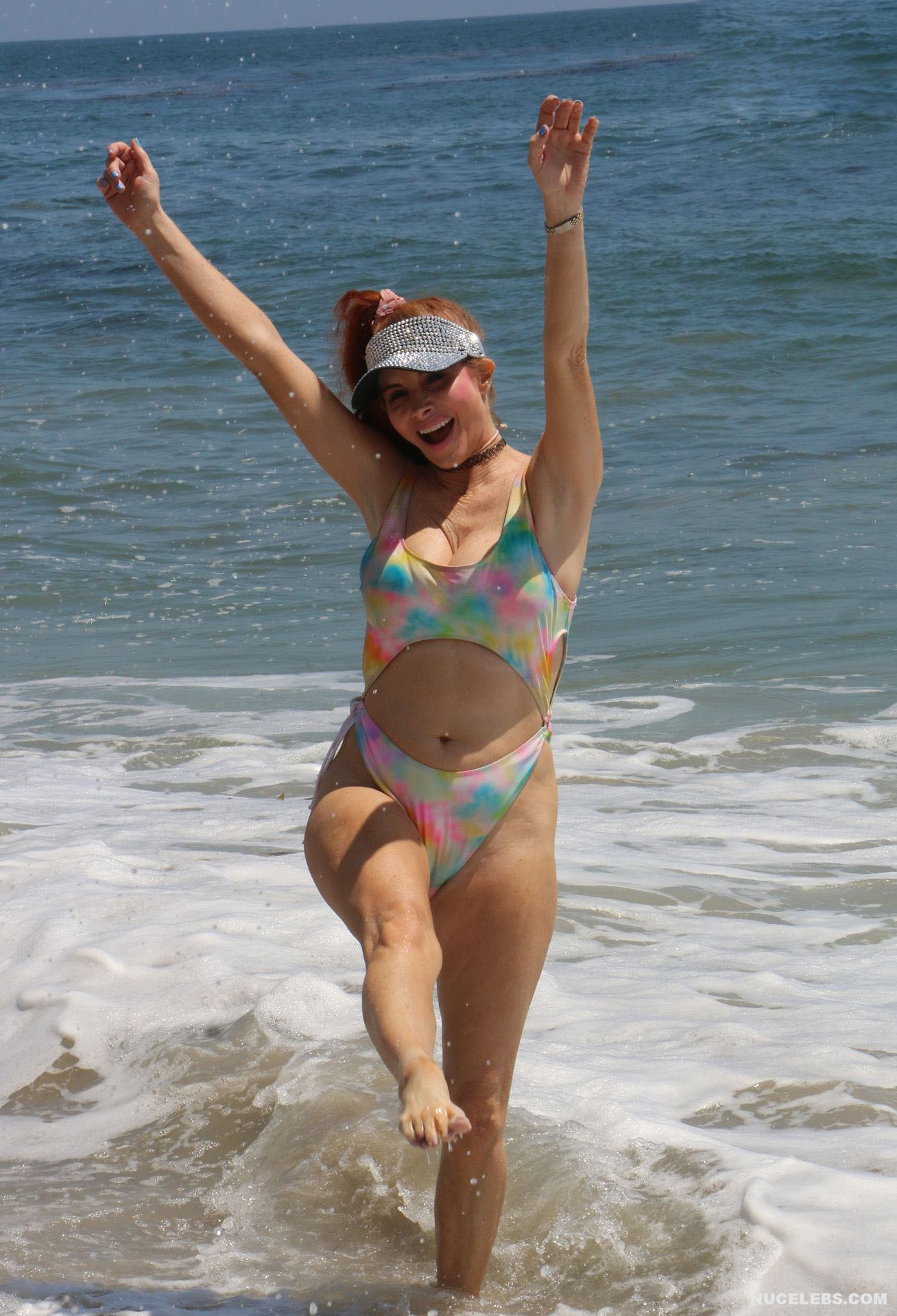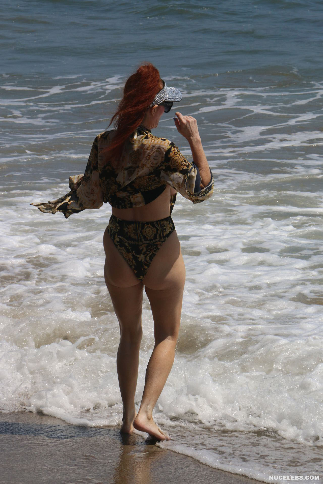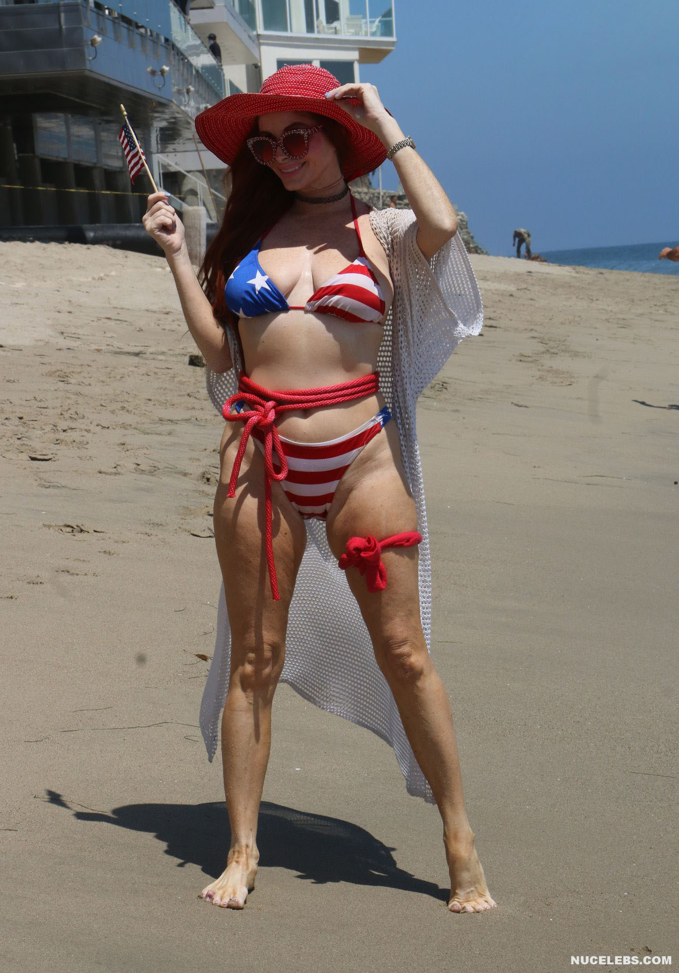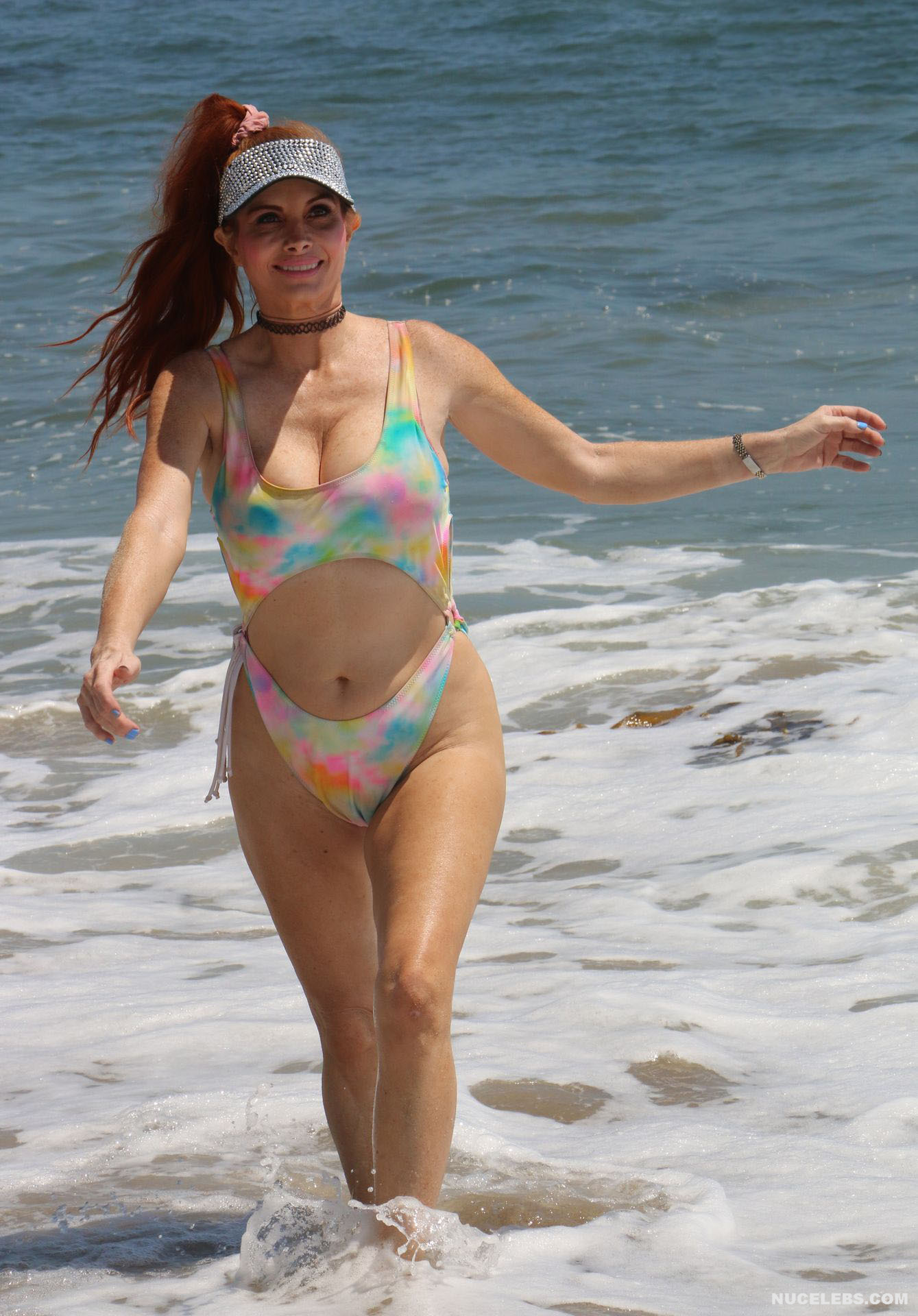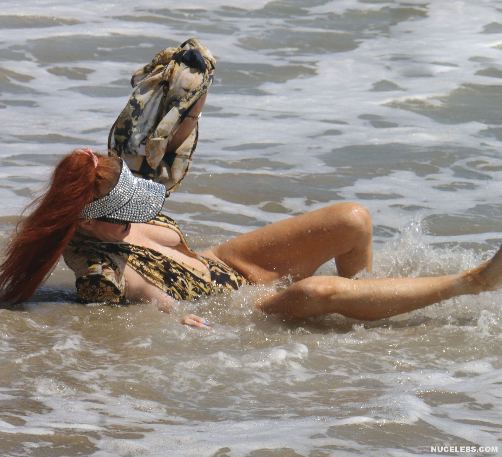 Love for revealing outfits and strong waves played a cruel joke with Phoebe Price. Of course, this star wanted to stir your imagination when she wore a black and beige printed swimsuit with a very low cut. However, when she emerged from the sea, the wave knocked her down. At the same time, Phoebe Price’s nude boob with brown nipple jumped out of her swimsuit! Well, I think Phoebe Price should be glad that she still had her swimsuit on and at least her nude pussy was hidden!