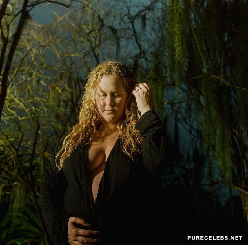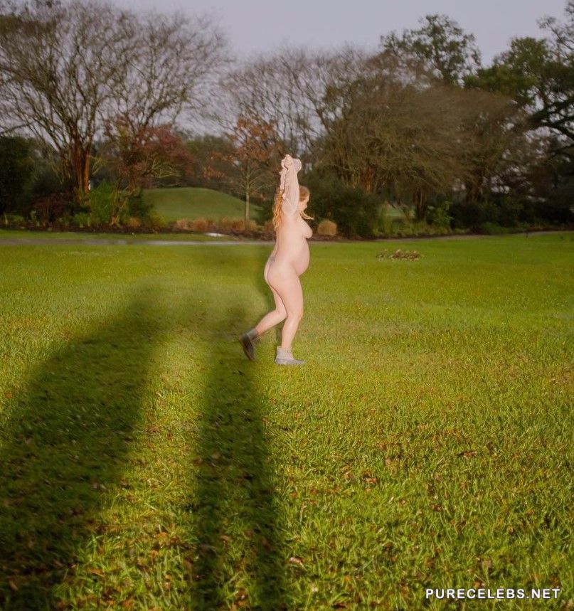 American actress Amy Schumer wants to show everyone that she is pregnant and also boast about the changes in her wonderful body. So she not only shows off her huge juicy boobs in her bra but also decided to make an absolutely nude photo session. Celebrity runs on a green field, completely naked, and we can enjoy the view and her huge beautiful melons and her peachy posterior.