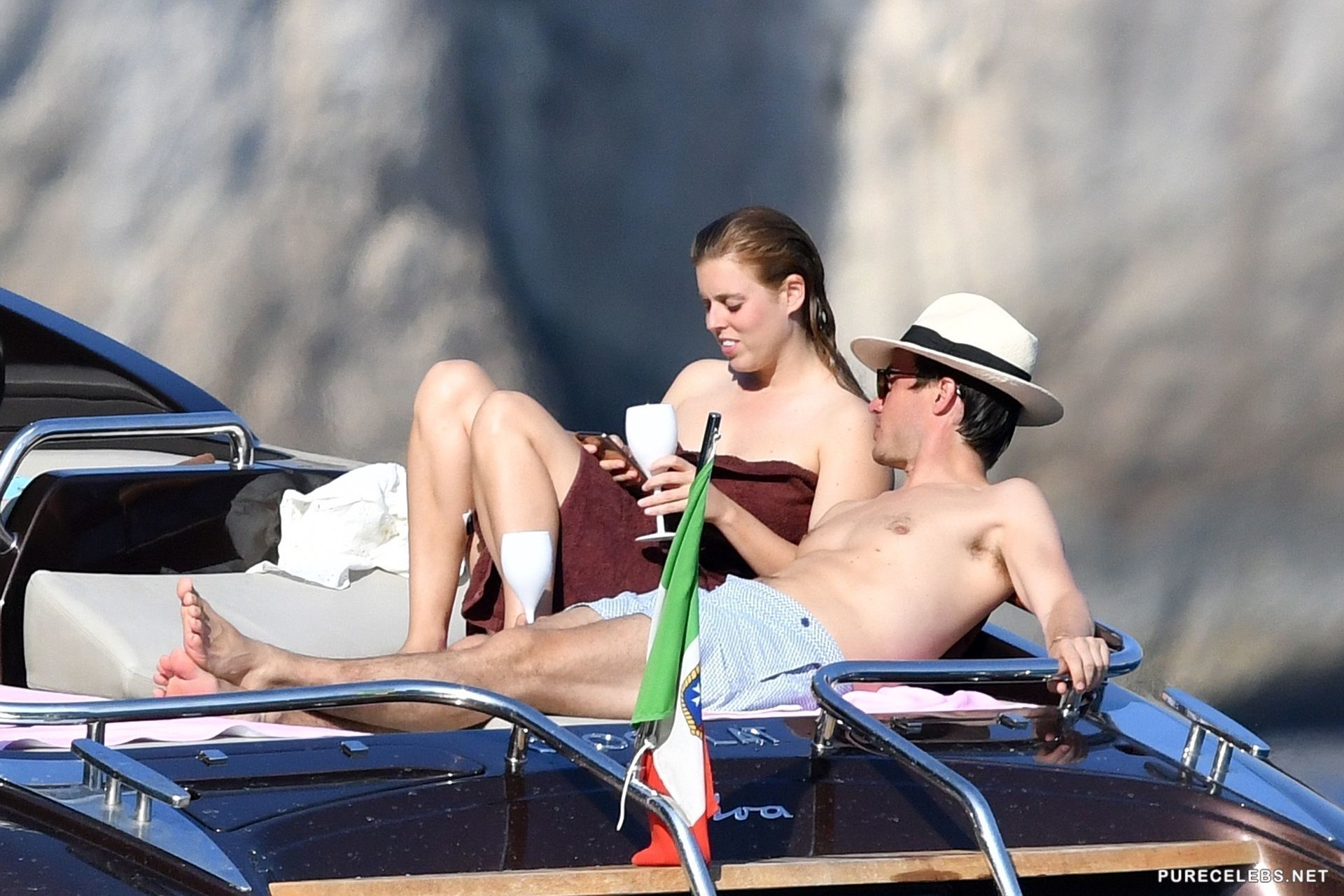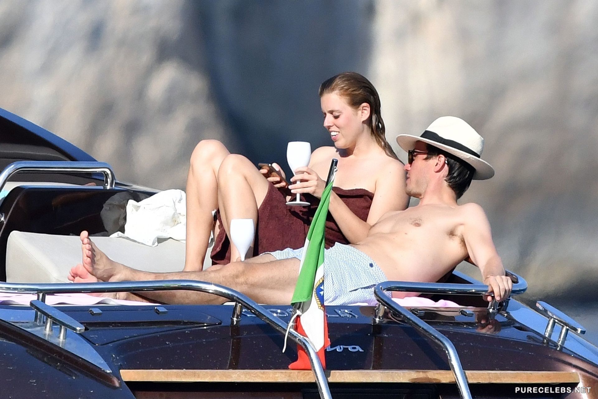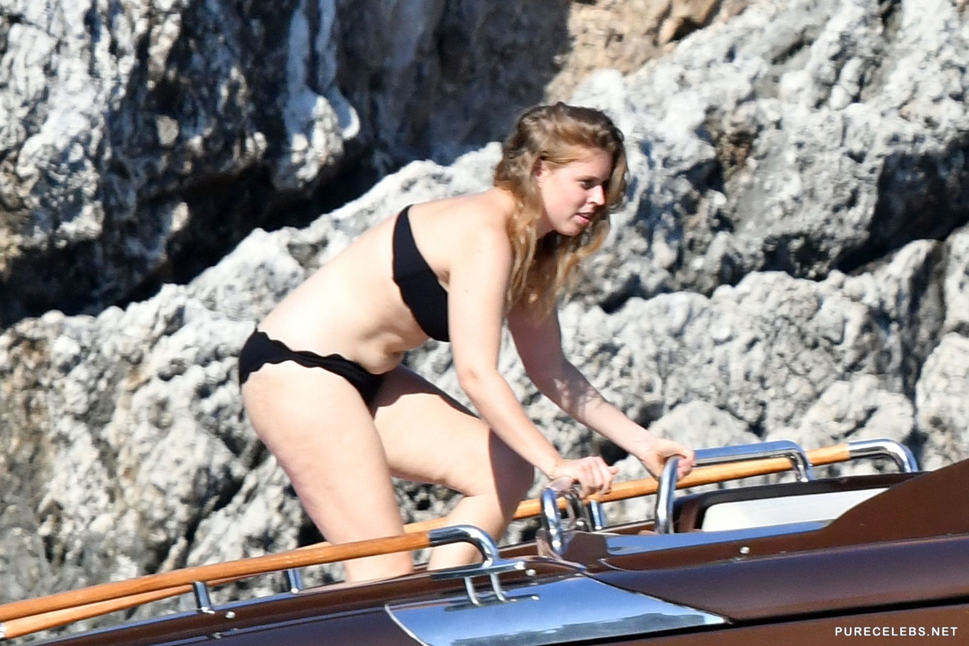 No matter how hard Princess Beatrice Of York tries to hide from prying eyes, nimble paparazzi find her everywhere. Recently she was photographed when she was relaxing on a boat. The celebrity was wearing a small black bikini, whose bra barely covered her awesome boobs. But the most piquant moment was the one when the girl decided to straighten her panties and lowered them down, exposing part of her wonderful booty.