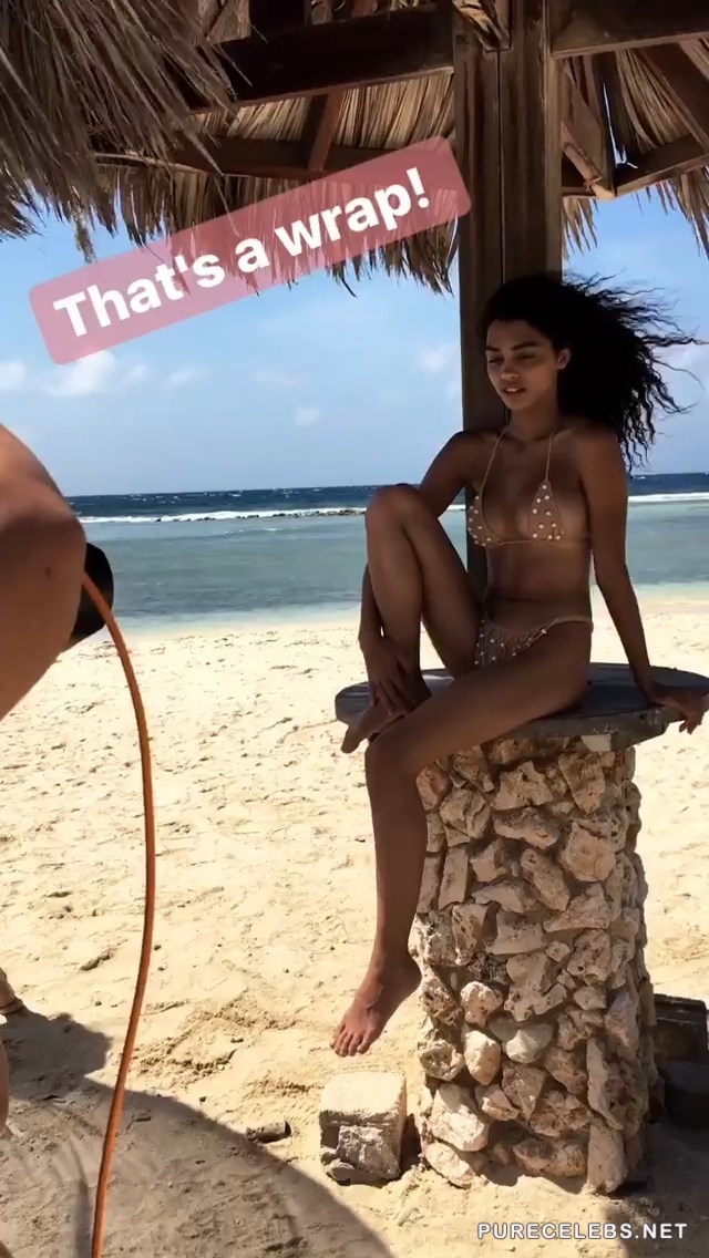 Raven Lyn is a glamour model, she has done campaigns for G-Star Raw, Nike and the Gap. This elegant dark skinned beauty with athletic body is muse of many photographers and in these pictures you can see why. She is posing on a beach wearing a tight skimpy bikini, that accentuates her hot body, natural big boobs and amazing but with long legs. Her charismatic face and dark hazel eyes are definition of beauty.