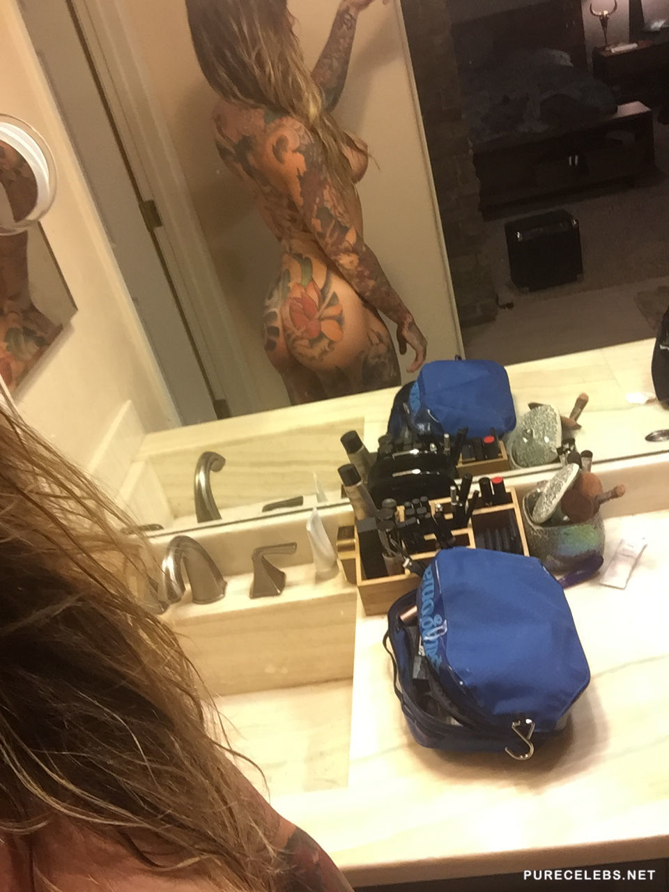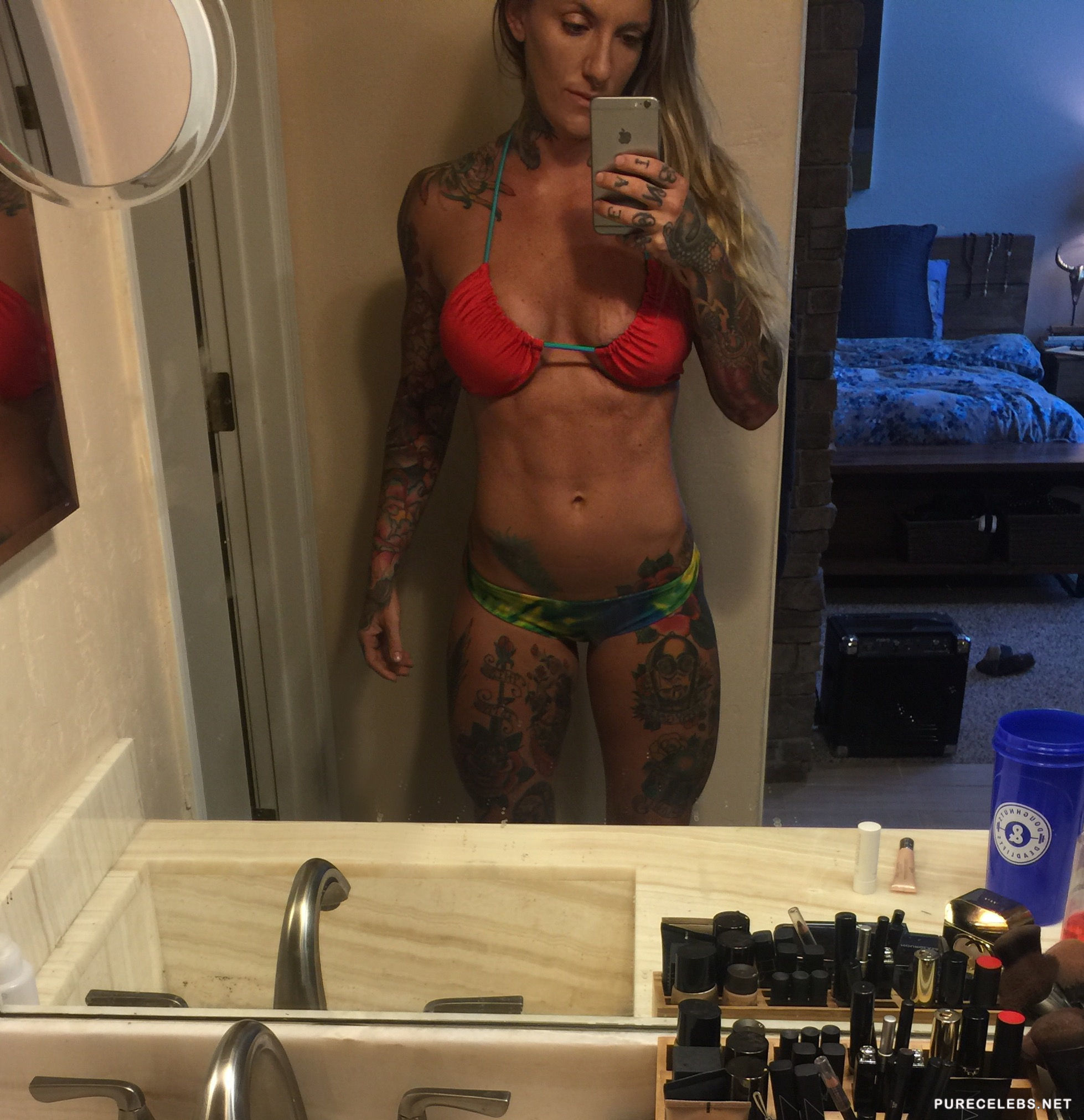 Reality star Krissy Mae Cagney is known for her numerous tattoos and bad ass attitude in TV appearances. This spunky brunette loves two things, tattoos and taking photos of herself naked. Her most recent tattoo is one on her right ass cheek and now her body is almost completely covered in tattoos. The only part remaining clean is her tight stomach and her massive breasts. Krissy also posed naked on the beach with a girlfriend.