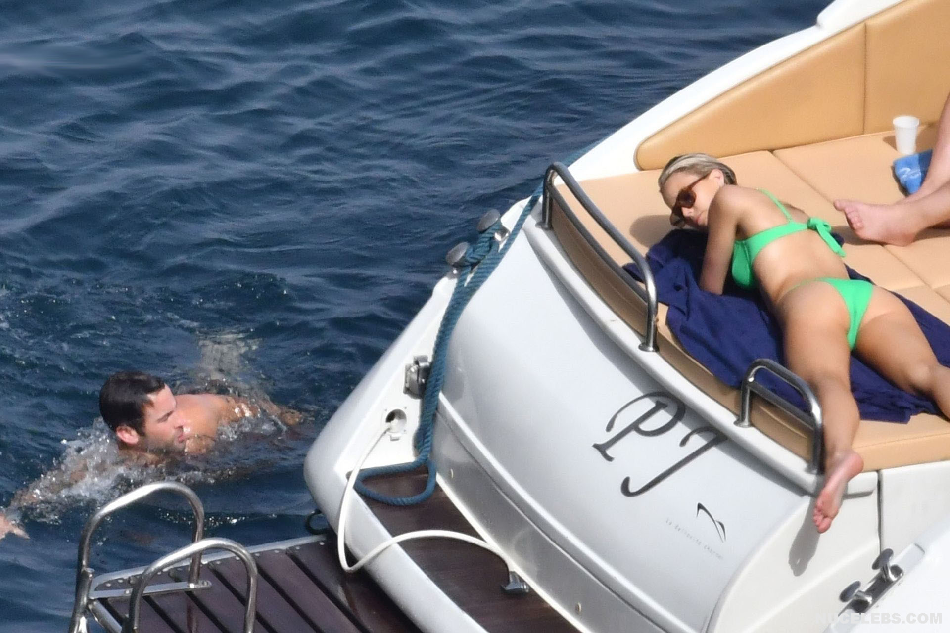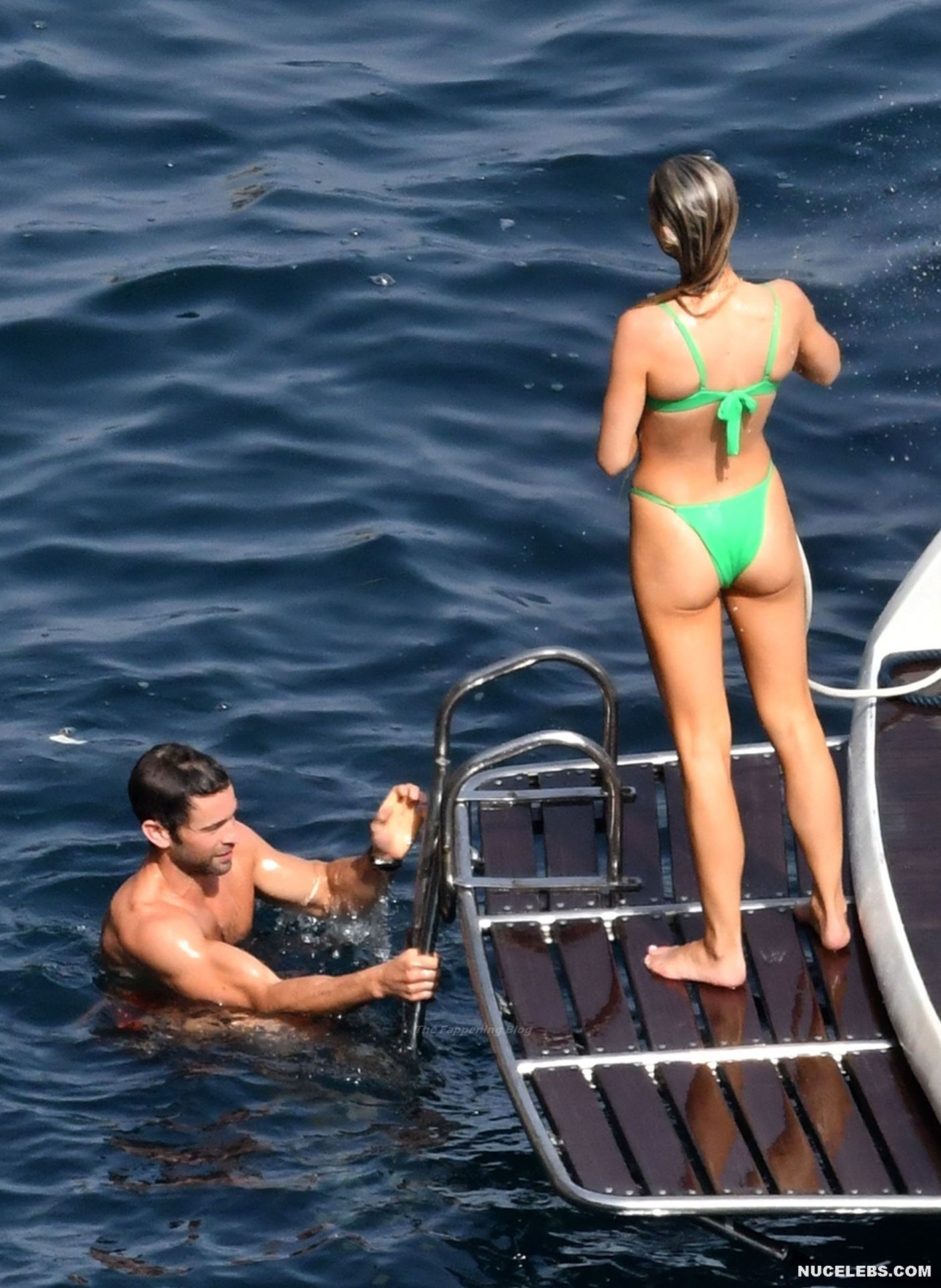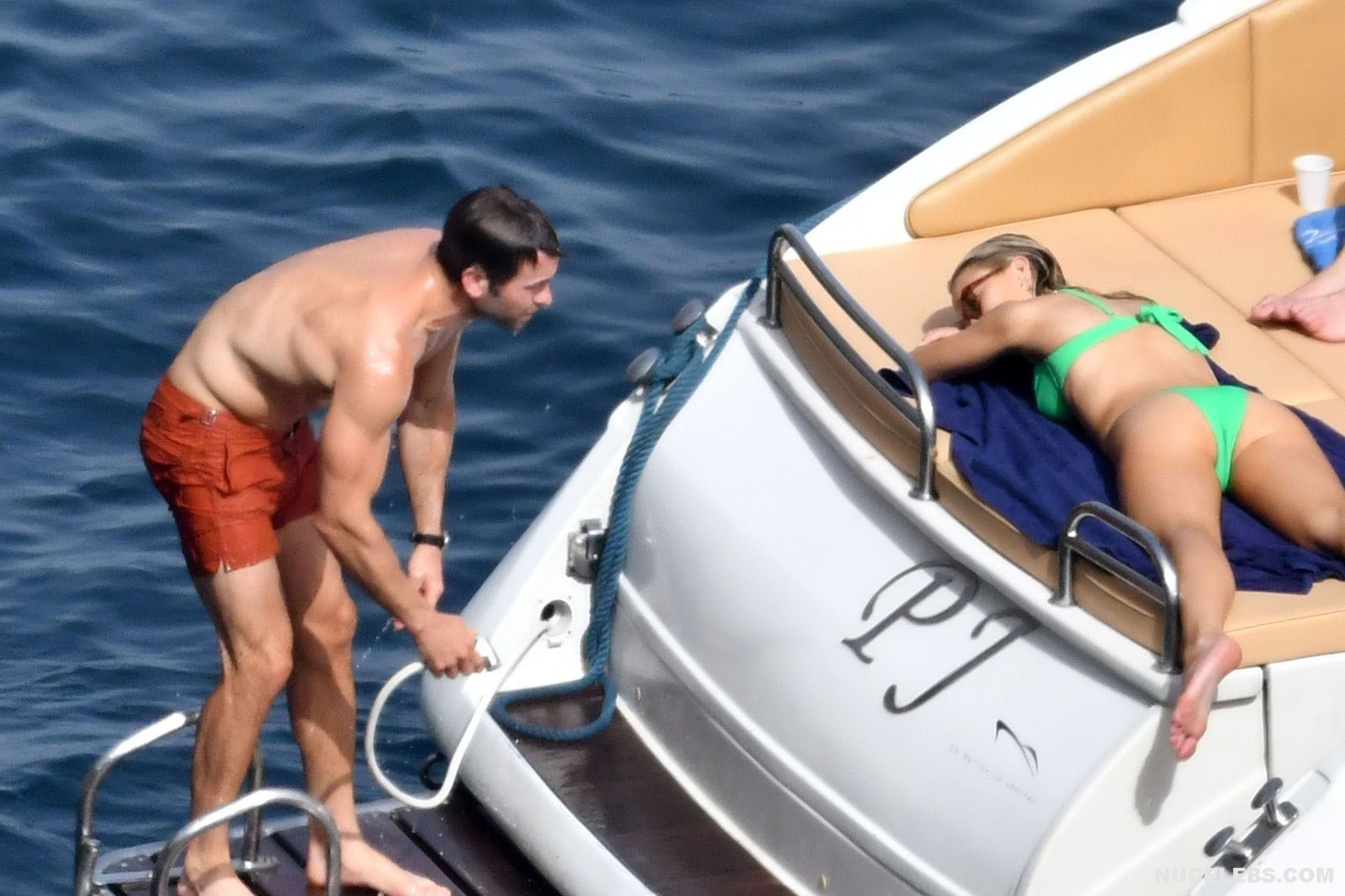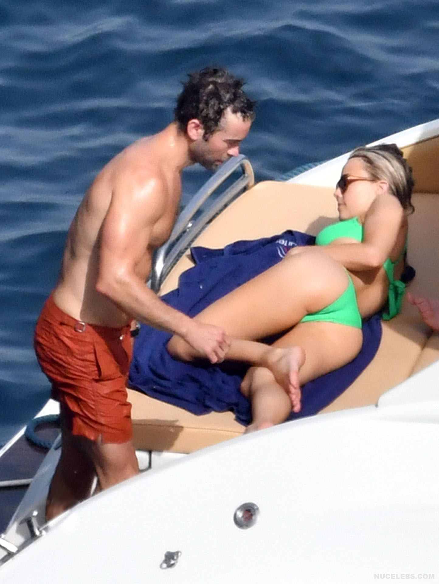 Turns out American actress Rebecca Rittenhouse is an incredibly hot babe! The paparazzi took great pictures of this celebrity from her vacation on a yacht. It is a pity, of course, that Rebecca Rittenhouse did not sunbathe there completely nude. However, this celebrity was wearing such a petite green bikini that it barely hid her gorgeous body. The green panties were so tight in front they barely covered Rebecca Rittenhouse’s nude pussy. And her boobs were too big for her bra and they seemed to pop out of it when she bent over.