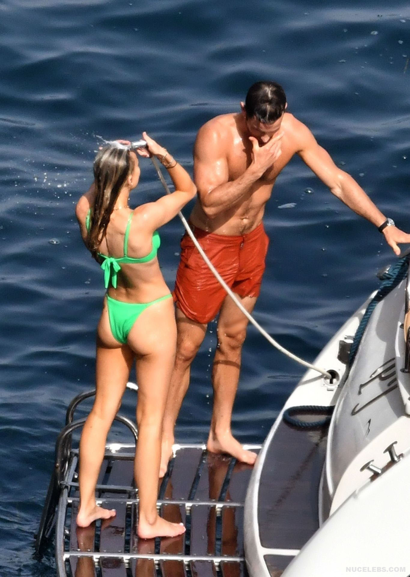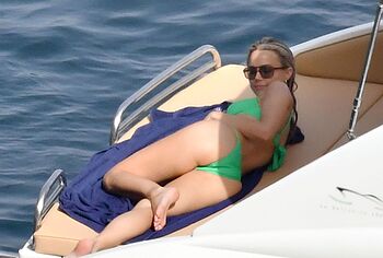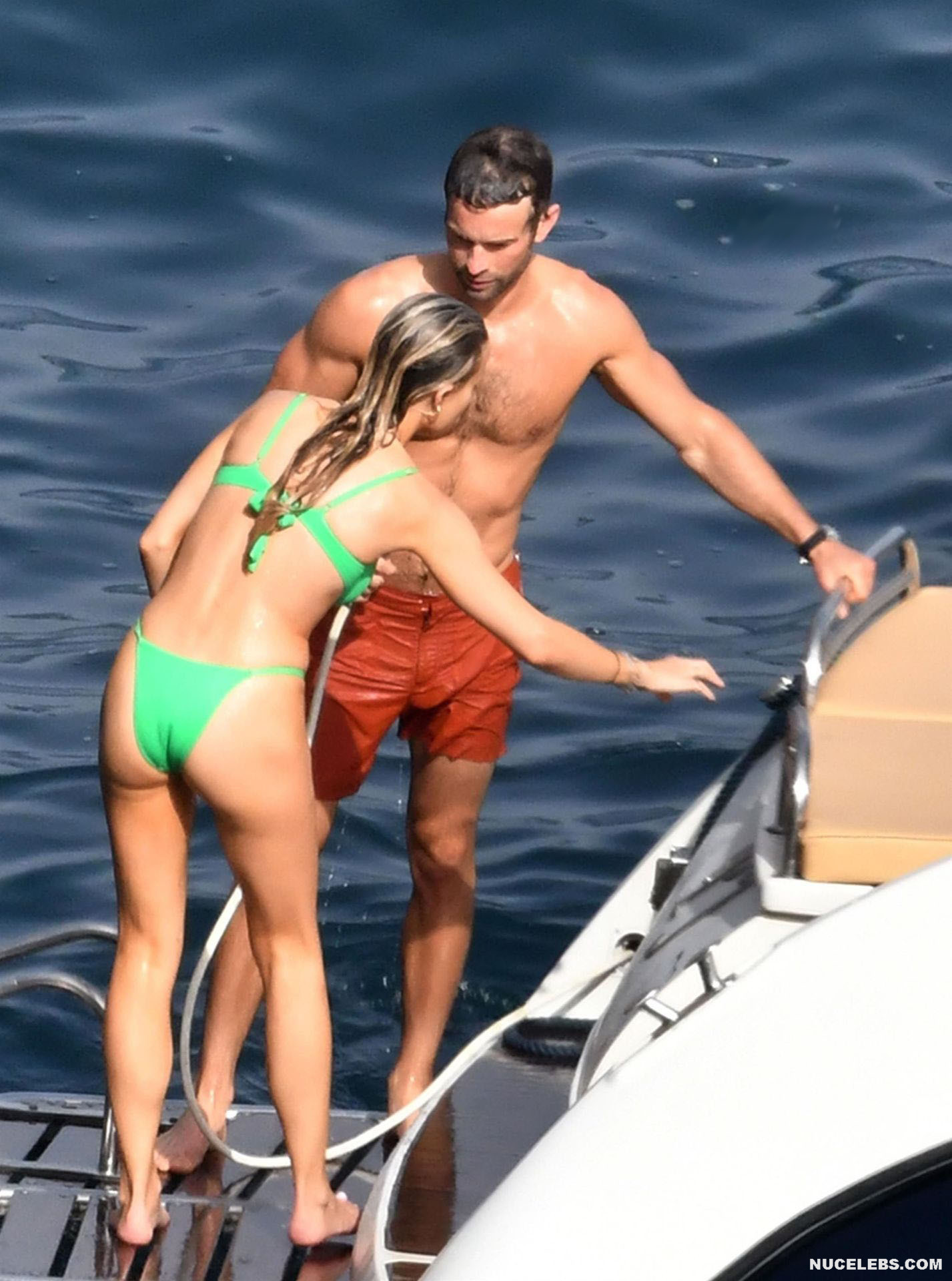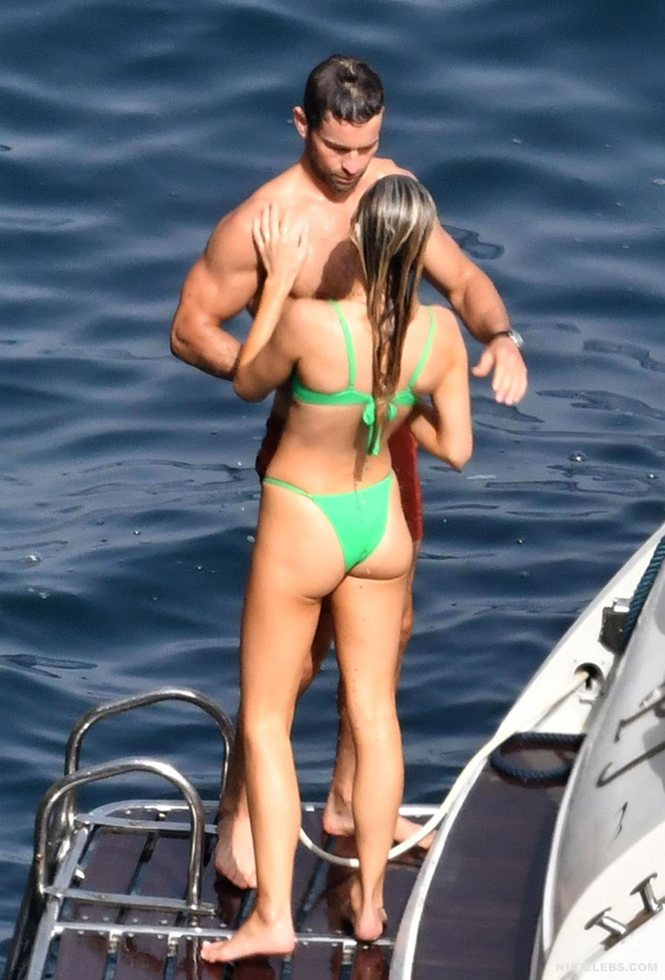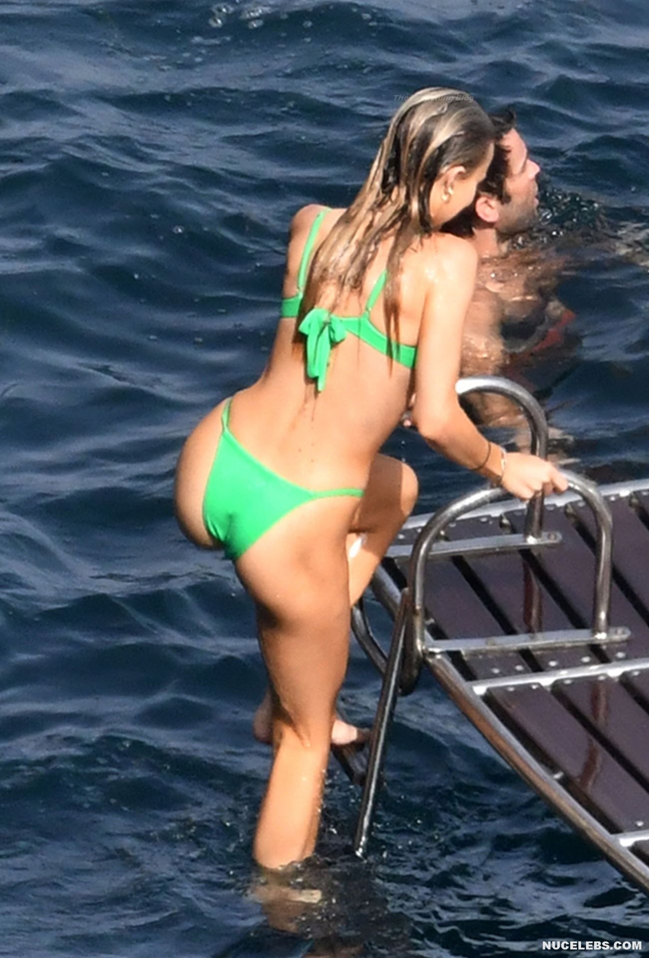 Turns out American actress Rebecca Rittenhouse is an incredibly hot babe! The paparazzi took great pictures of this celebrity from her vacation on a yacht. It is a pity, of course, that Rebecca Rittenhouse did not sunbathe there completely nude. However, this celebrity was wearing such a petite green bikini that it barely hid her gorgeous body. The green panties were so tight in front they barely covered Rebecca Rittenhouse’s nude pussy. And her boobs were too big for her bra and they seemed to pop out of it when she bent over.