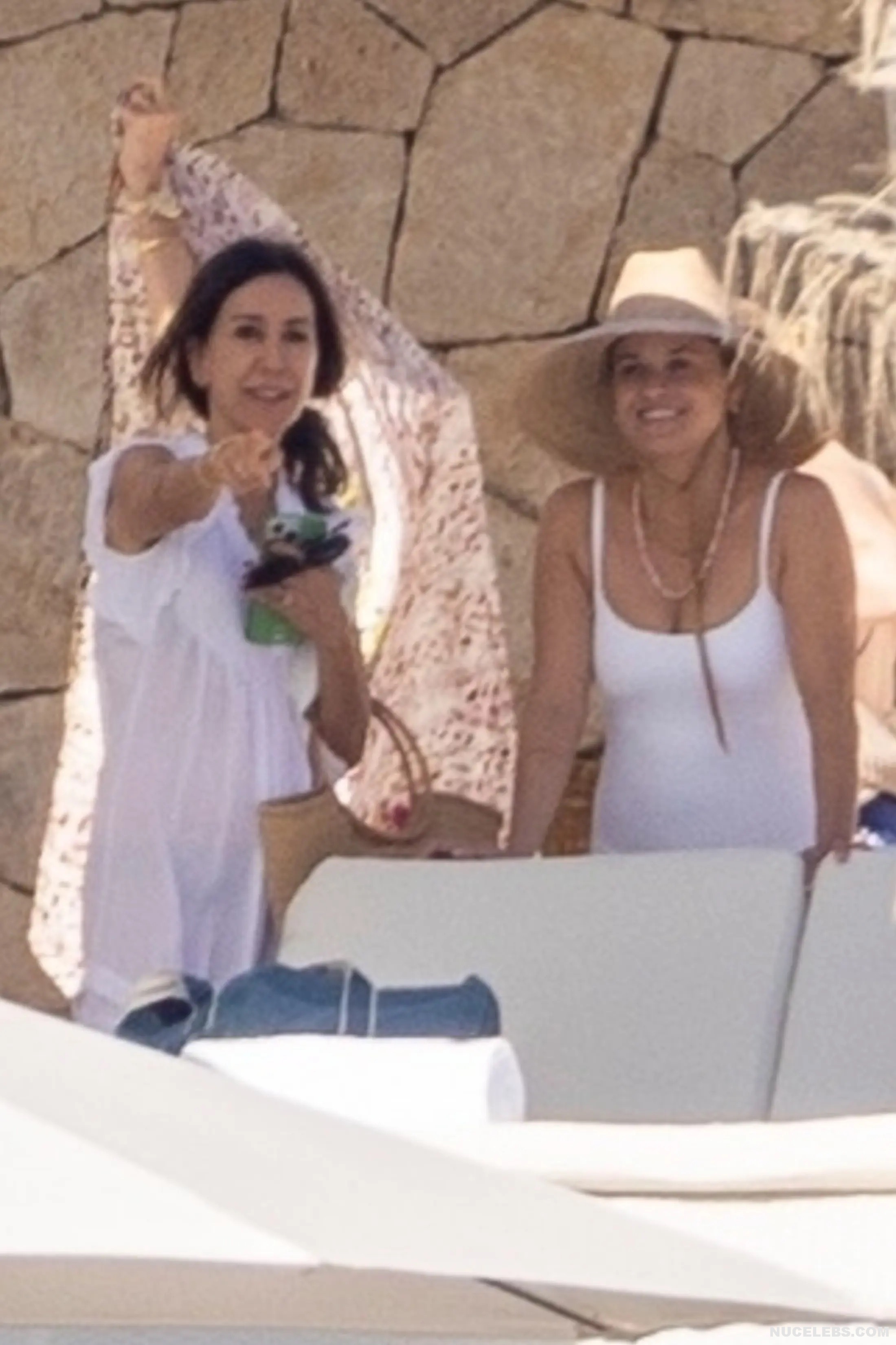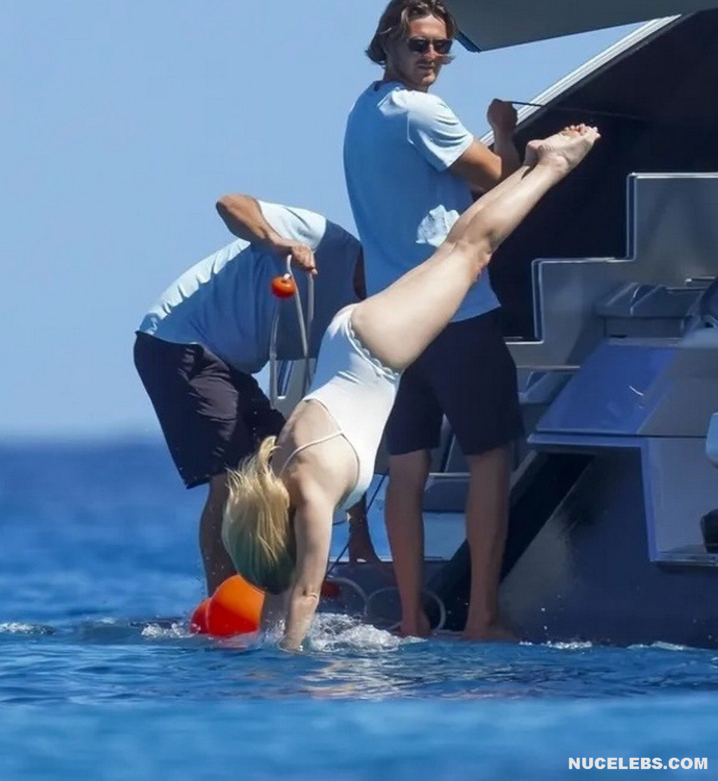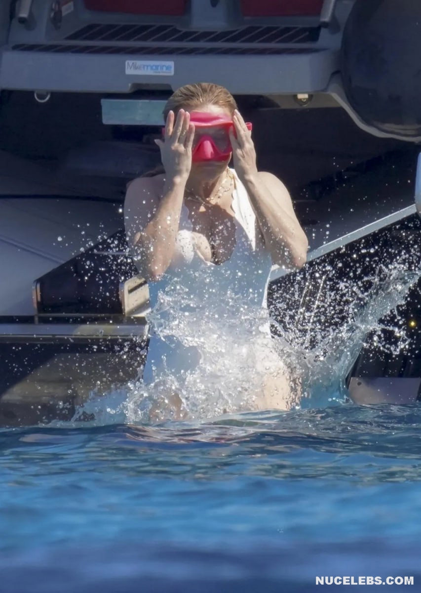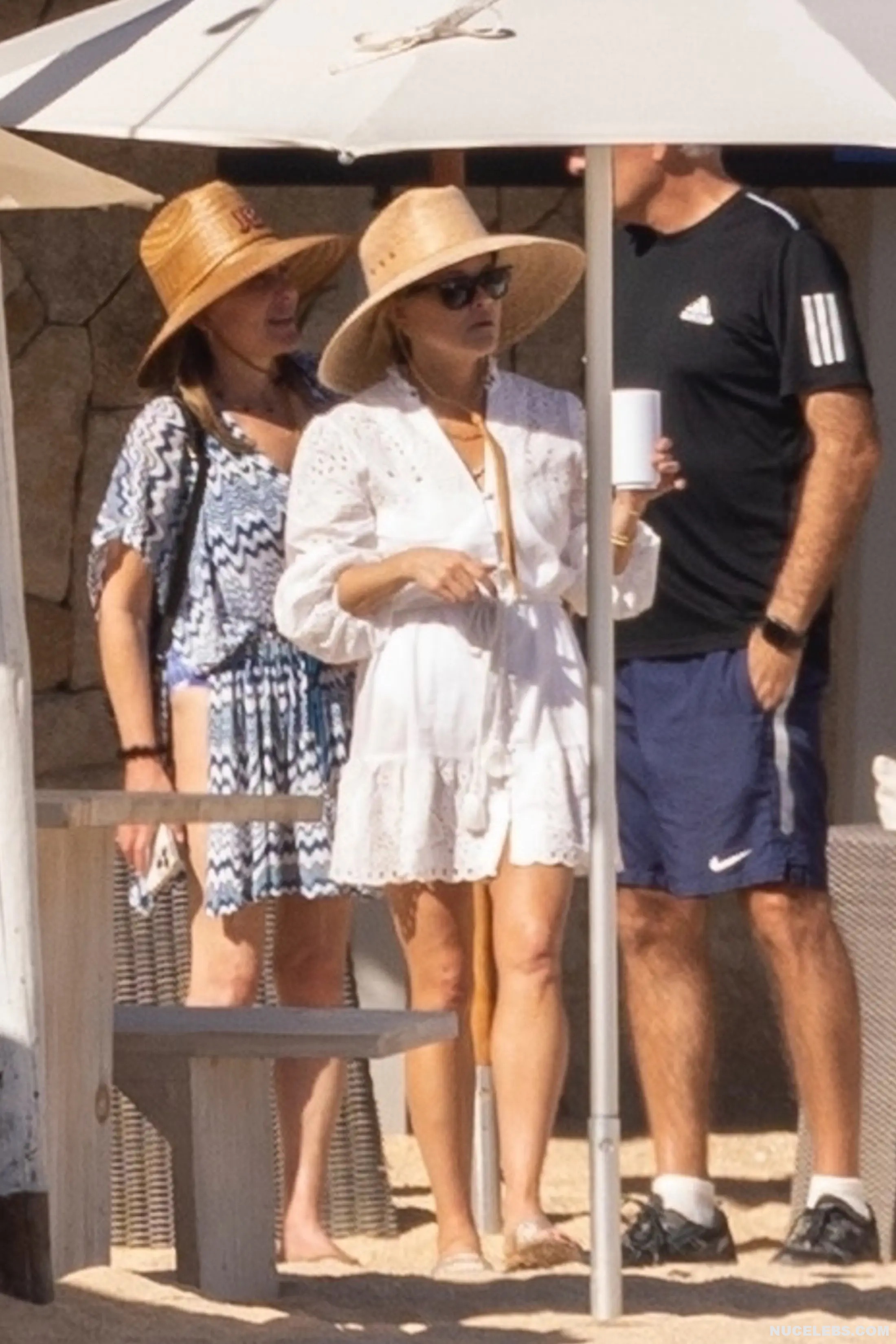 Let’s follow Reese Witherspoon a little bit during her beach vacation. This Hollywood actress in a white swimsuit looked so happy splashing in the water. The fabric got wet and Reese Witherspoon’s boobies with poking nipples were showing through in a damn tempting way. By the way, the cut of her swimsuit was quite deep and the chances of her wonderful breasts slipping out were also quite high!
