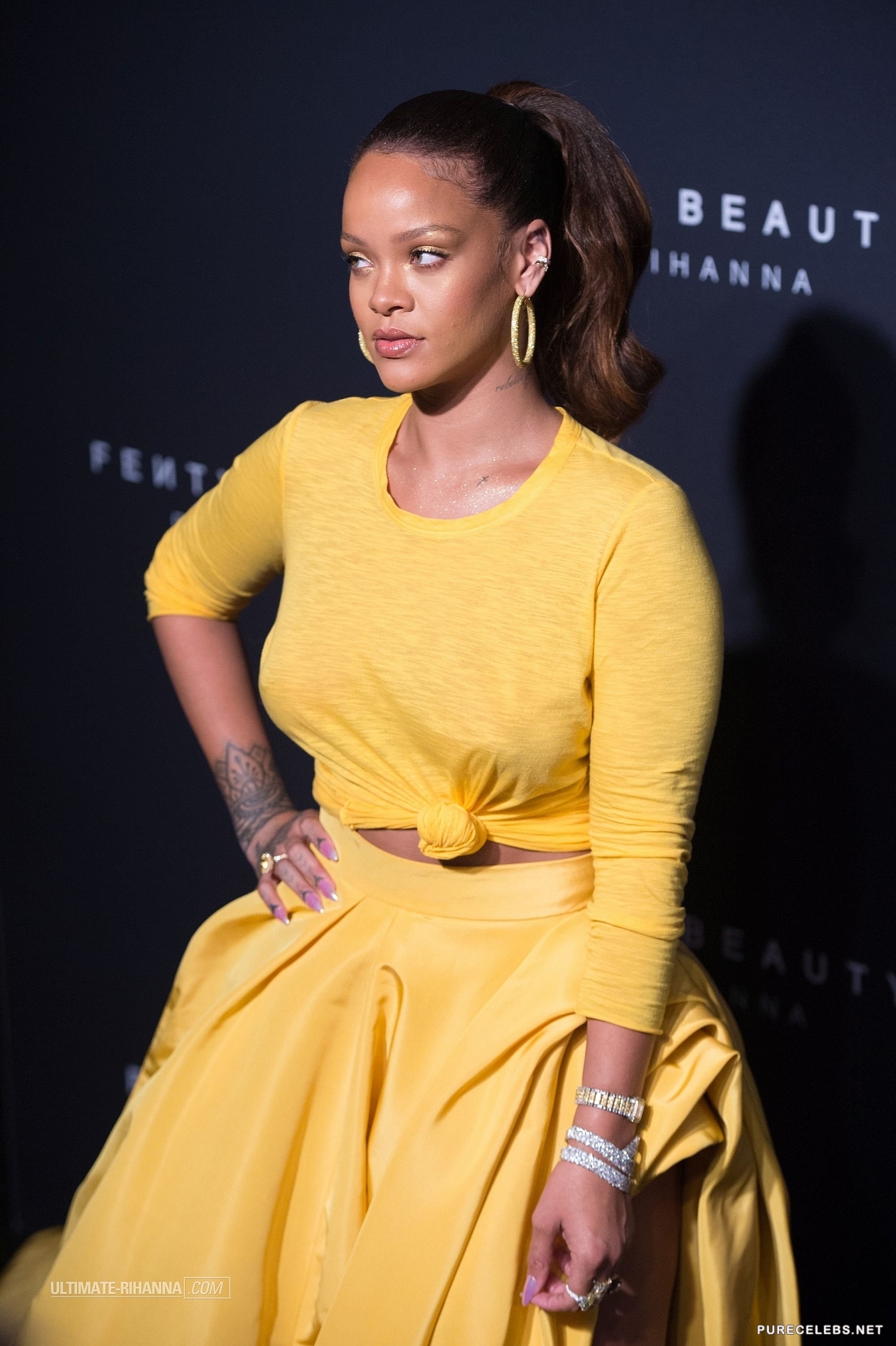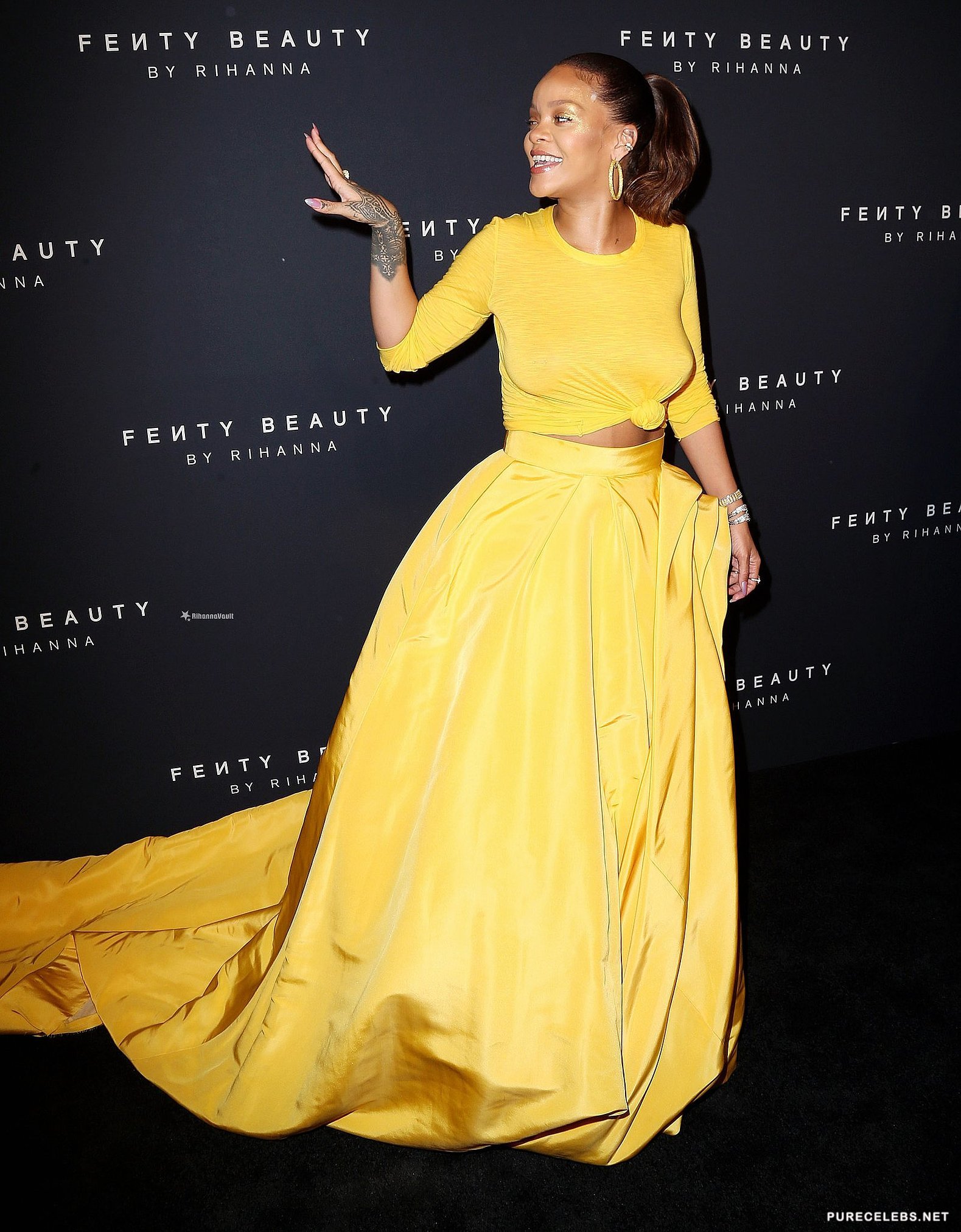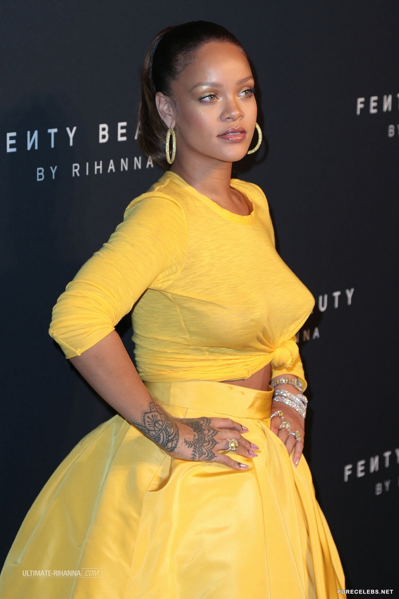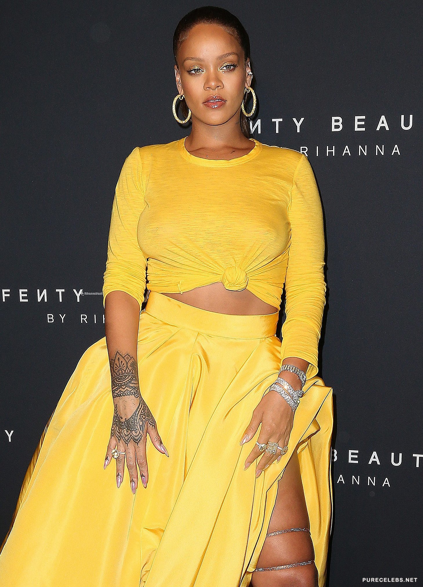 Rihanna is well-known by the public for her provocative lyrics and outfits. This time she didn’t disappoint fans by showing up to her make-up line launch in a stunning sheer yellow dress. The skin tight outfit perfectly showcased the curves of her bust as well as her backside. Paparazzi photographers were eager to snap a shot of her gorgeous breasts and the outline of her nipples peeking through her tight top.