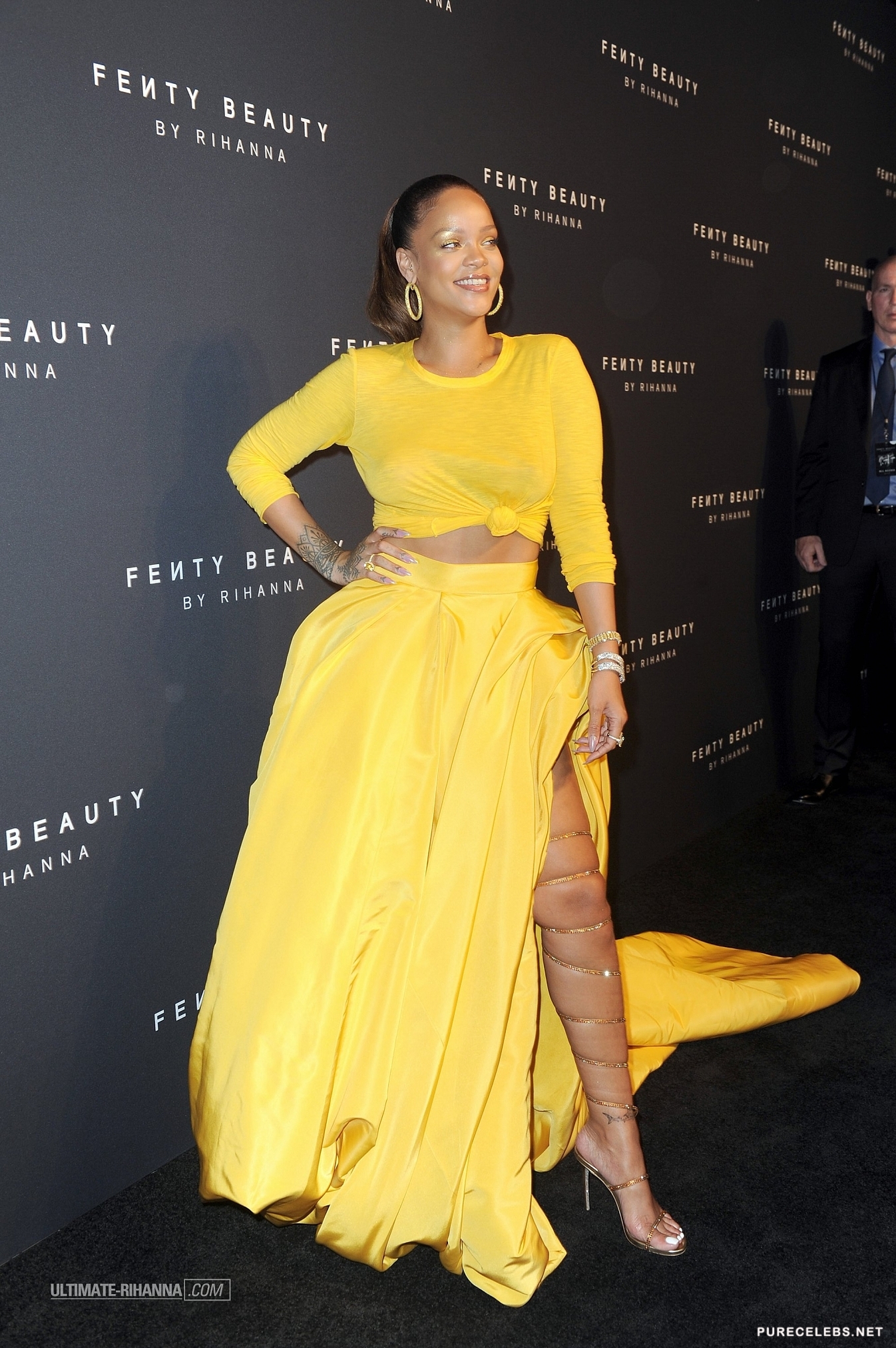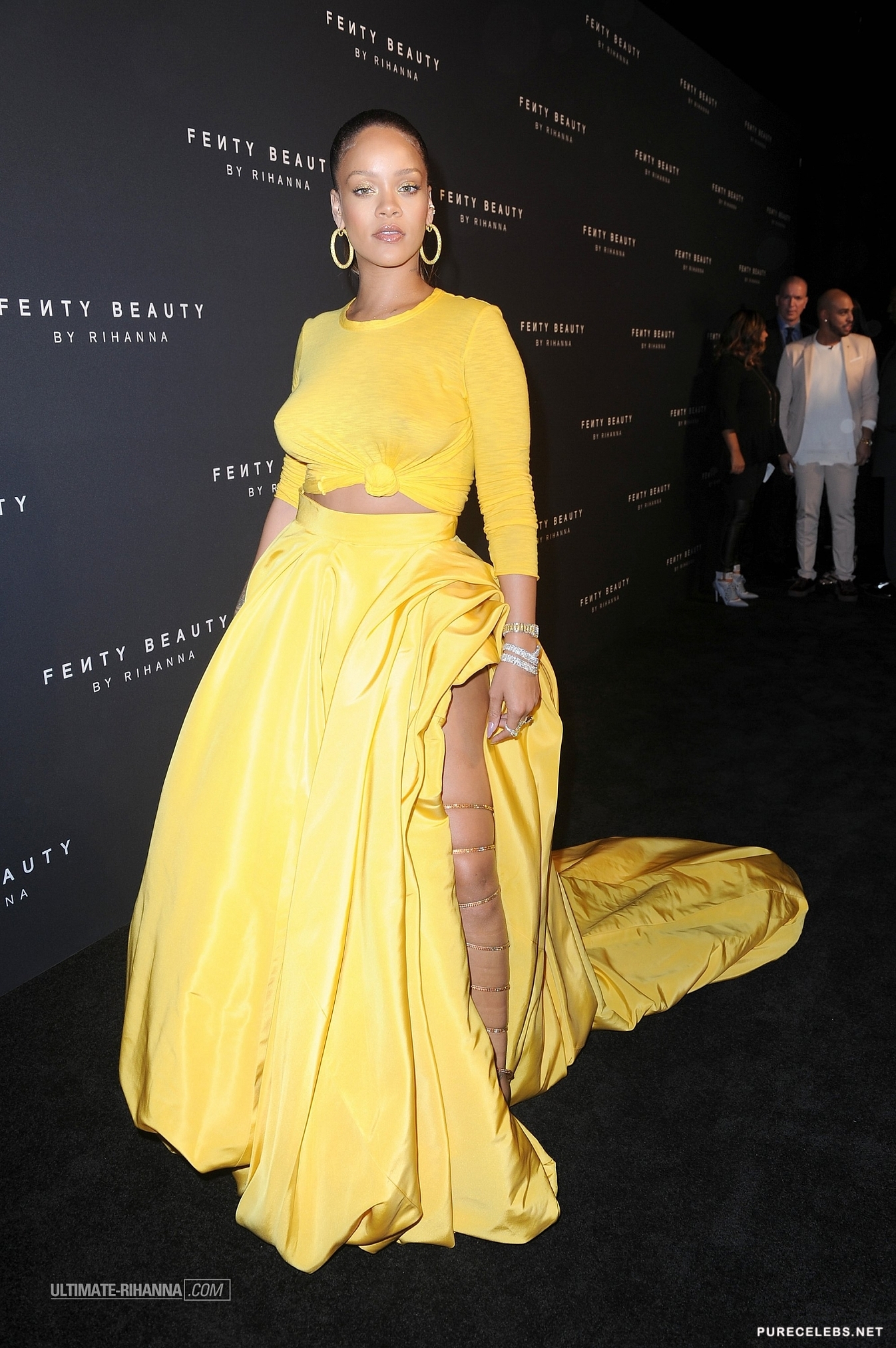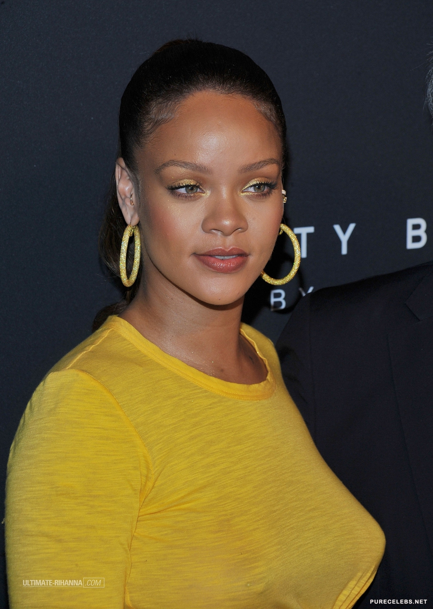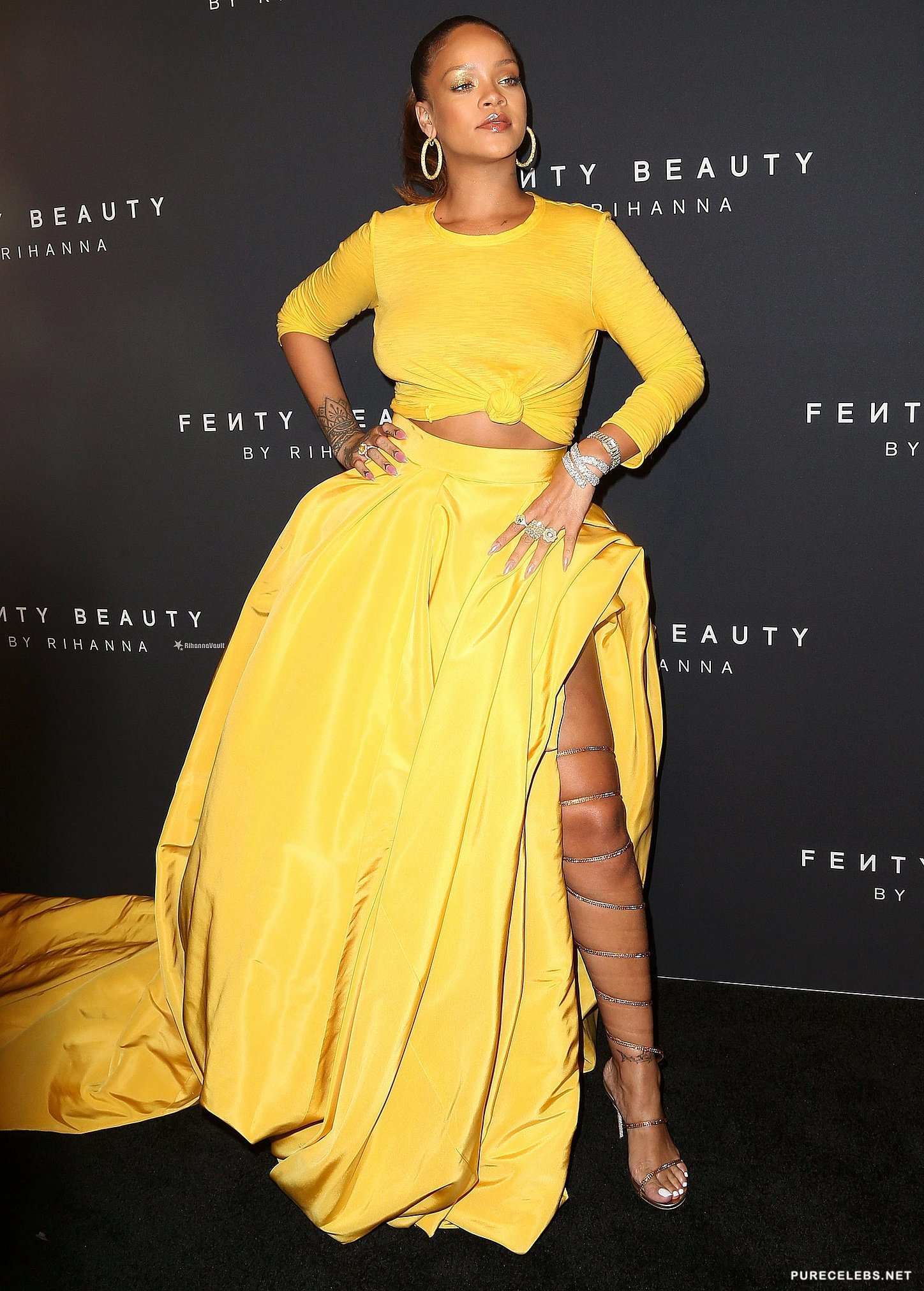 Rihanna is well-known by the public for her provocative lyrics and outfits. This time she didn’t disappoint fans by showing up to her make-up line launch in a stunning sheer yellow dress. The skin tight outfit perfectly showcased the curves of her bust as well as her backside. Paparazzi photographers were eager to snap a shot of her gorgeous breasts and the outline of her nipples peeking through her tight top.