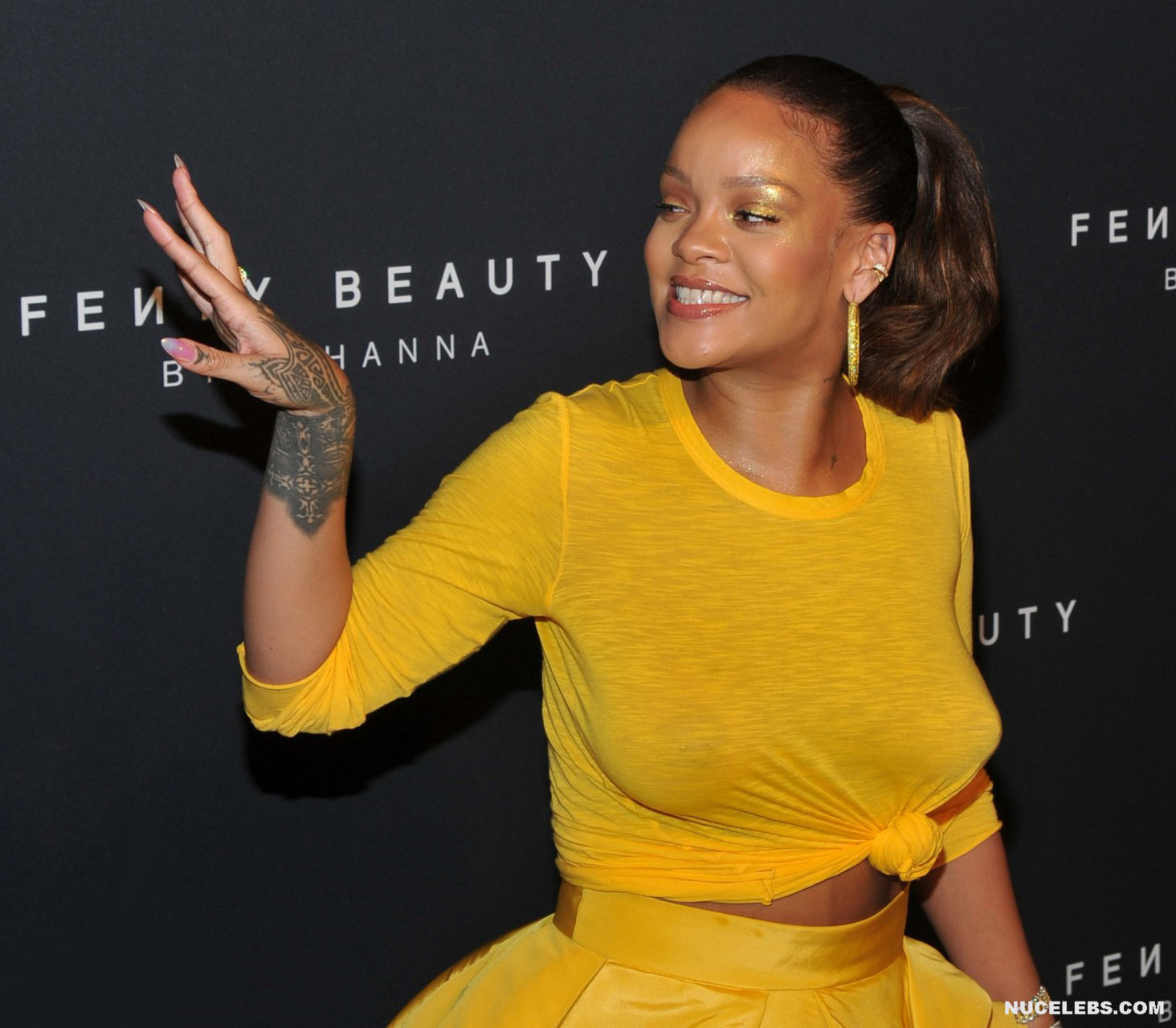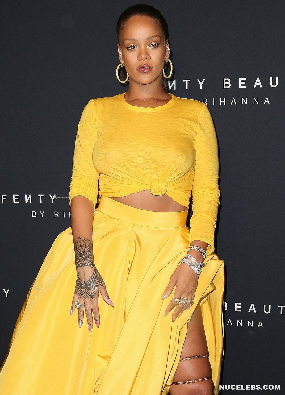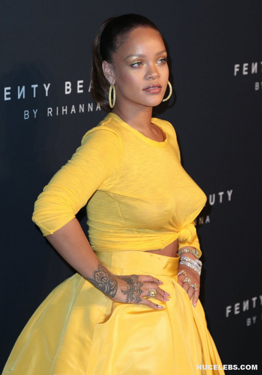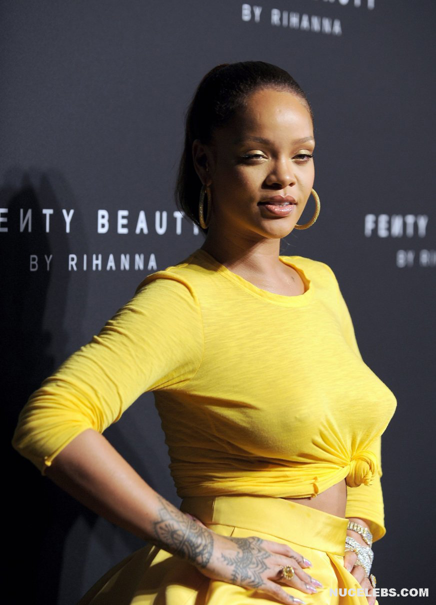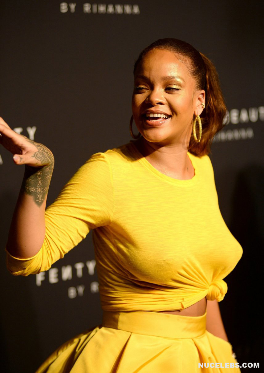 Rihanna loves to tease everyone with her almost nude tits during various events. For example, once this singer was photographed in a light T-shirt and yellow skirt. At what Rihanna was braless and her nude boobs with big nipples were visible through. Oh, how big they are! Then the celebrity changed the white T-shirt to a yellow one and her boobs remained seductive as well. Also at one of the events, Rihanna managed to show off her awesome almost nude posterior in a transparent black skirt.