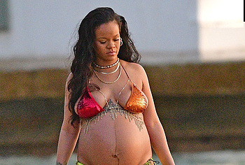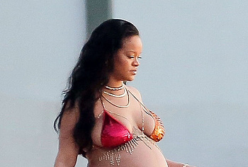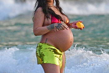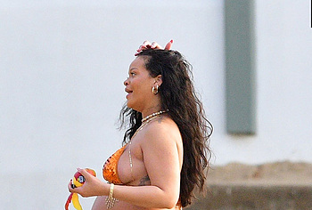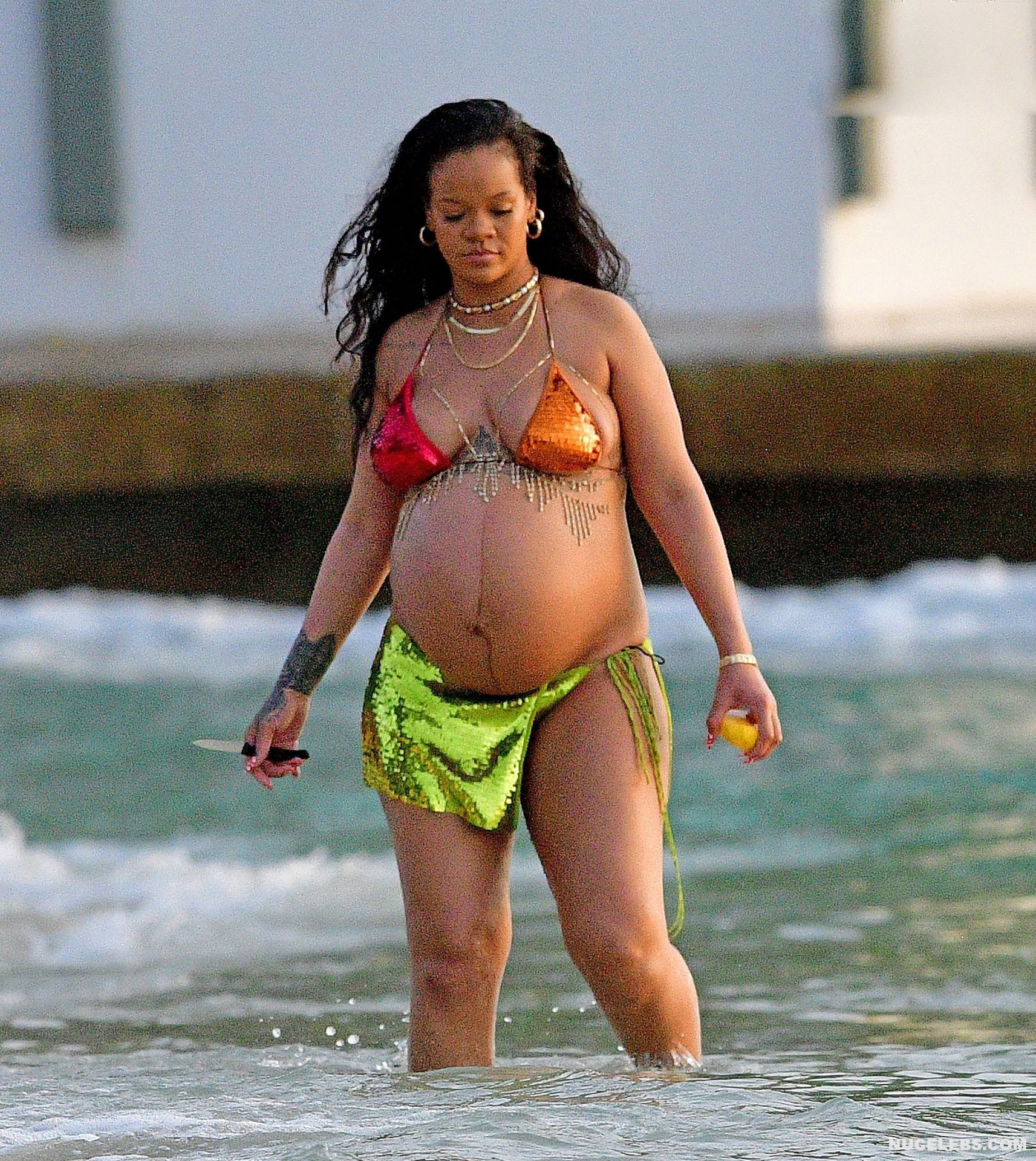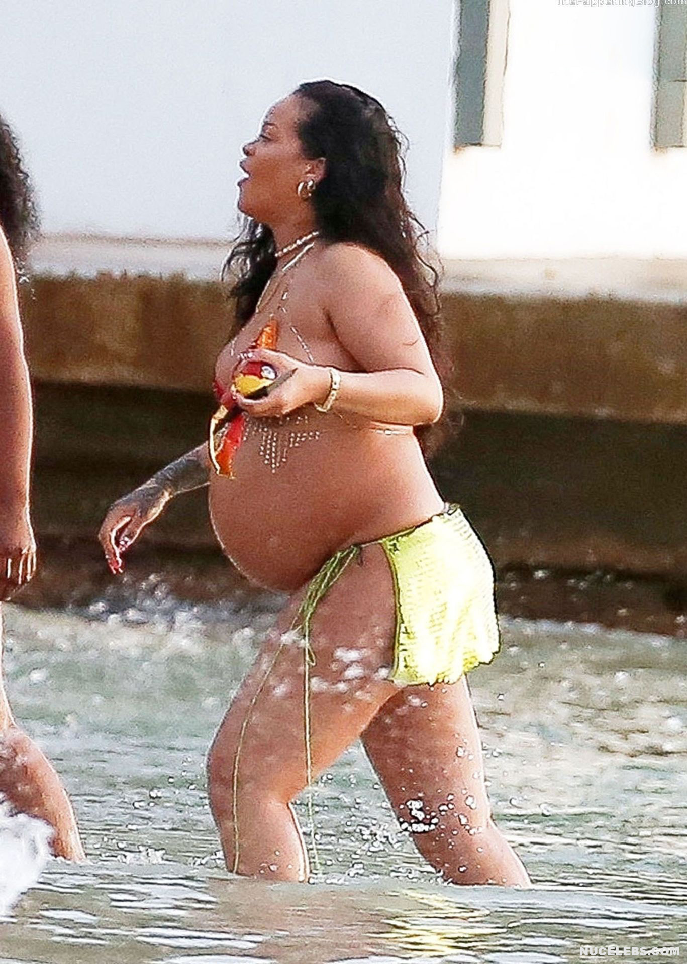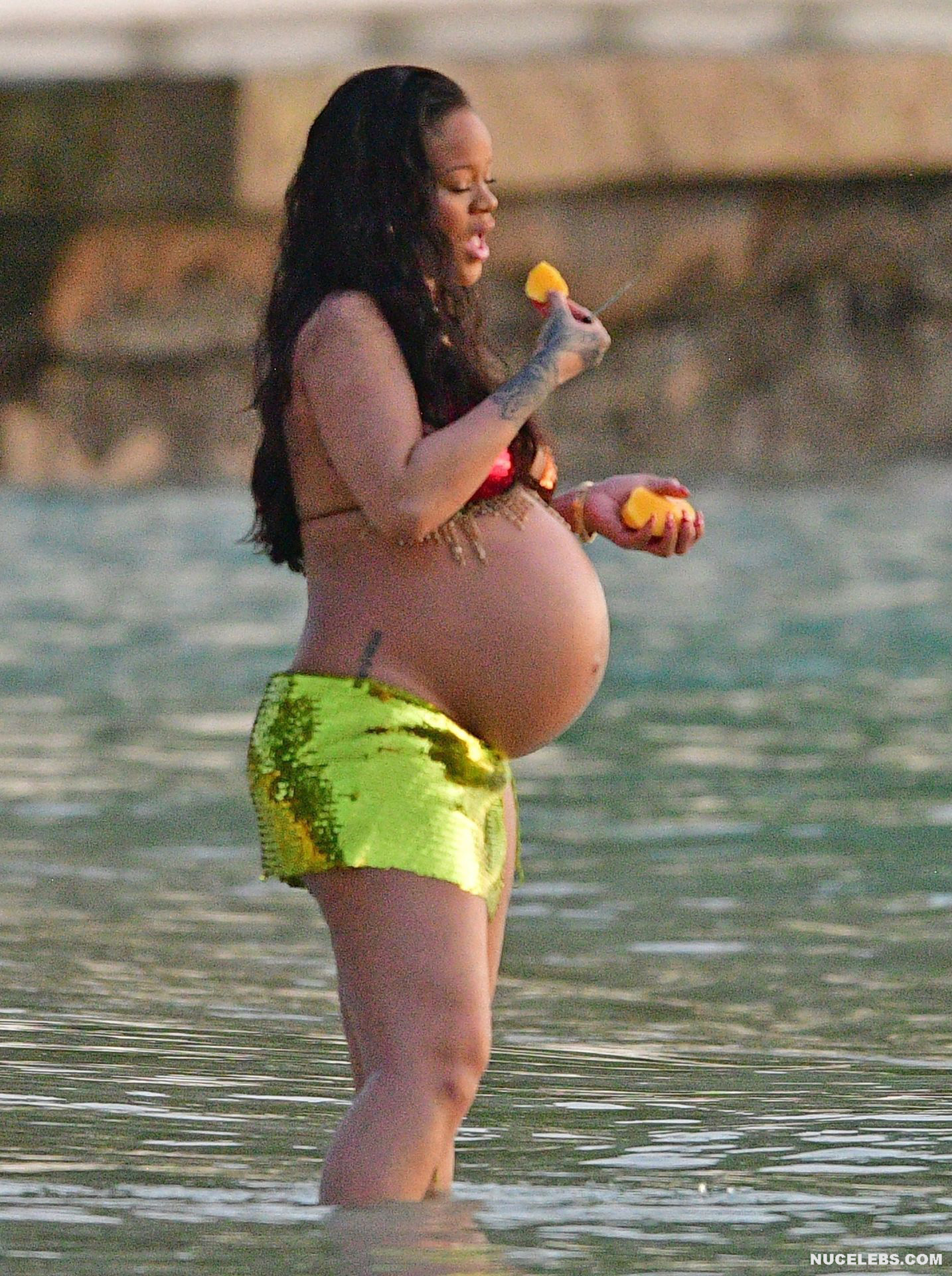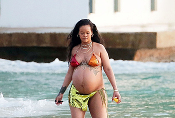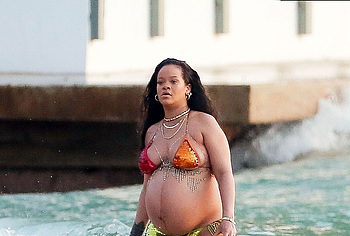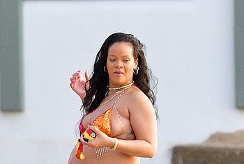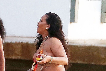 Rihanna manages to look incredibly seductive at any weight. This singer looked stunning during her maternity shoot, posing in a sparkly bikini. Her huge tits were almost jumping out of her bikini top, and the bottom only partially covered her big booty. This celebrity also has many photos in see-through outfits. For example, you will be delighted with Rihanna’s nude big tits showing through her black dress at one of the events!