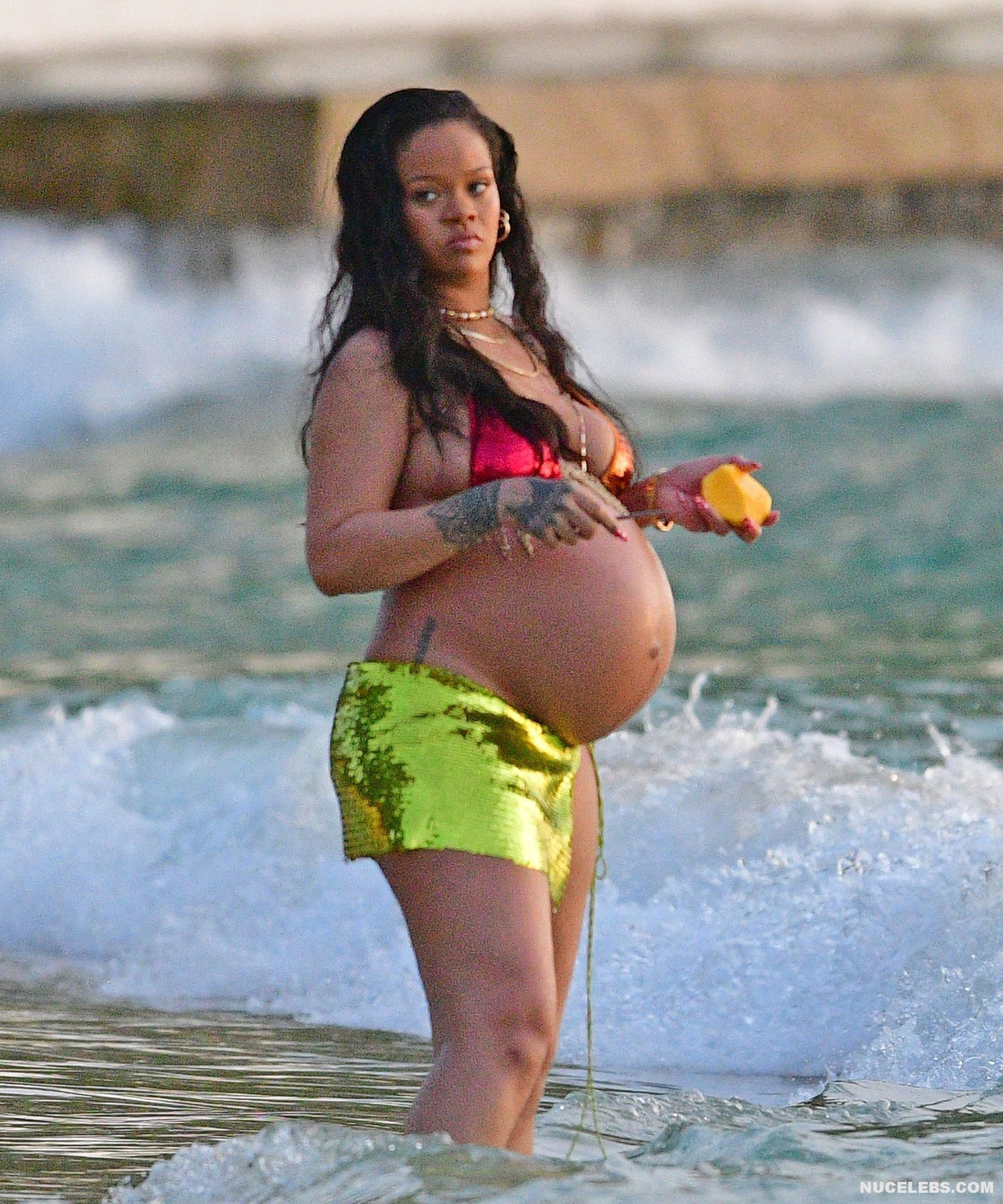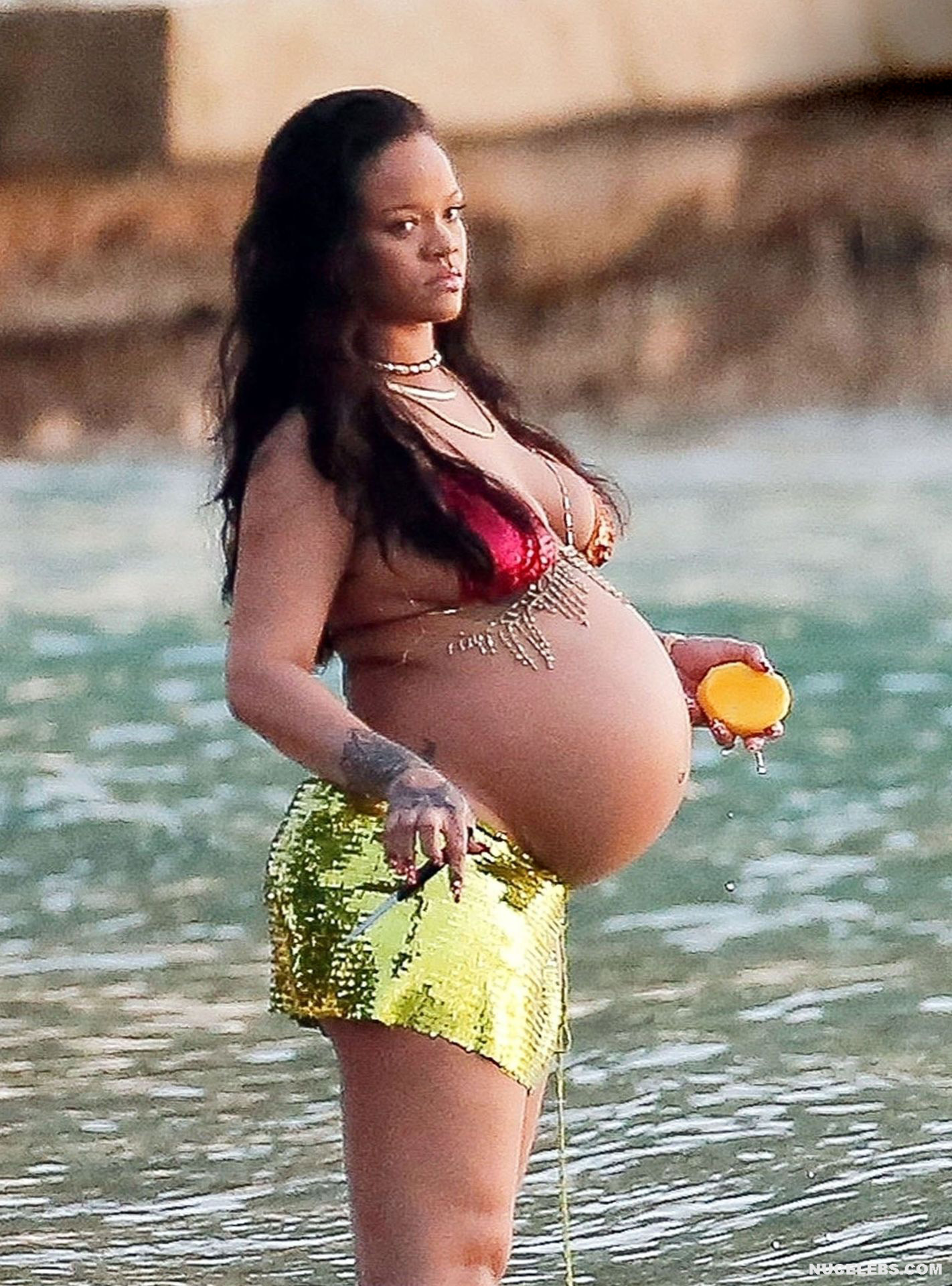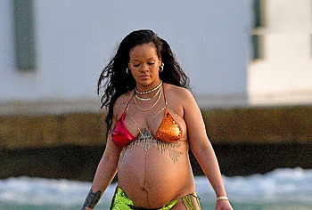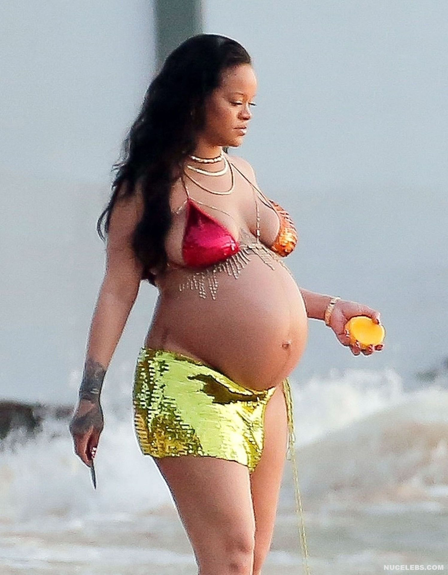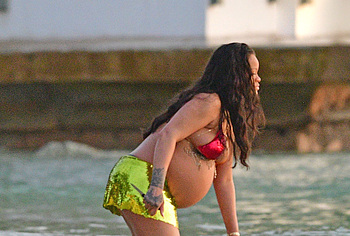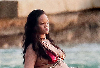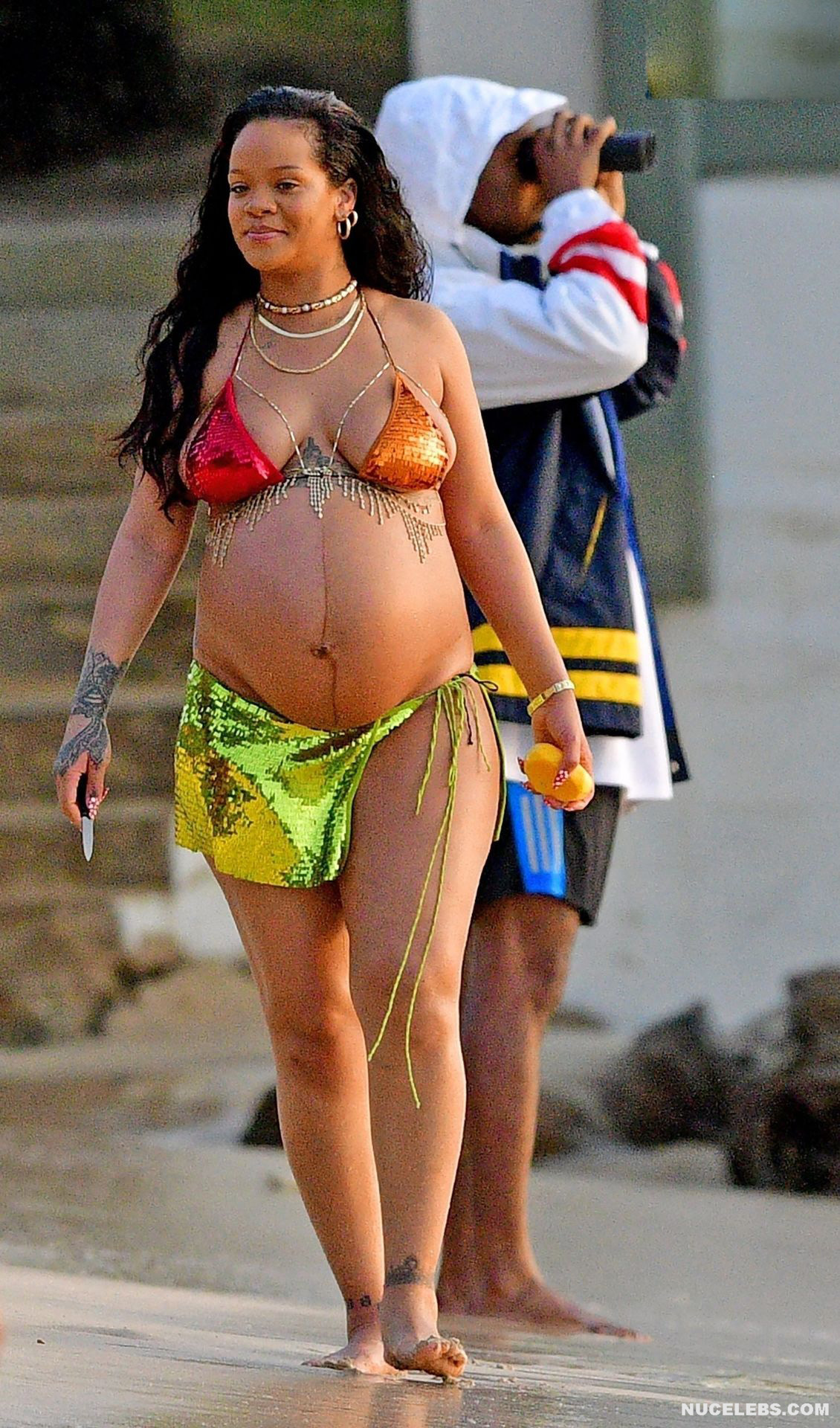 Rihanna manages to look incredibly seductive at any weight. This singer looked stunning during her maternity shoot, posing in a sparkly bikini. Her huge tits were almost jumping out of her bikini top, and the bottom only partially covered her big booty. This celebrity also has many photos in see-through outfits. For example, you will be delighted with Rihanna’s nude big tits showing through her black dress at one of the events!