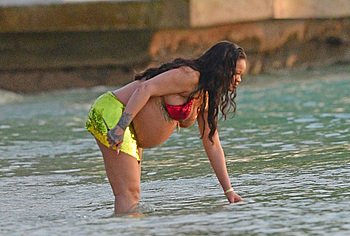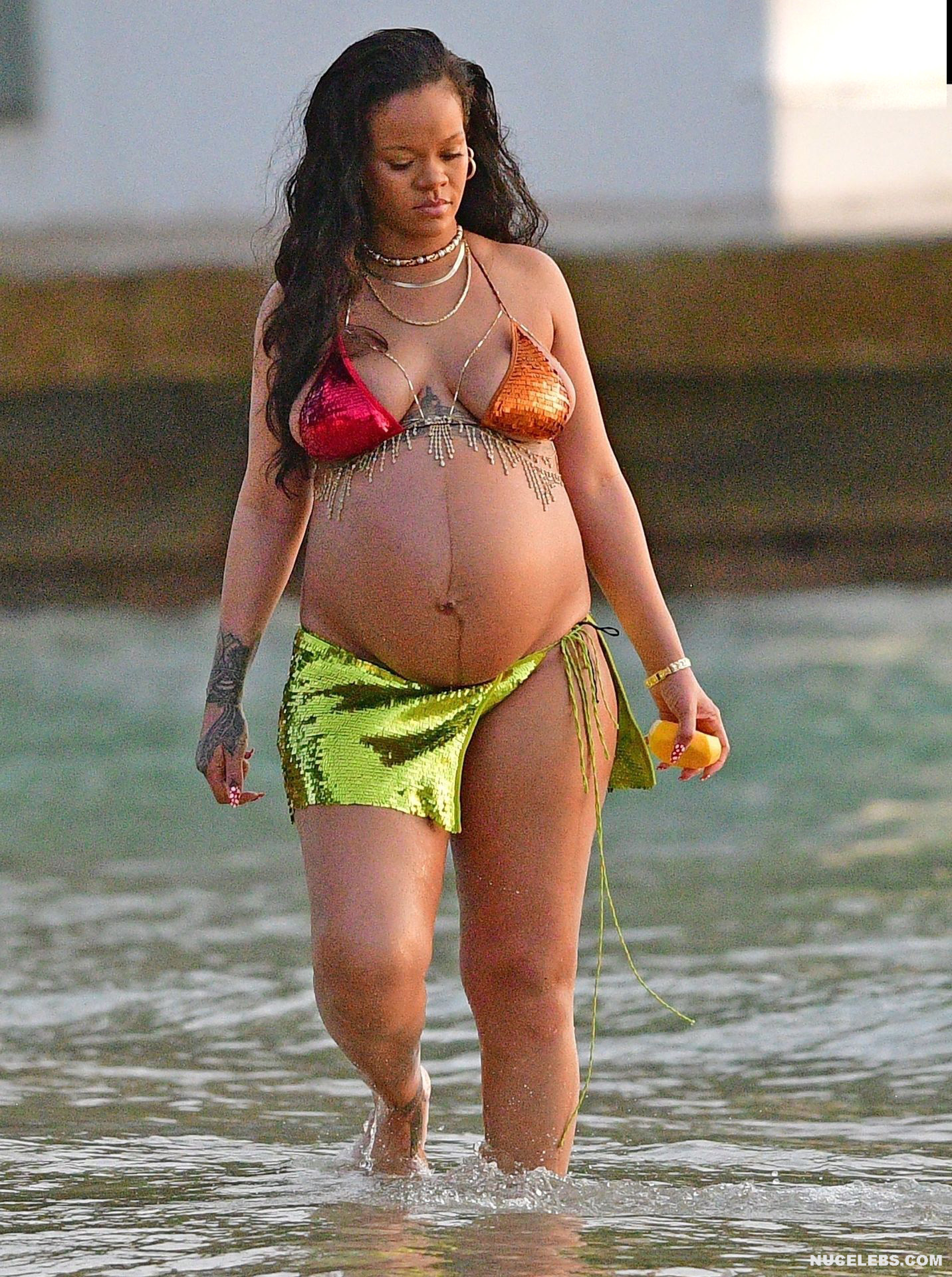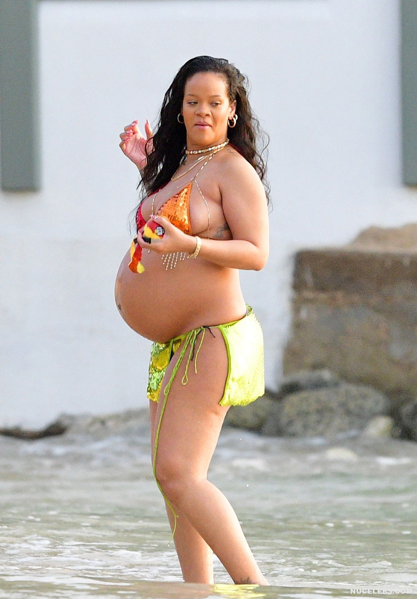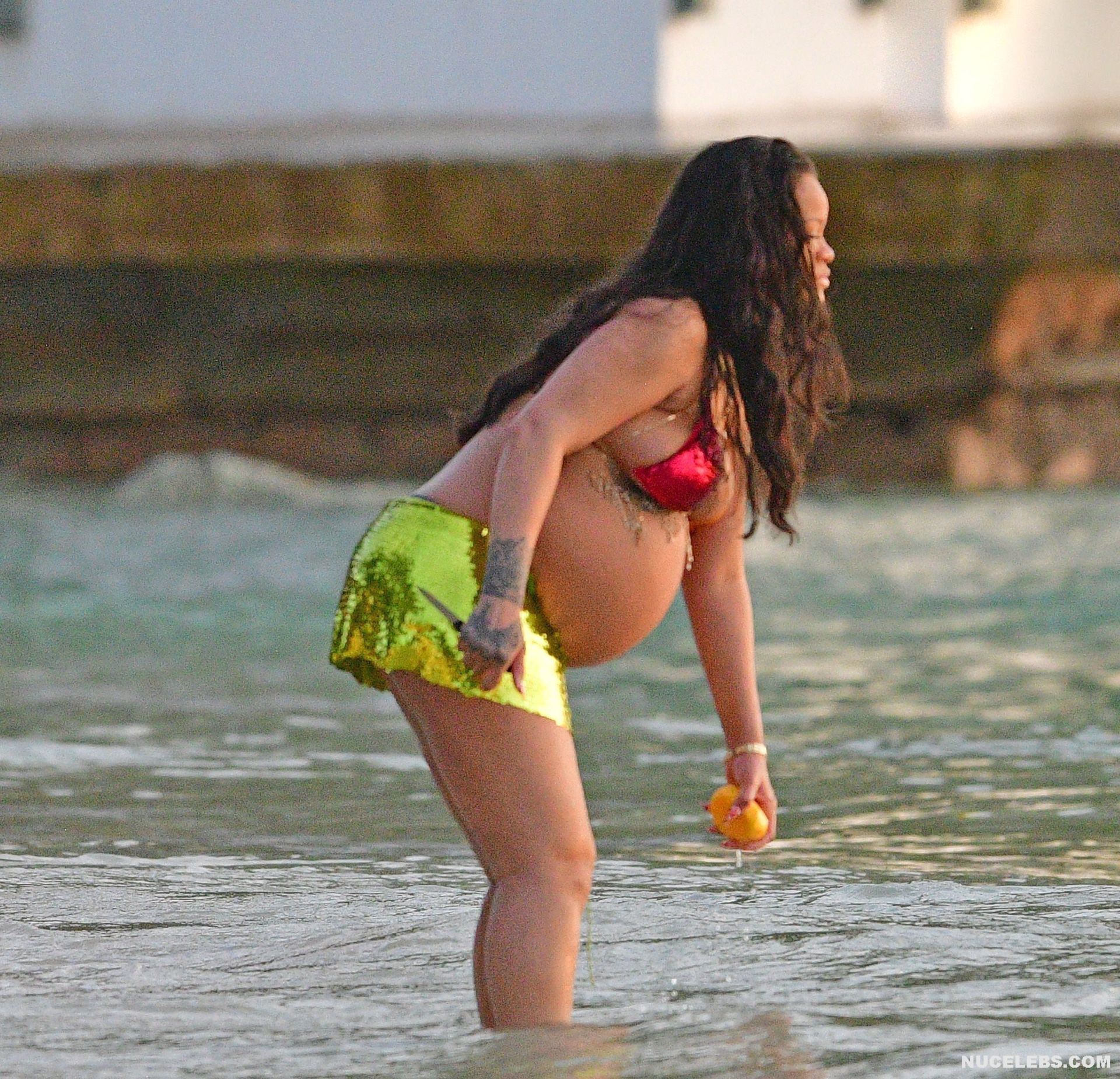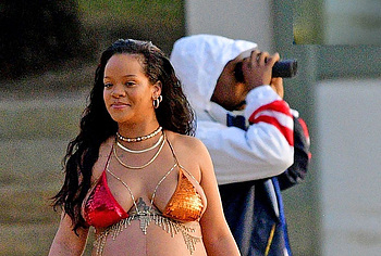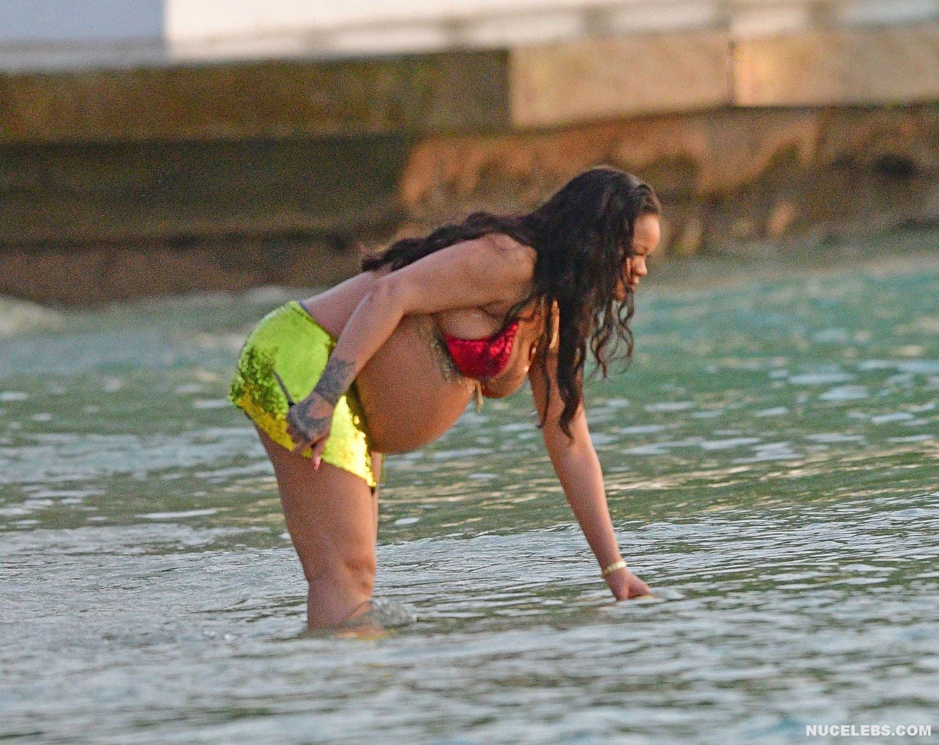 Rihanna manages to look incredibly seductive at any weight. This singer looked stunning during her maternity shoot, posing in a sparkly bikini. Her huge tits were almost jumping out of her bikini top, and the bottom only partially covered her big booty. This celebrity also has many photos in see-through outfits. For example, you will be delighted with Rihanna’s nude big tits showing through her black dress at one of the events!