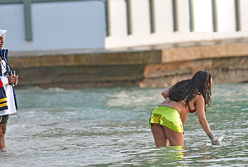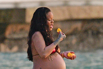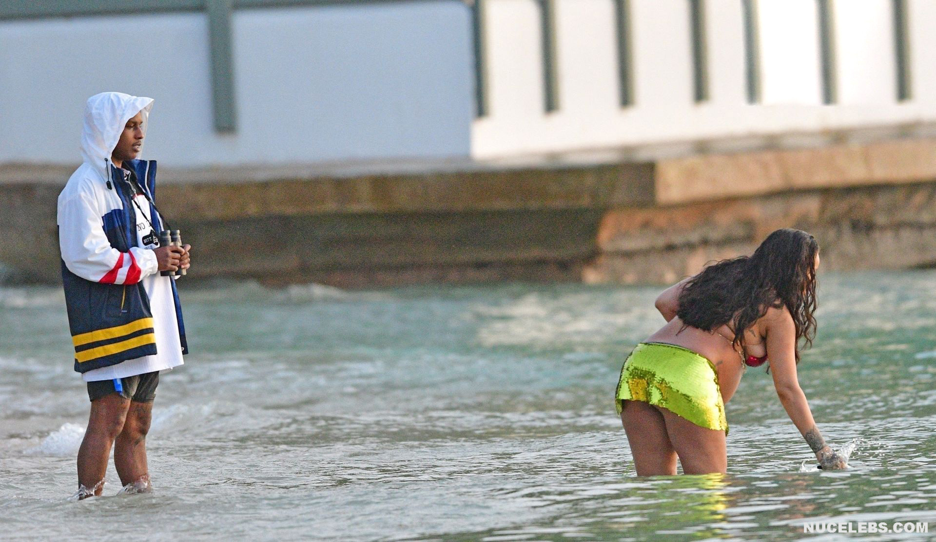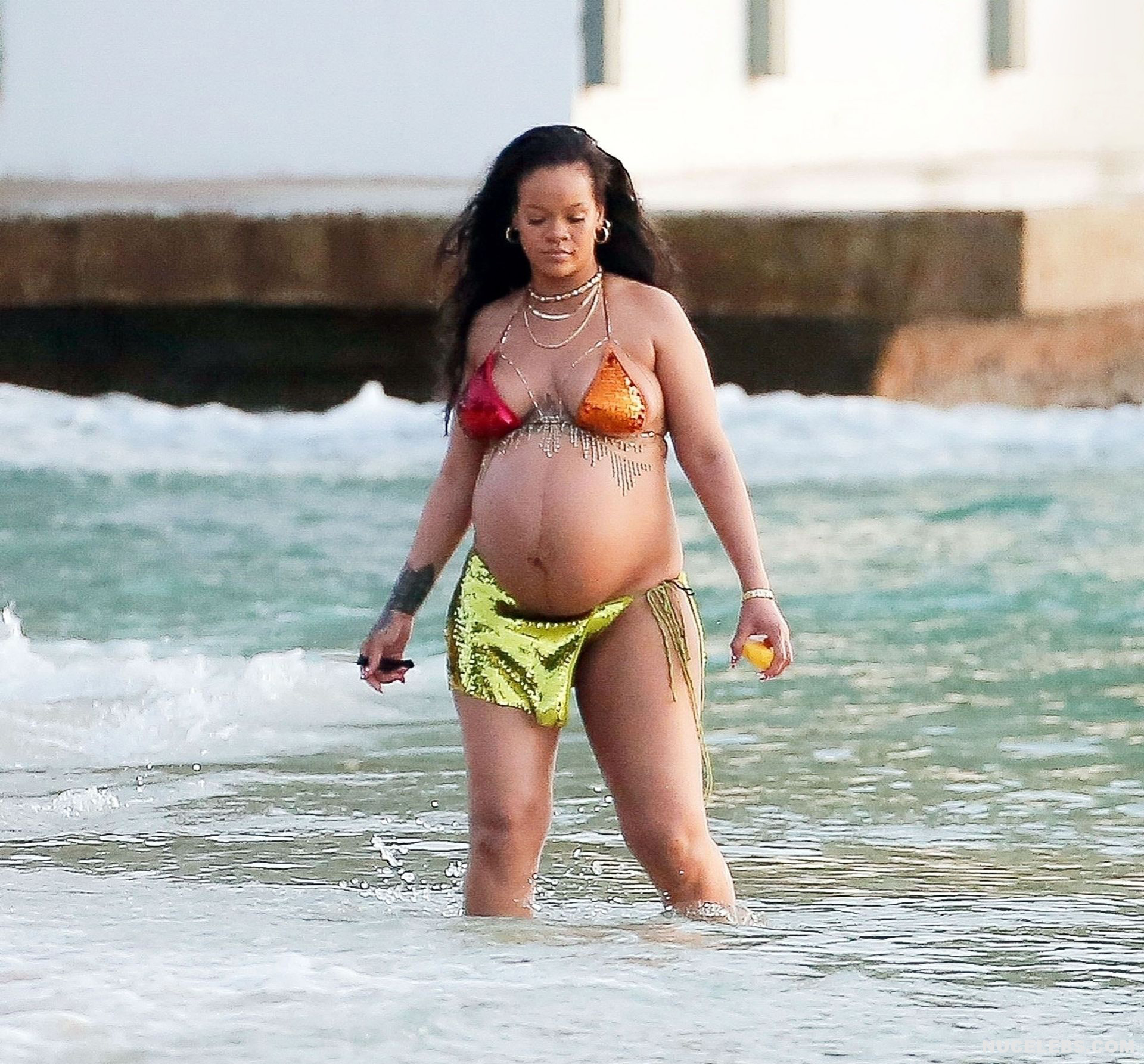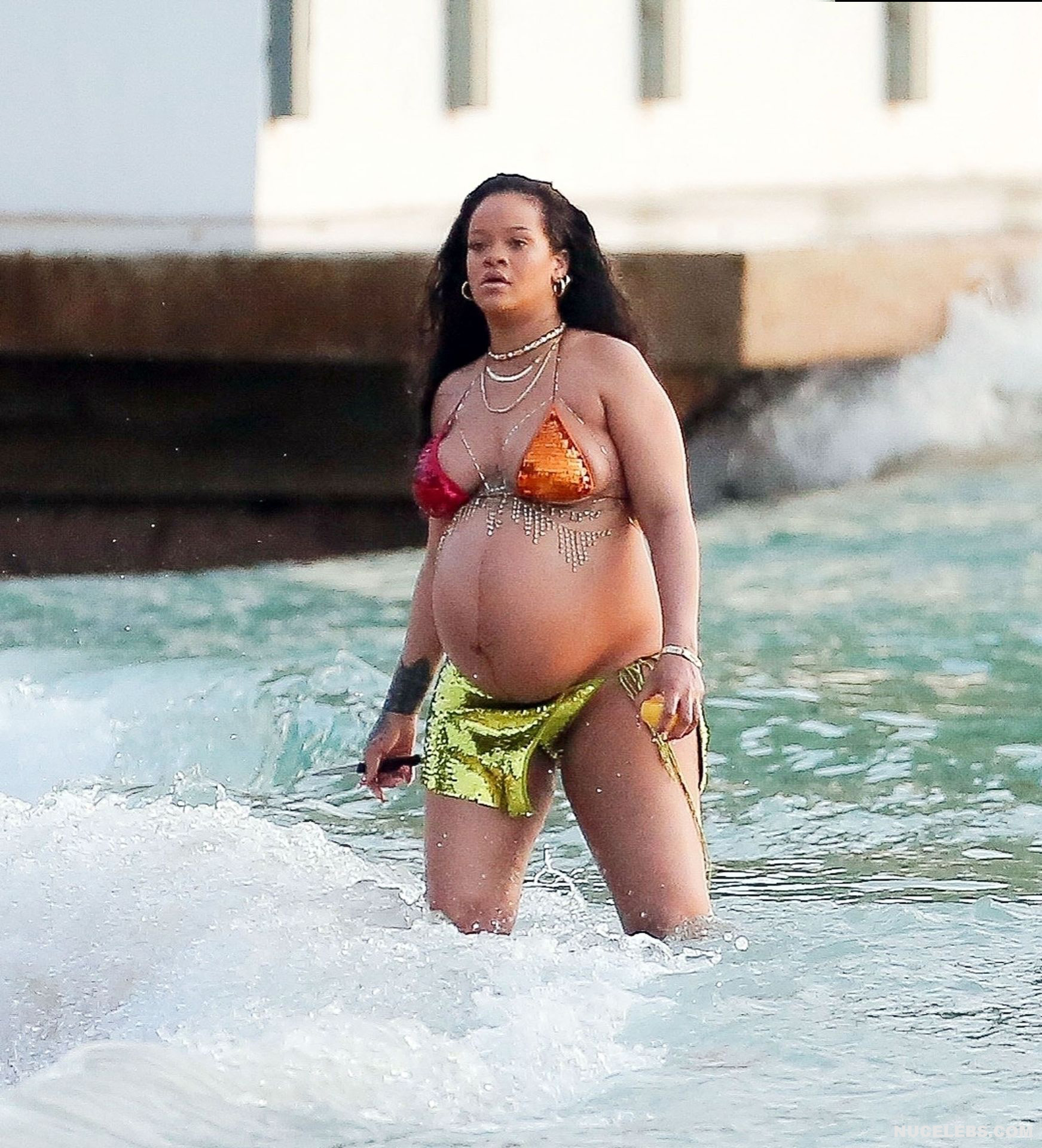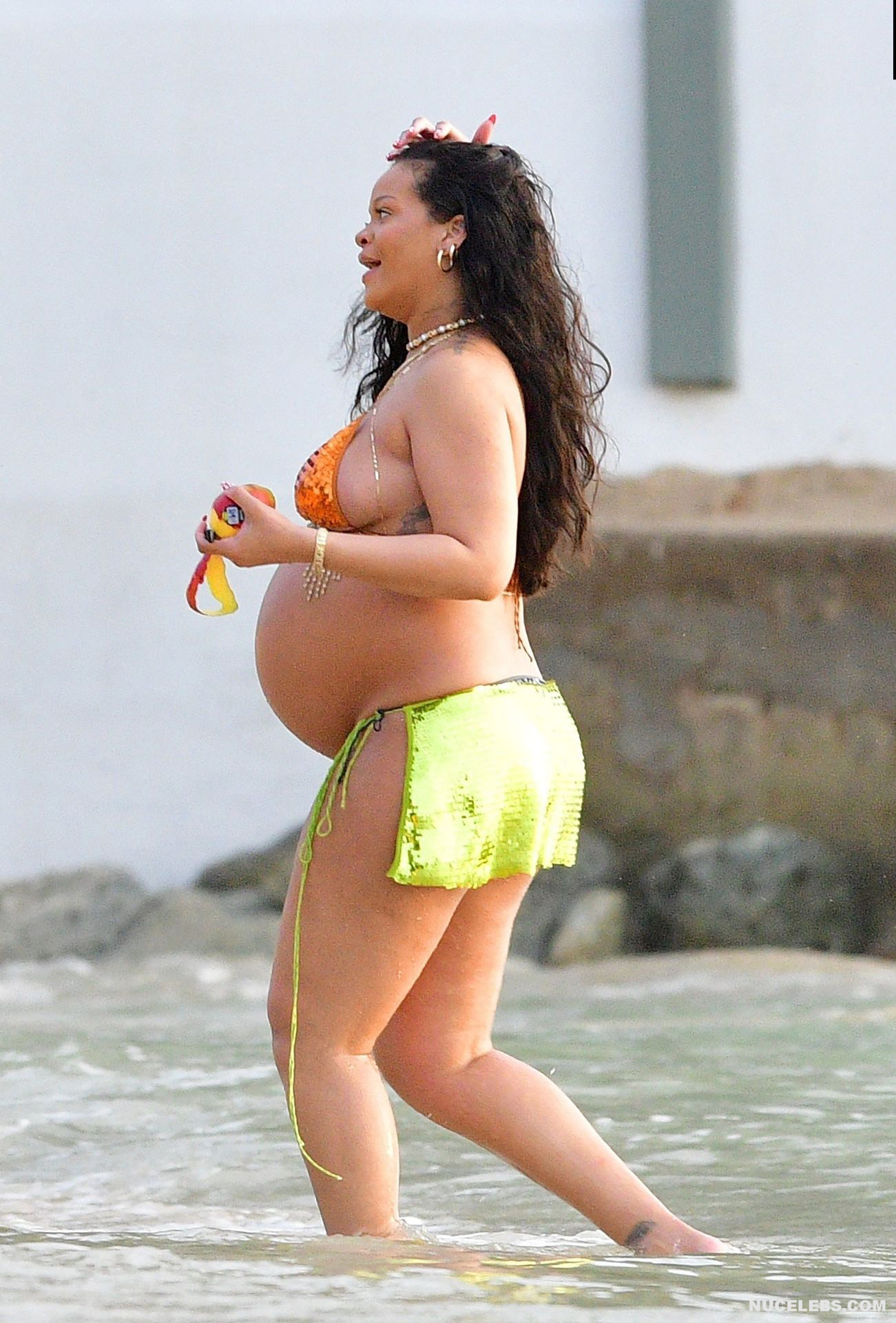 Rihanna manages to look incredibly seductive at any weight. This singer looked stunning during her maternity shoot, posing in a sparkly bikini. Her huge tits were almost jumping out of her bikini top, and the bottom only partially covered her big booty. This celebrity also has many photos in see-through outfits. For example, you will be delighted with Rihanna’s nude big tits showing through her black dress at one of the events!
