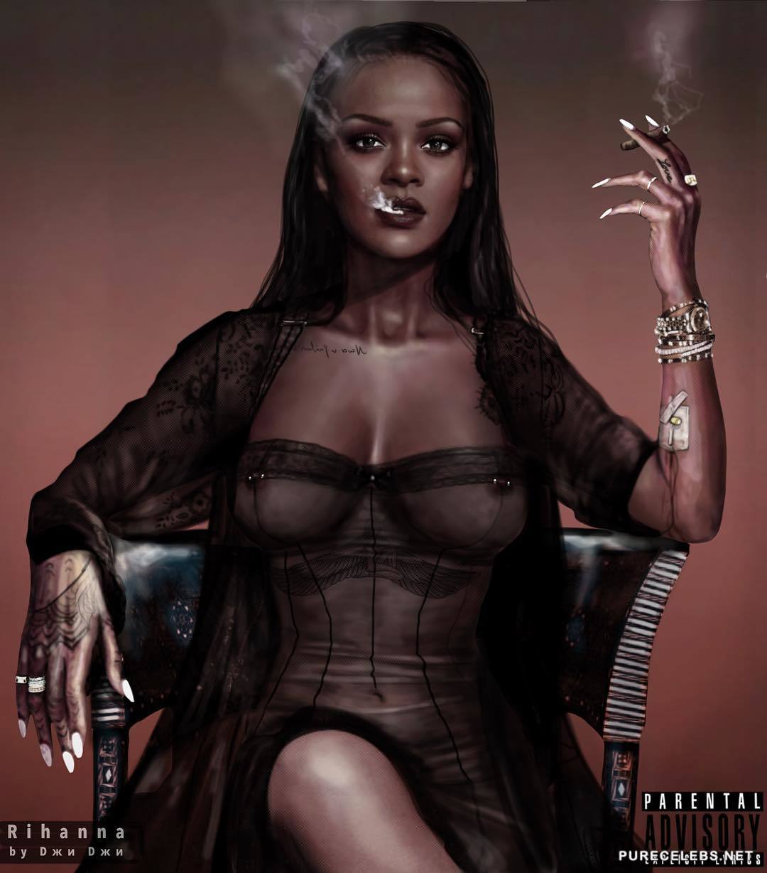 Internationally known babe from Barbados Rihanna never ceases to amaze her fans. This exotic pop star is eager to present her new style. She’s sexy to the maximum. Rihanna smokes a cigar and you can easily see her big boobies in a black see-through dress. Once again she shows us how the real lady should look. Everyone will be amazed by this picture.
