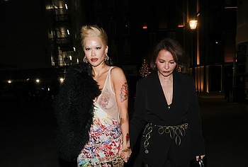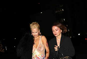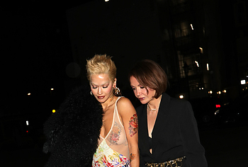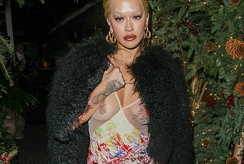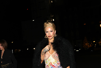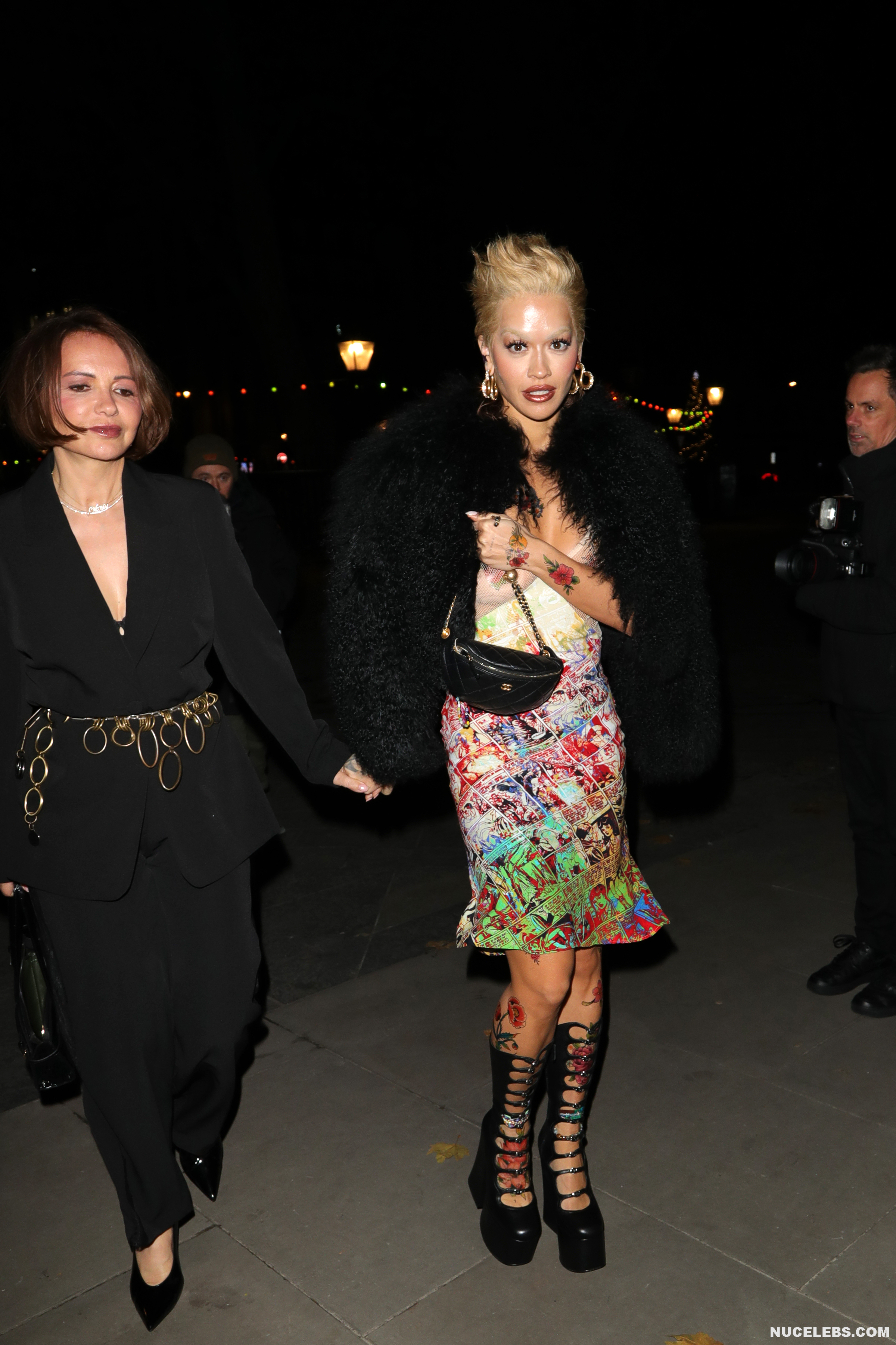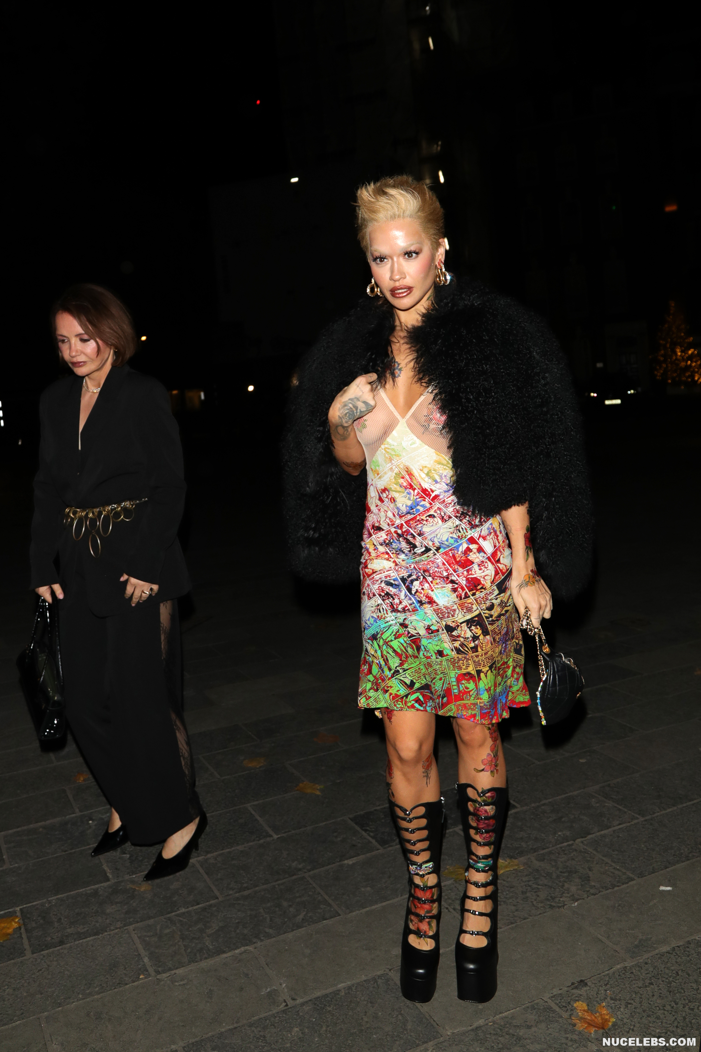 Rita Ora is one of the celebrities caught nude. This beauty often appears in public in very provocative outfits that do not cover her naughty bits. So it was this time, when this hot singer was photographed on the street. Her legs were decorated with black high boots with slits on a high platform, and she herself was wearing a cute multi-colored dress. And by the way, this star was again without a bra. Most likely, Rita Ora did this on purpose to show off her nude juicy boobs, showing through the mesh top of the dress.