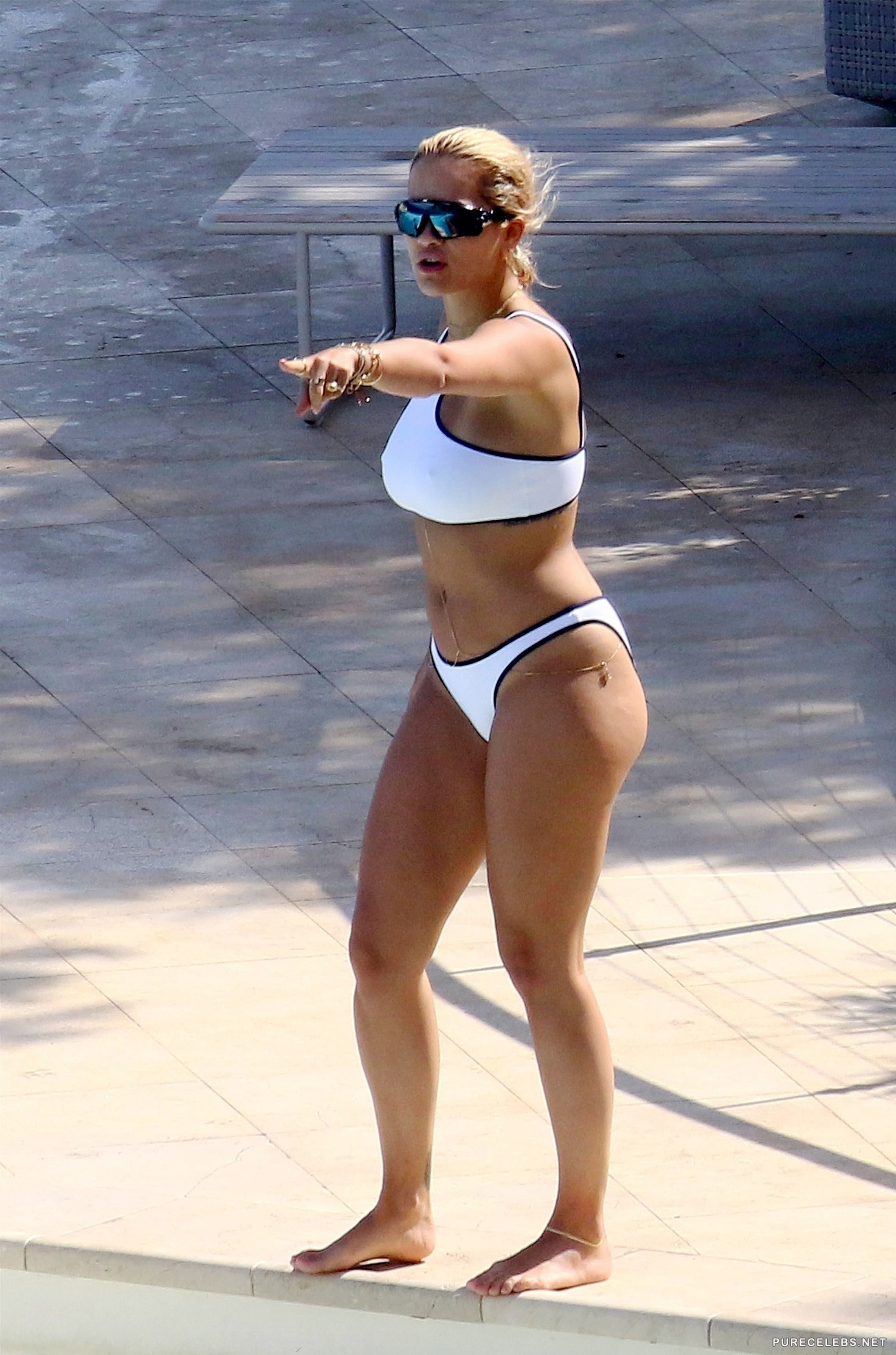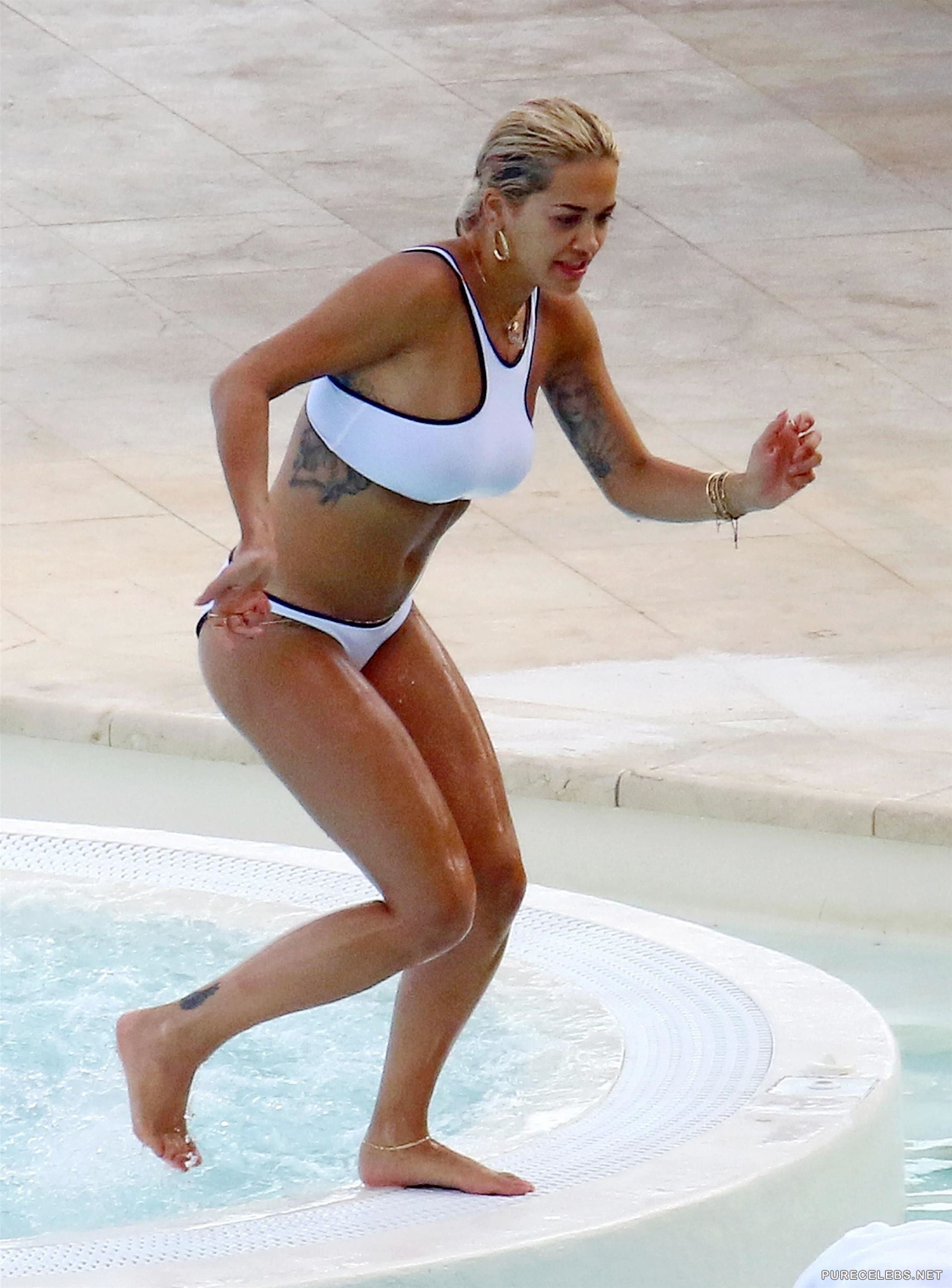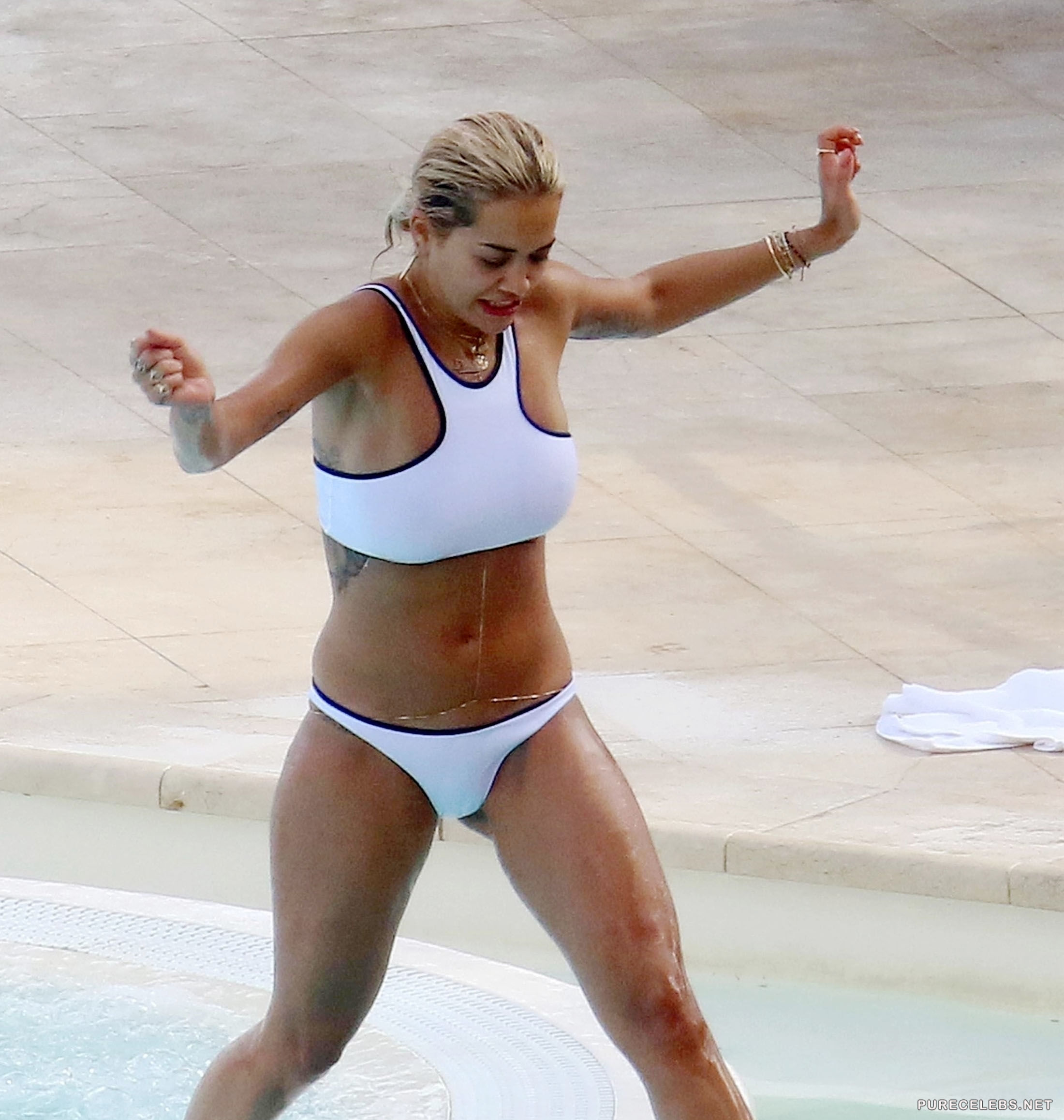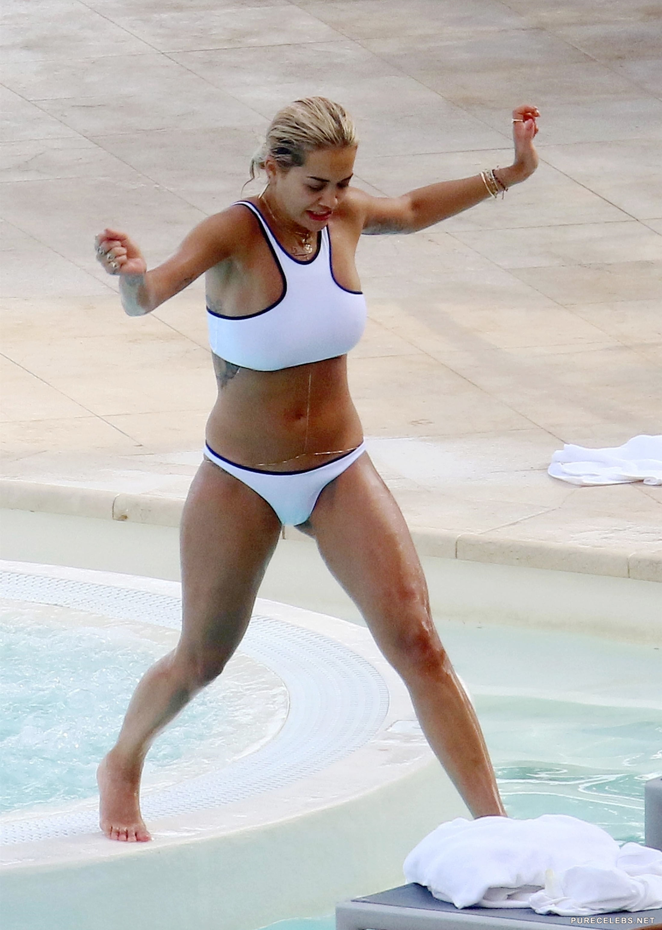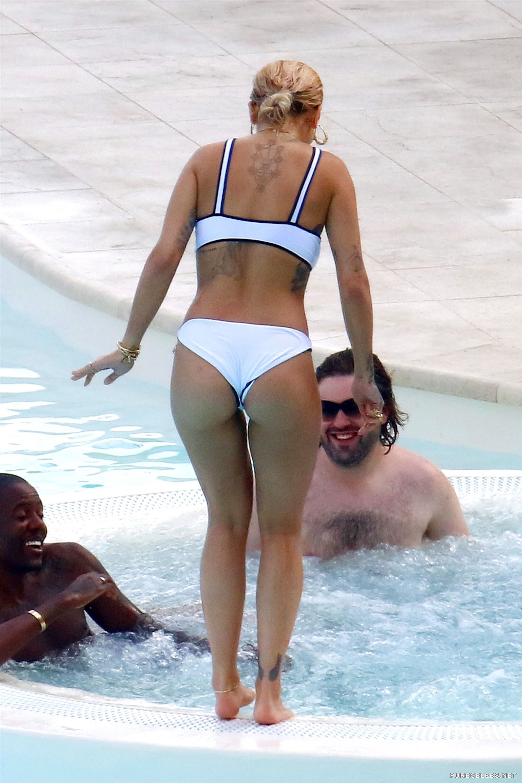 Rita Ora looks stunning in this white bikini, this gorgeous British singer decided to have some fun before she starts new projects, so she just jumped in a bikini and had fun with friends, in the swimming pool. We love to see celebrities looking super sexy, but when they show us a cameltoe, like Rita did, we can not stop staring at her, although that firm butt looks amazing, too.