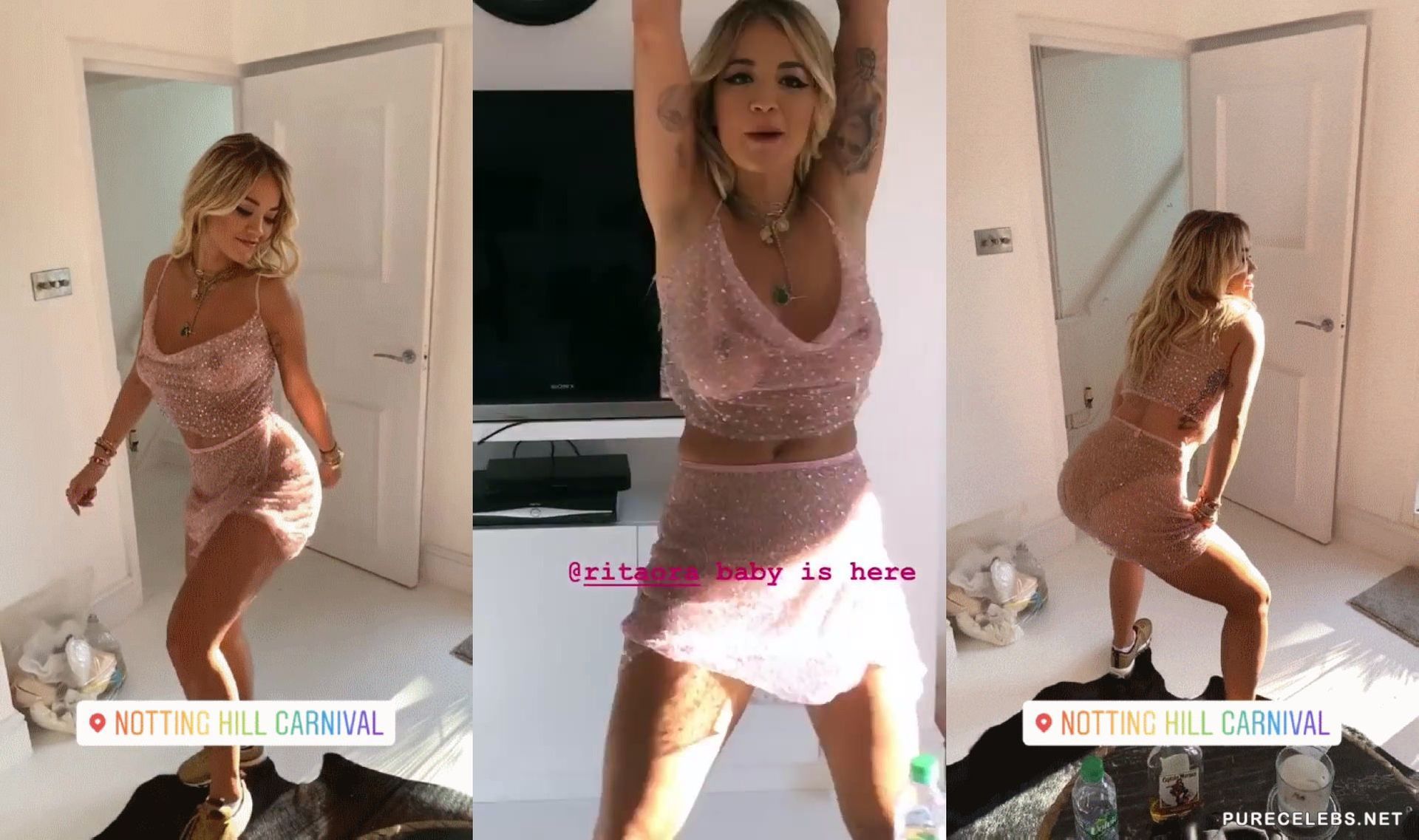British singer Rita Ora decided to impress everyone around when she appeared on the beach in a very candid and sexy bikini. Hot blonde looked gorgeous in a black small bra, from which her juicy boobies are going to jump out, and small black panties that barely covered her awesome booty. And when the celebrity leaned over, you could even see her pussy lips that slipped out of her narrow straps. This star is incredibly hot!