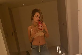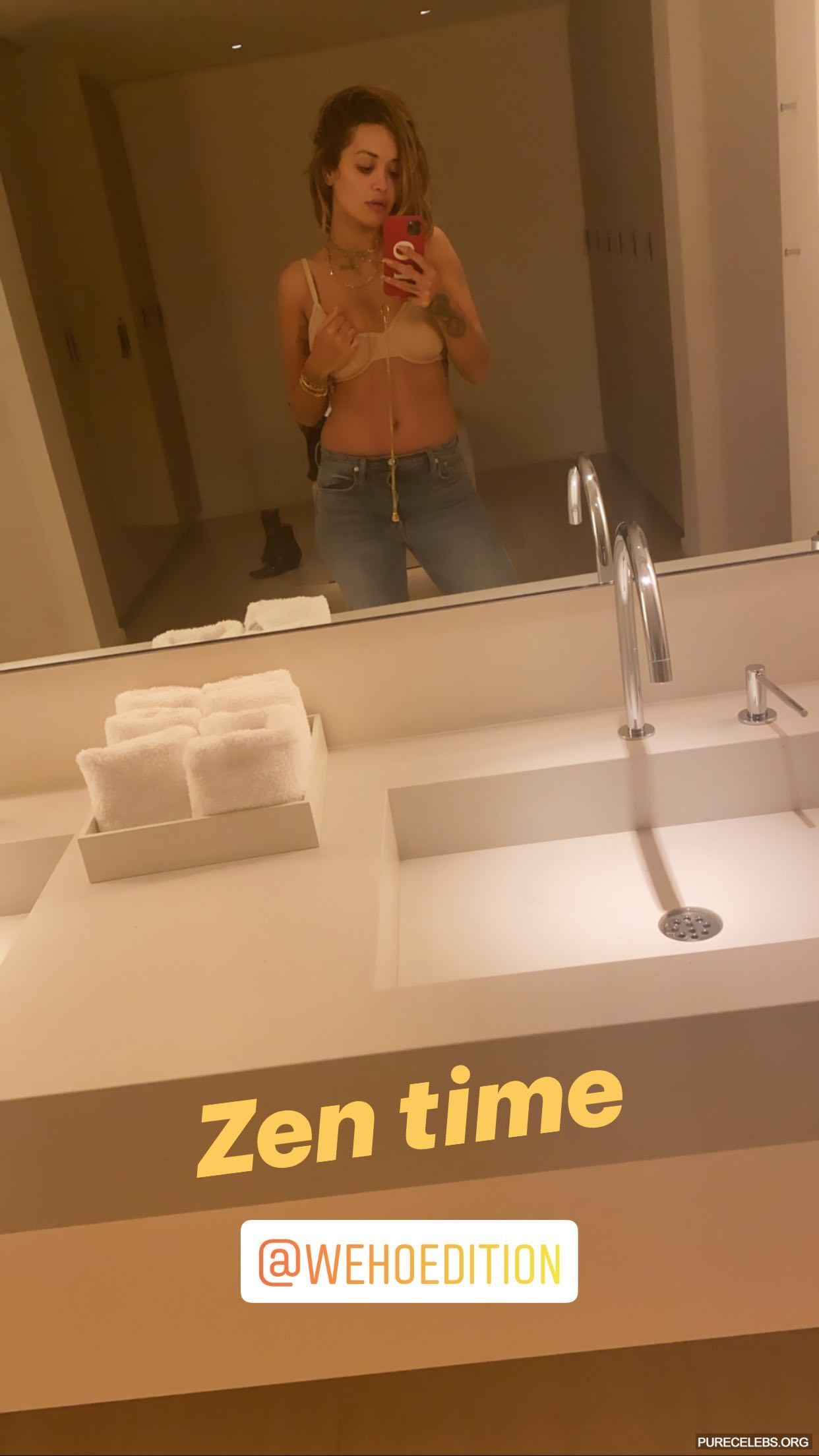 English singer Rita Ora loves to show off her nude breasts and ass. This star posed without embarrassment in a cute transparent top with lace through which her tits with hard nipples were visible.