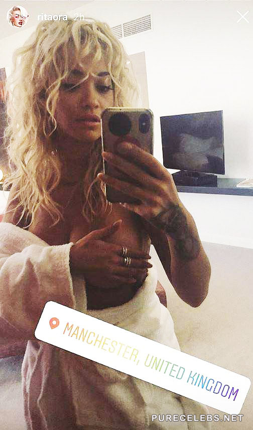 Rita Ora is topless in the backstage and using an opportunity to snap a few private photos of herself, looking seductive and striking a pose that might make many of us get an instant hard- on. In the robe or just covering those boobs of hers with her hands, still she gives us a lot of fapping material and looks as sexy as fuck. Great job you did, Rita Ora!!
