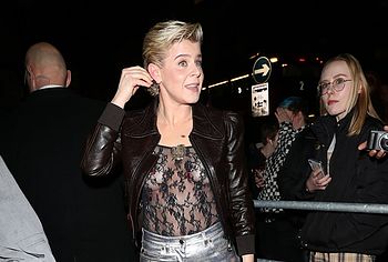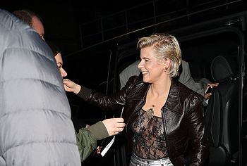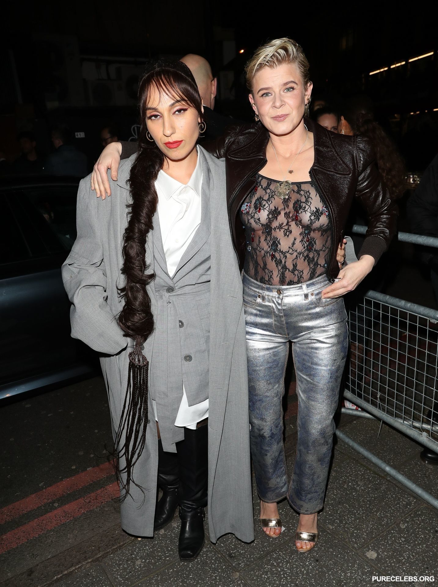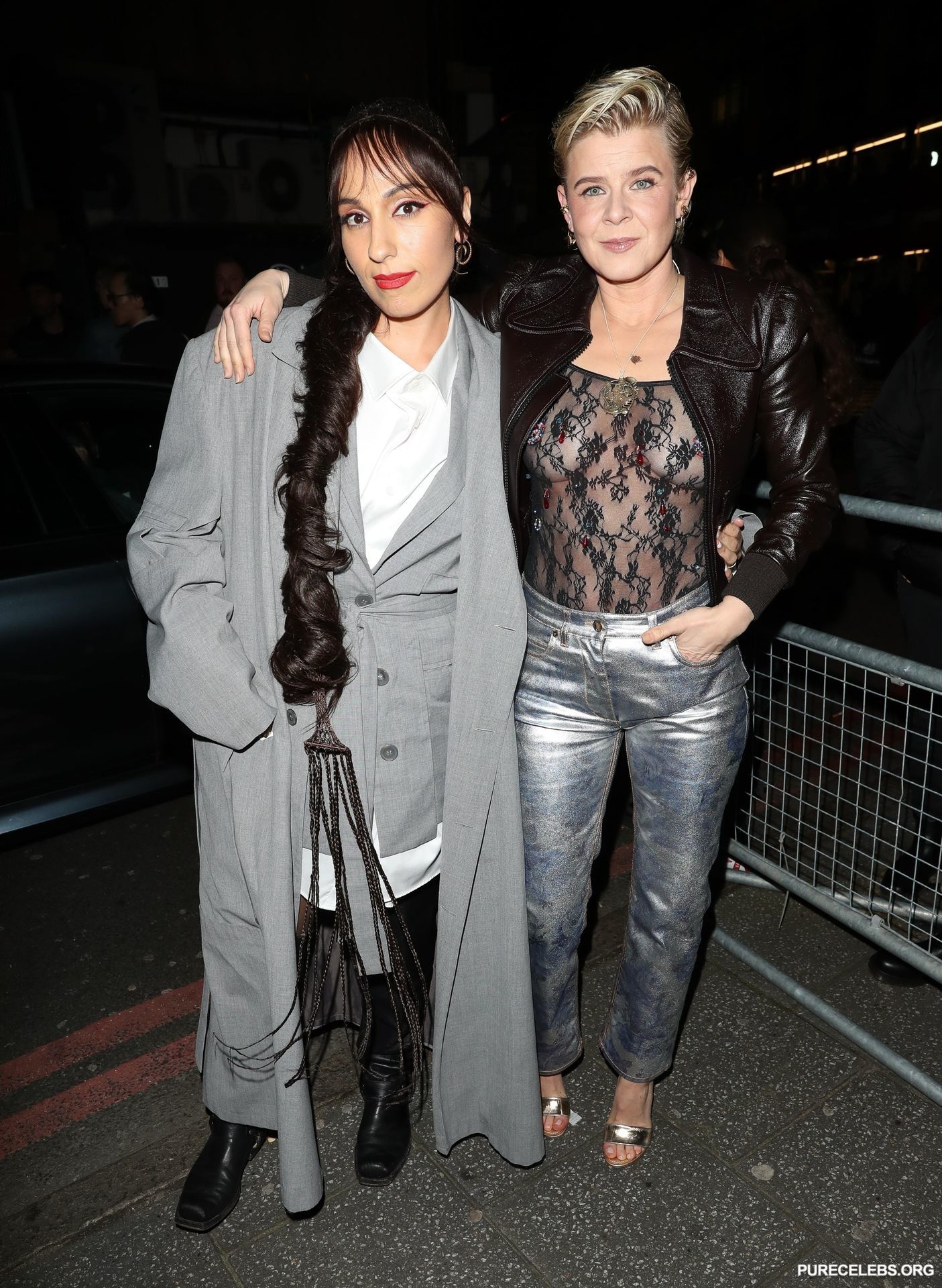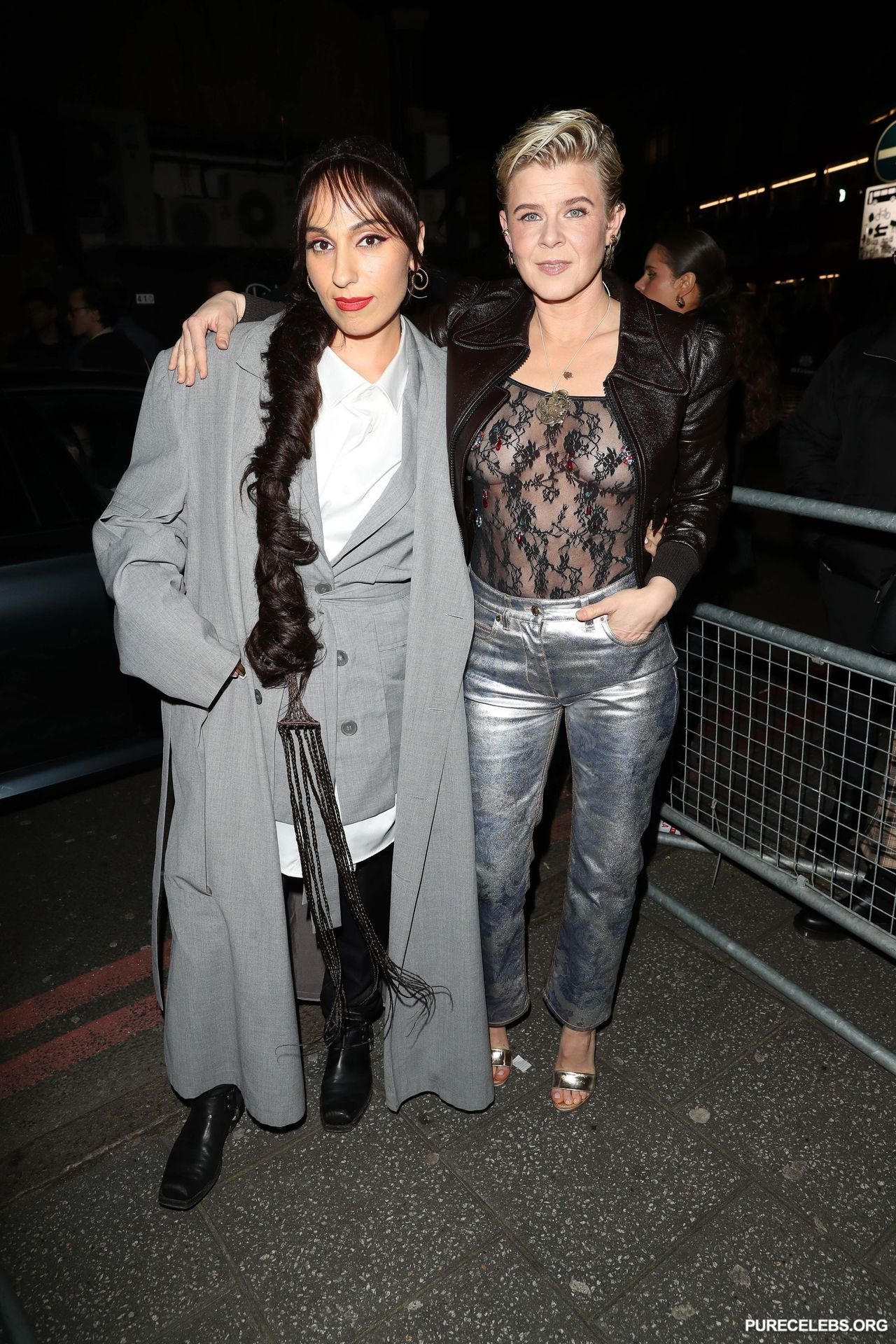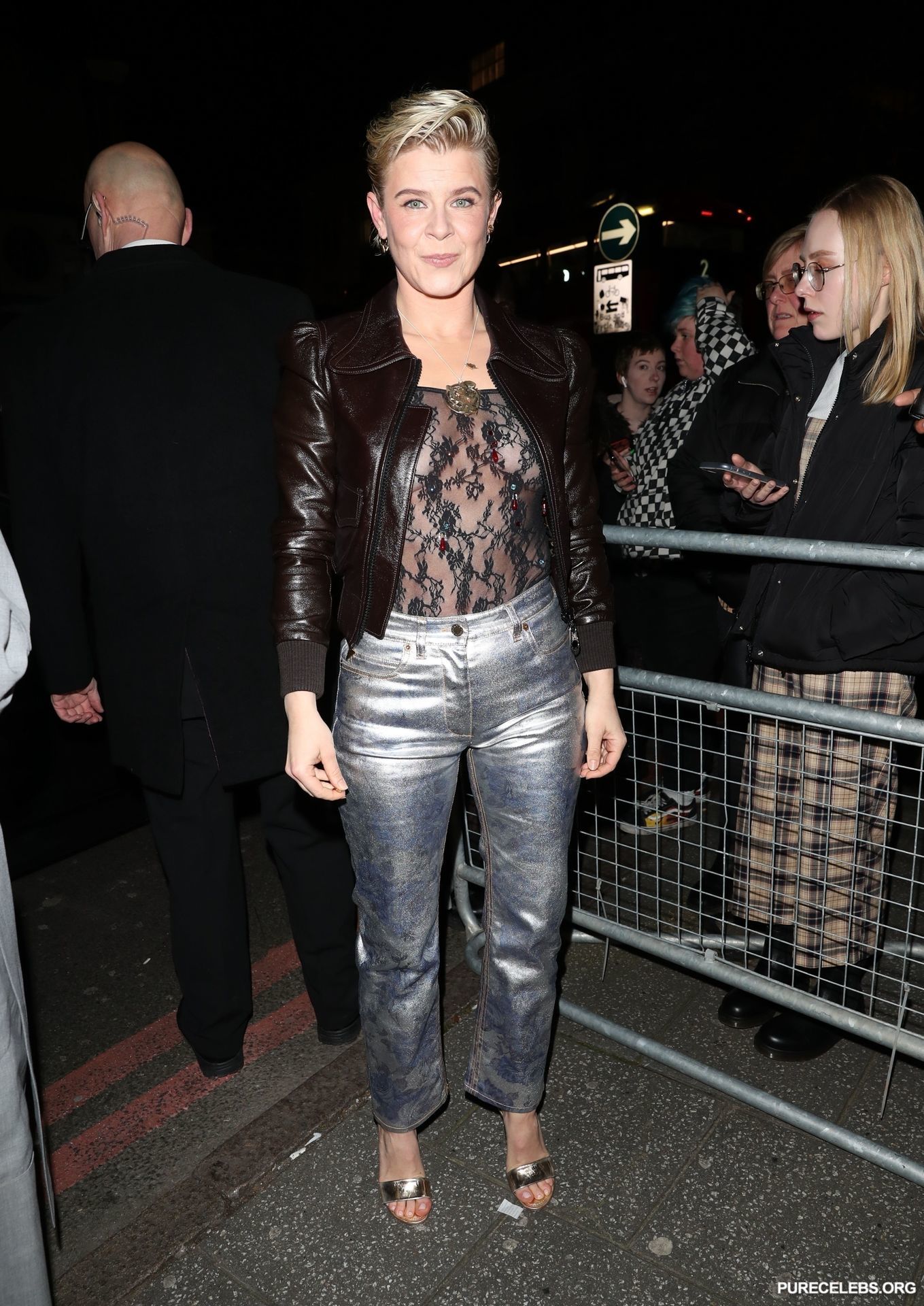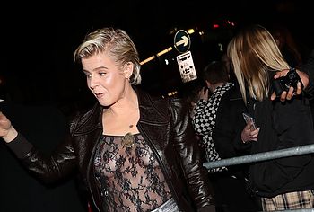 Swedish singer Robyn decided to attract the attention of the public by showing off her nude boobs. So, the celebrity appeared at one of the events in gray pants, a black leather jacket and a black lace top. As it turned out, the girl did not wear a bra. So everyone around could see her tits with hard nipples that shine through a transparent top.