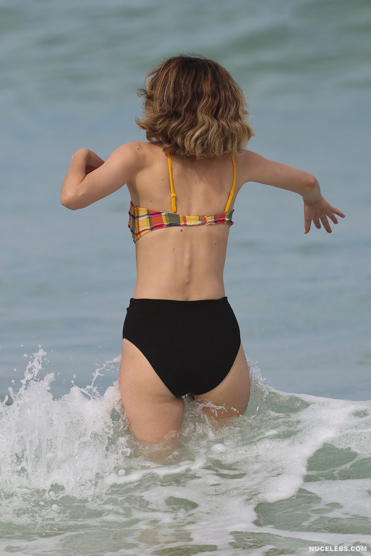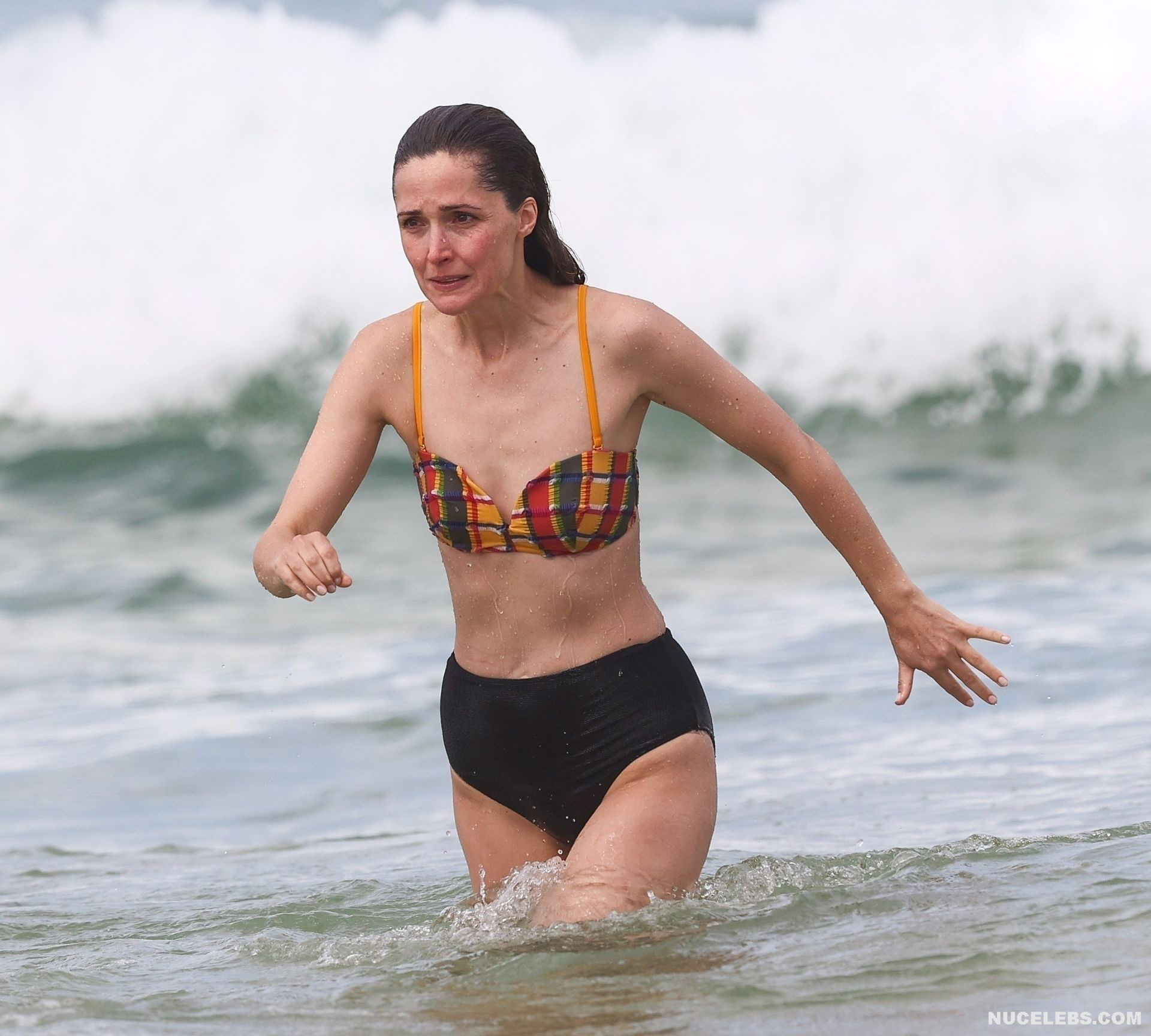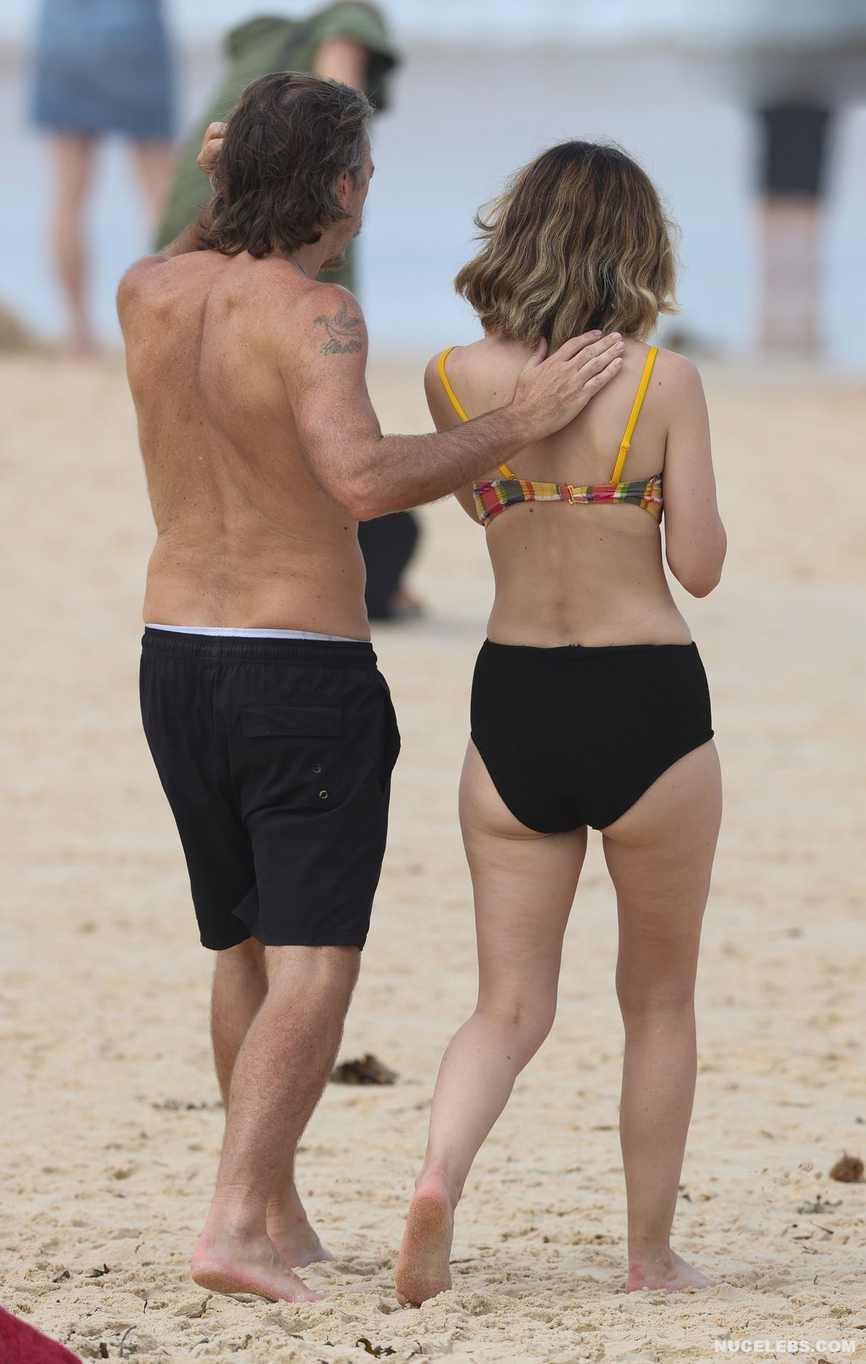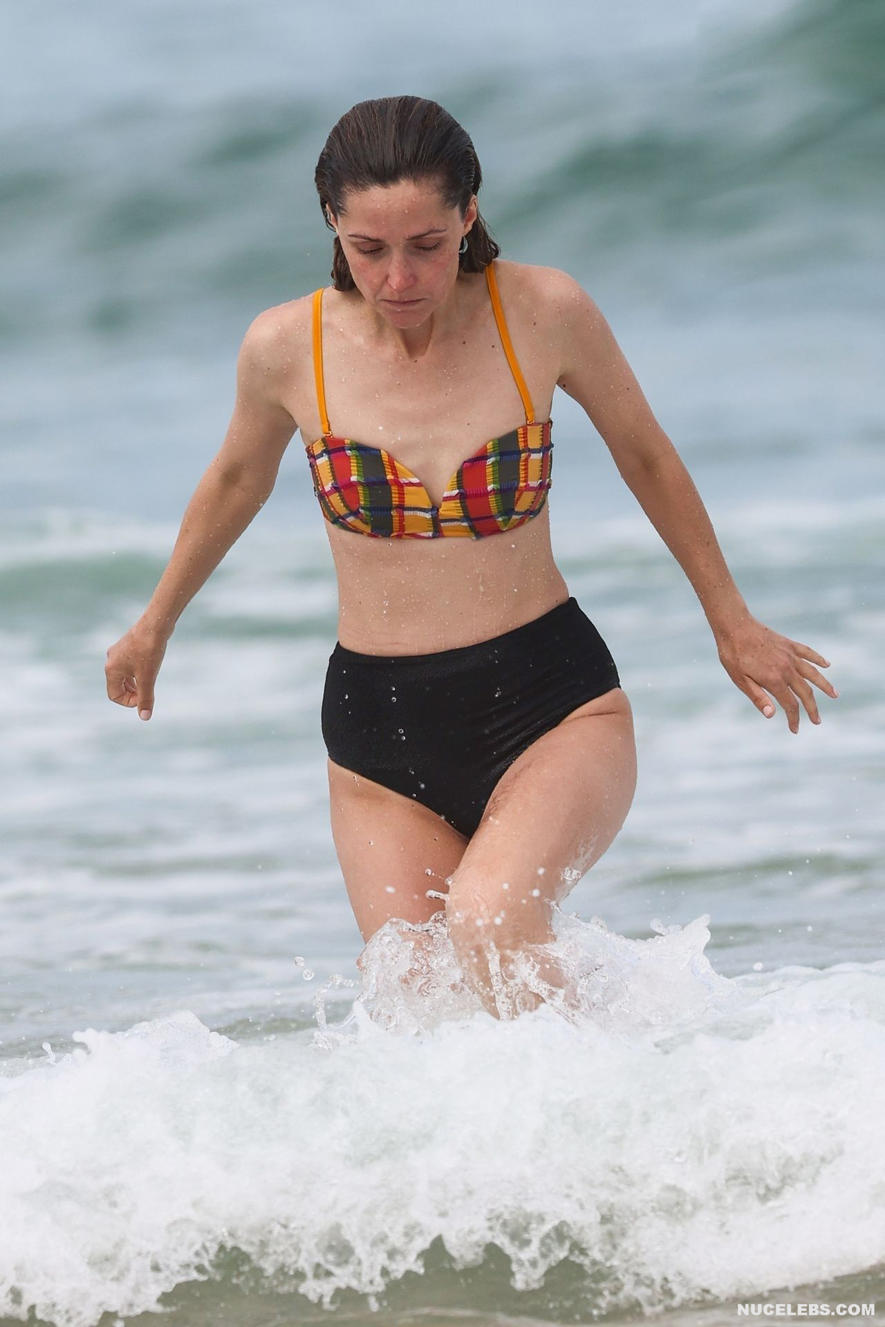 Rose Byrne will impress you with her amazing slim figure in a wet bikini during her vacation. The paparazzi photographed her at the moment when she was leaving the water. And it is worth noting that Rose Byrne’s booty in black panties looked very seductive, although it was not nude. Rose Byrne also periodically adjusted her plaid bra so that her nude boobies would not slip out of it.