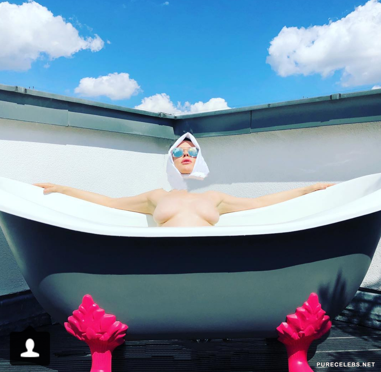 Here, to make your day, Rose McGowan’s topless selfie in the mirror, one photo of her topless in the bath tub and one in a wet shirt, with her nipples obvious. Sexy set of hot pics to pass the day and do a bit of fapping here and there, because this beauty deserves every drop of it, if you know what we mean. She can never have enough of teasing!