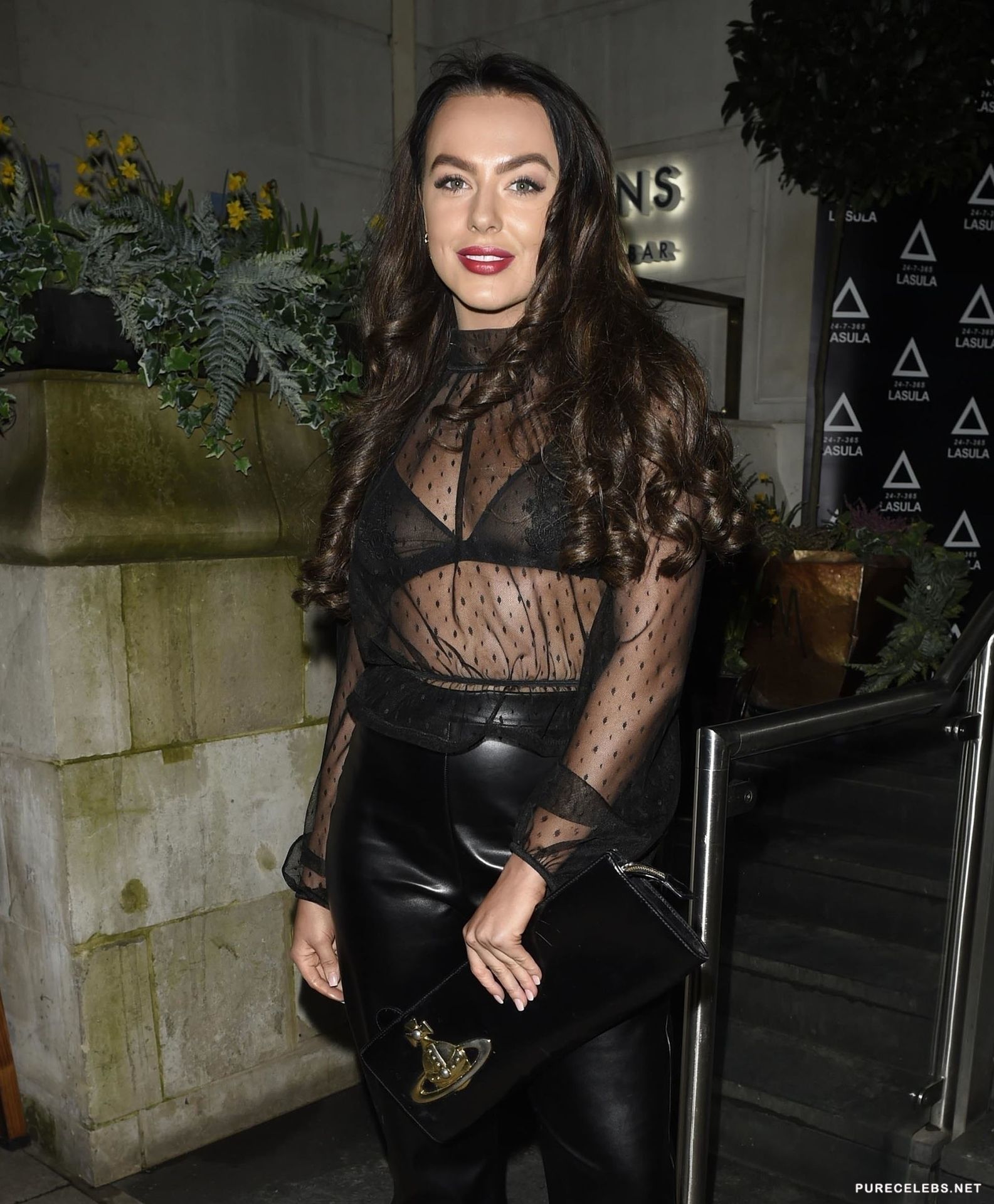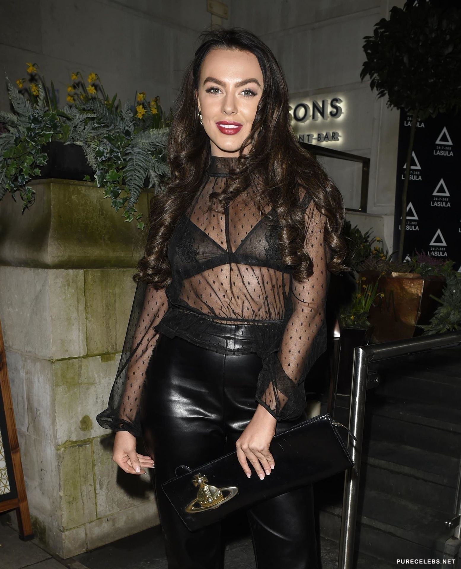 Love Island’s Rosie Williams has long been accustomed to posing in front of a camera lens. Not so long ago, this charming brunette was caught when she walked along the street wearing a black translucent polka-dot blouse and leather pants that perfectly accentuated her slender hips. Her black lace bra was also translucent, so you can clearly see awesome boobies with poking nipples of this hot beauty.