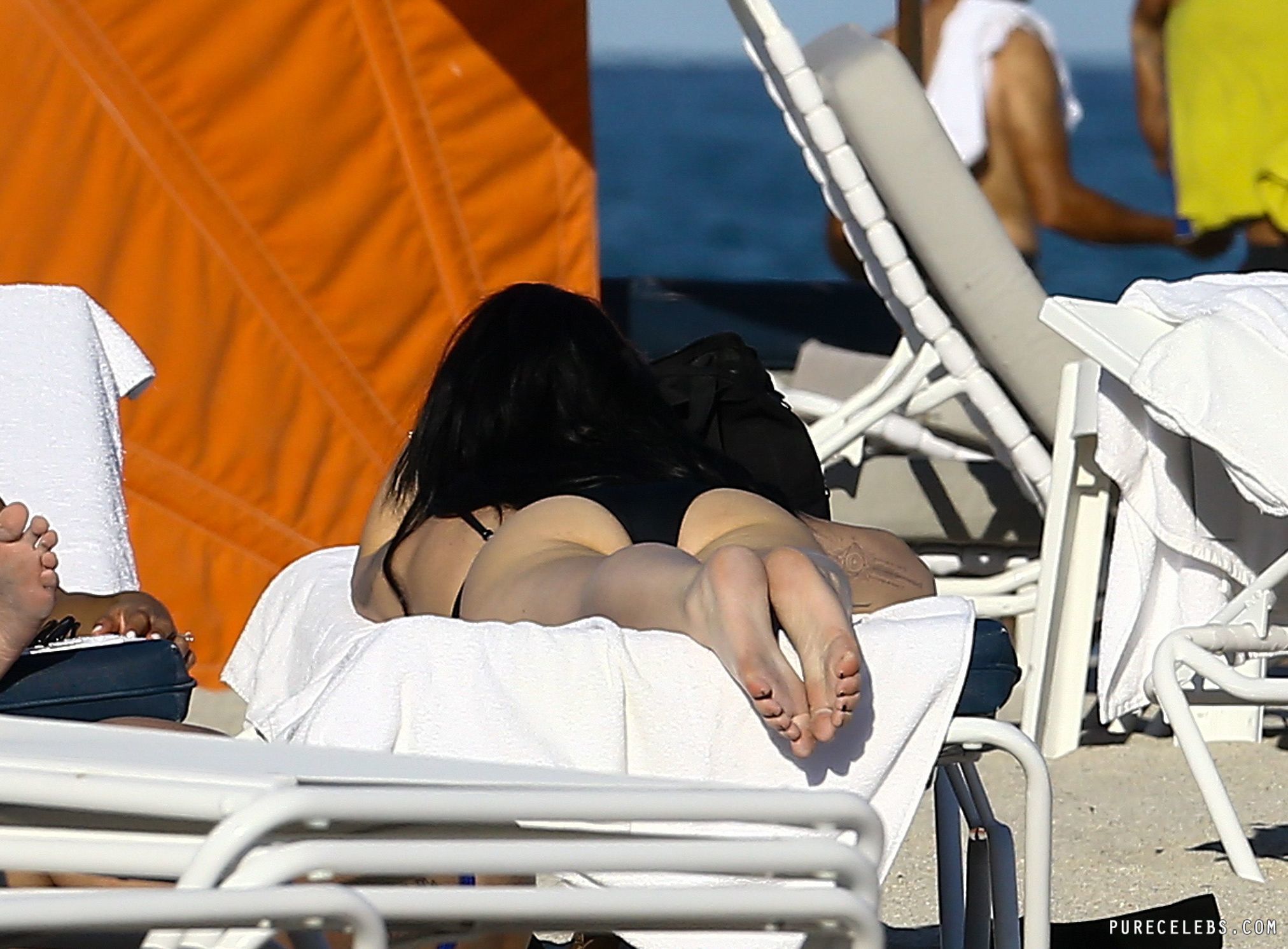 Sweet Hollywood actress though she would have some fun time at the beach. But all of that was spoiled by paparazzi. They caught her, Rumer Willis, tanning in smoking hot black bikini! Unfortunately she isn’t soaking wet, but nevertheless she is being very sexy! Come and see these unique and one of a kind paparazzi photos, where her lovely tight butts are satisfying and fulfilling your naughty desires and wishes!