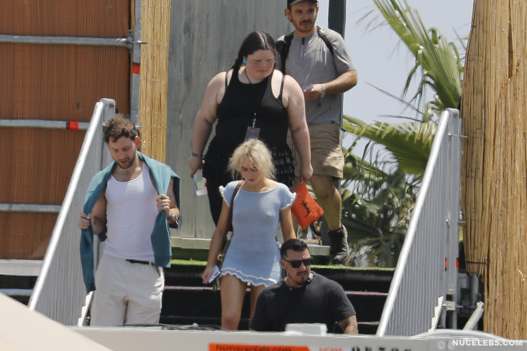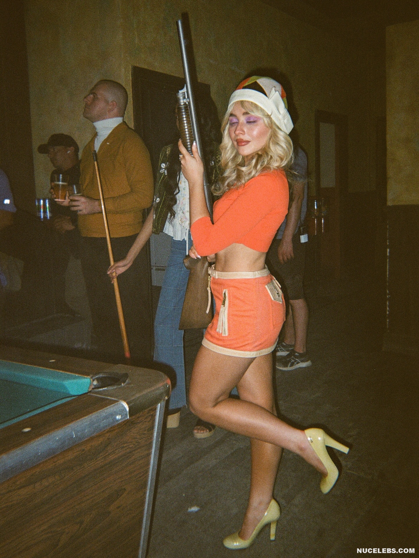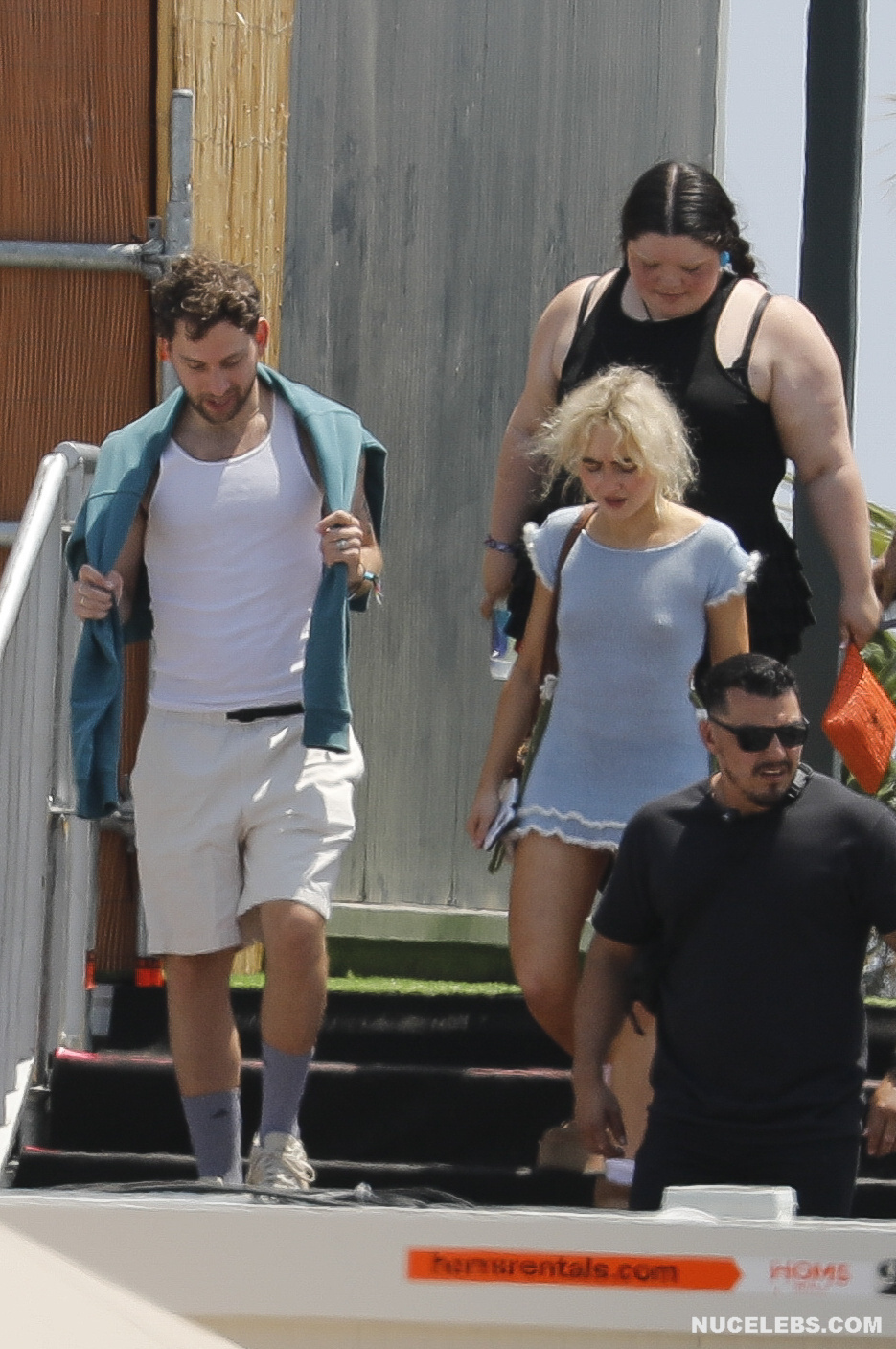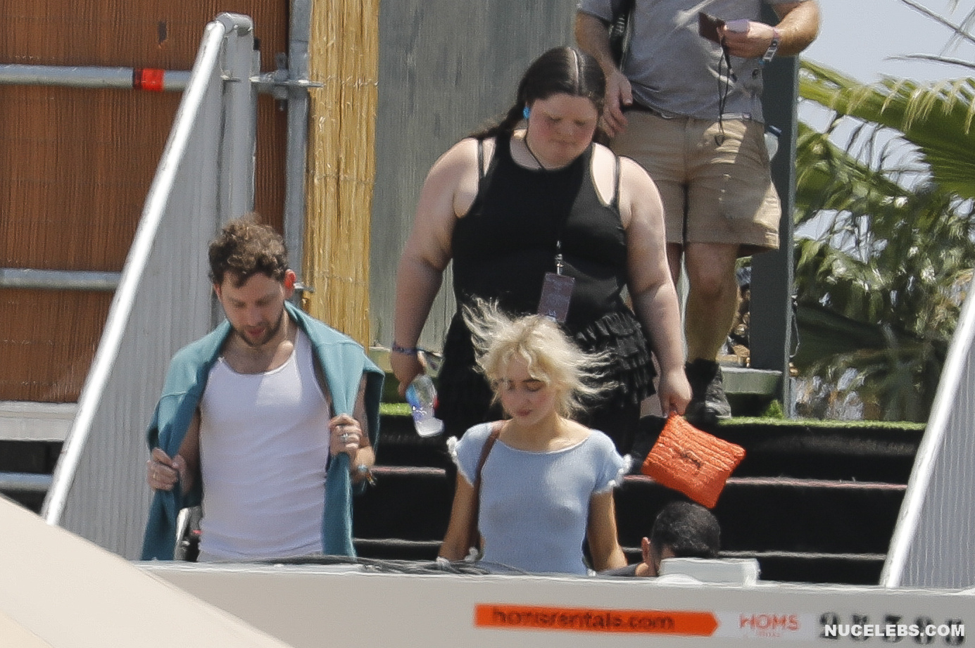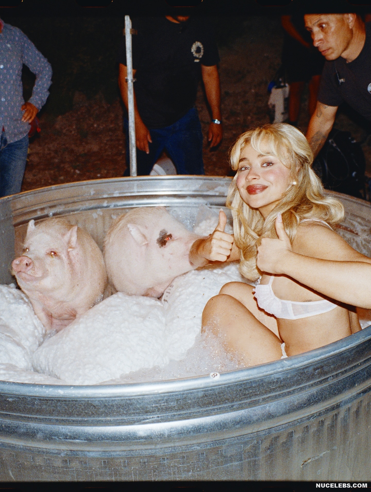 Everyone criticized Sabrina Carpenter’s new album cover, but honestly, it’s divine. Even though she covered most of her body with her hair, we can still enjoy the view of Sabrina Carpenter’s naked ass. And those white stockings only add fuel to the fire. On top of that, recent paparazzi photos, show Sabrina wearing a blue thin dress, give us a full view of Sabrina’s tits.
