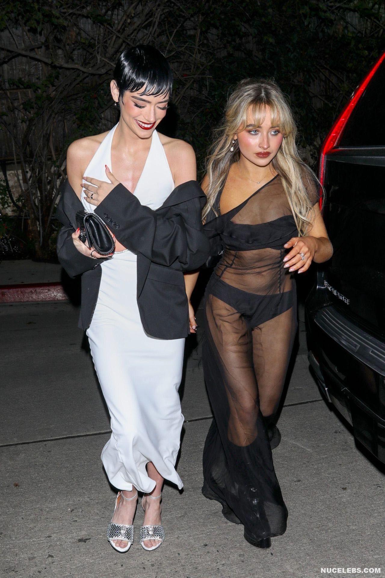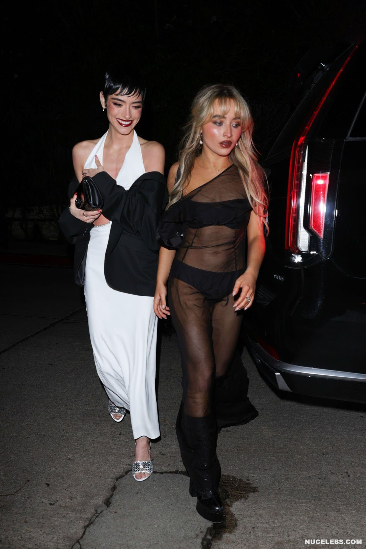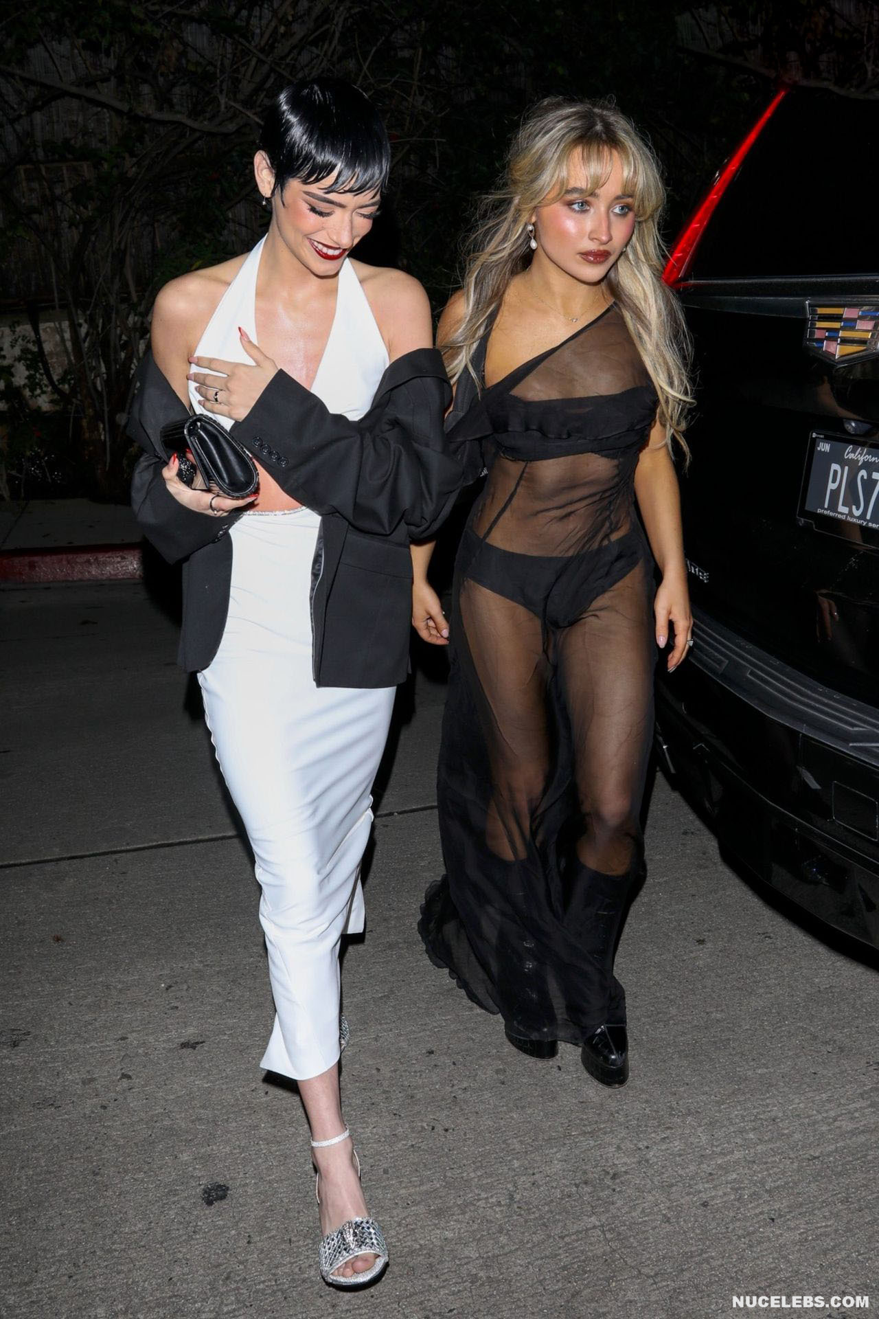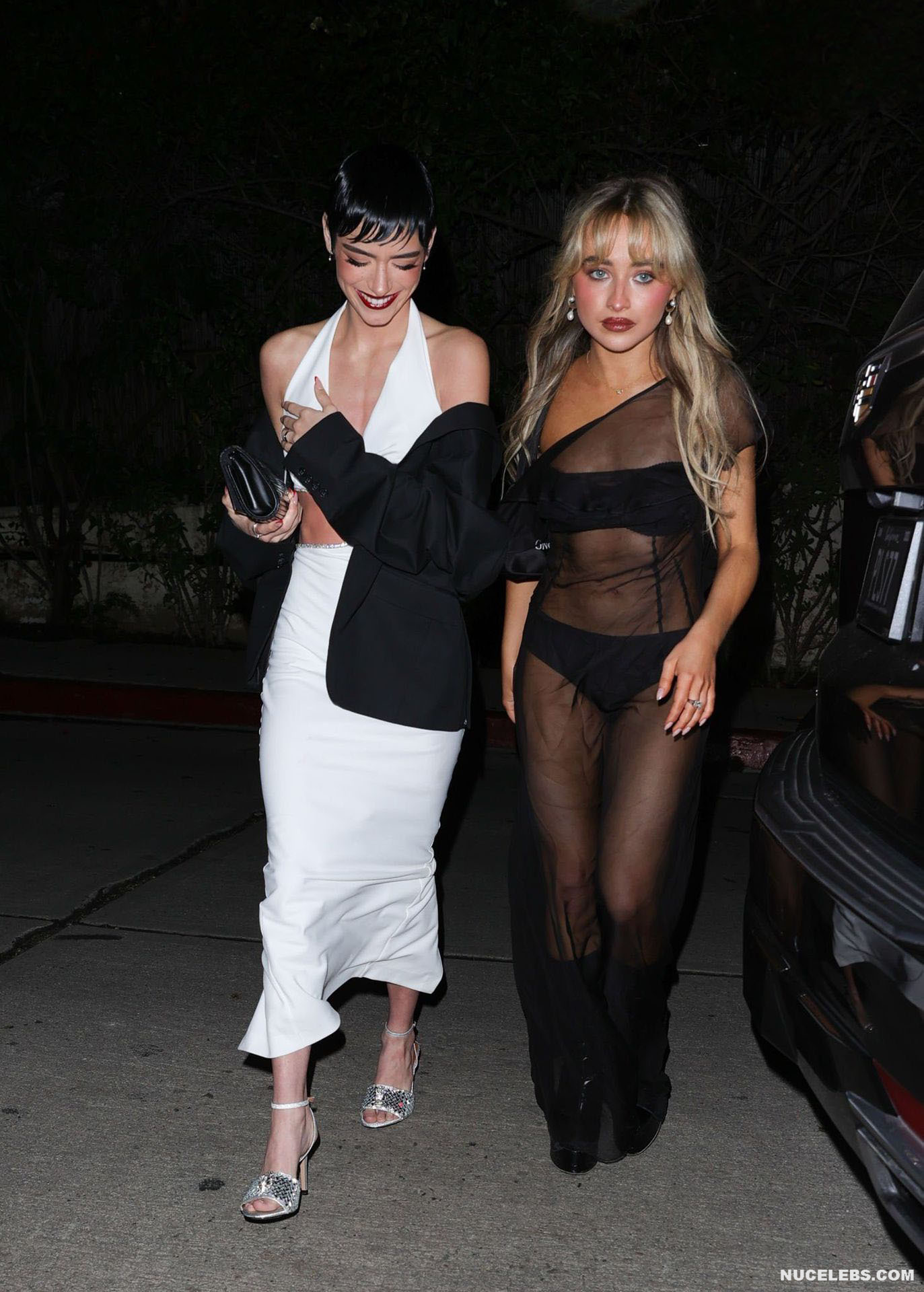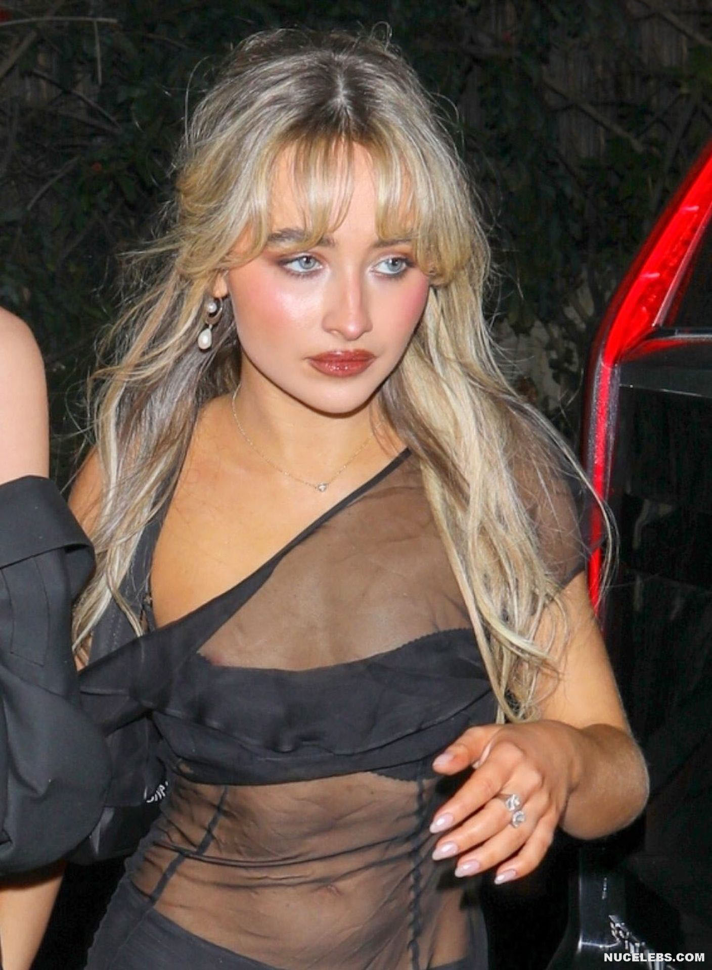 Sabrina Carpenter flashed her sweet tits during one of the events. So, this 24-year-old actress was wearing a long black dress, which, by the way, was completely see-through. The girl made sure to wear black lingerie under the dress. However, Sabrina Carpenter did not take into account the fact that her bra will slide down and her nude boob with a brown nipple will become visible to everyone around!