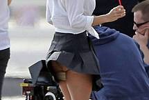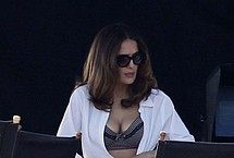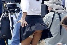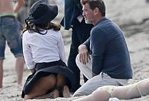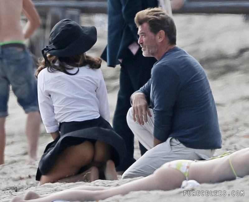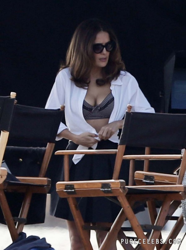 Gorgeous actress Salma Hayek is the target of sneaky paparazzi once again. While shooting something or other at the beach, this curvy beauty came ill prepared when it comes to her clothes. A windy day and her skirt didn’t get along, so we have these photos of her upskirt thong, but also classy photos of her in a more modest dress to be fair.