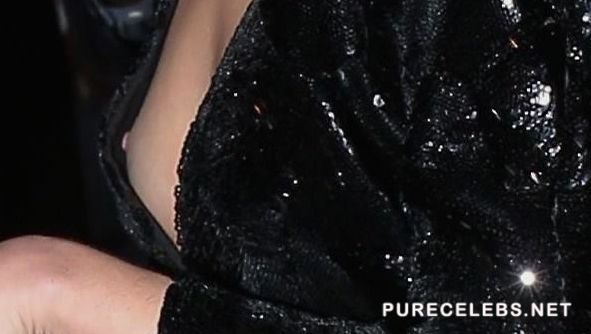 We don’t know what is going on with Sarah Hyland, but in her recent public appearance she looks absolutely awful. Her makeup looks like it was done by circus clowns and those big brown glasses do nothing to compliment her cute face. The only redeeming quality of her outfit is that the low cut sequin dress she wore freed her nipples for all present reporters to photograph and enjoy.