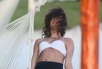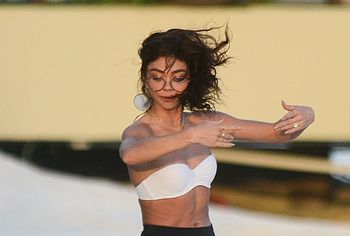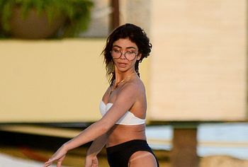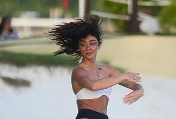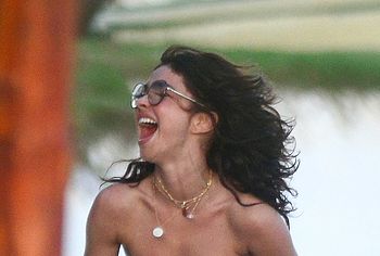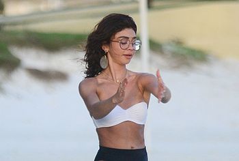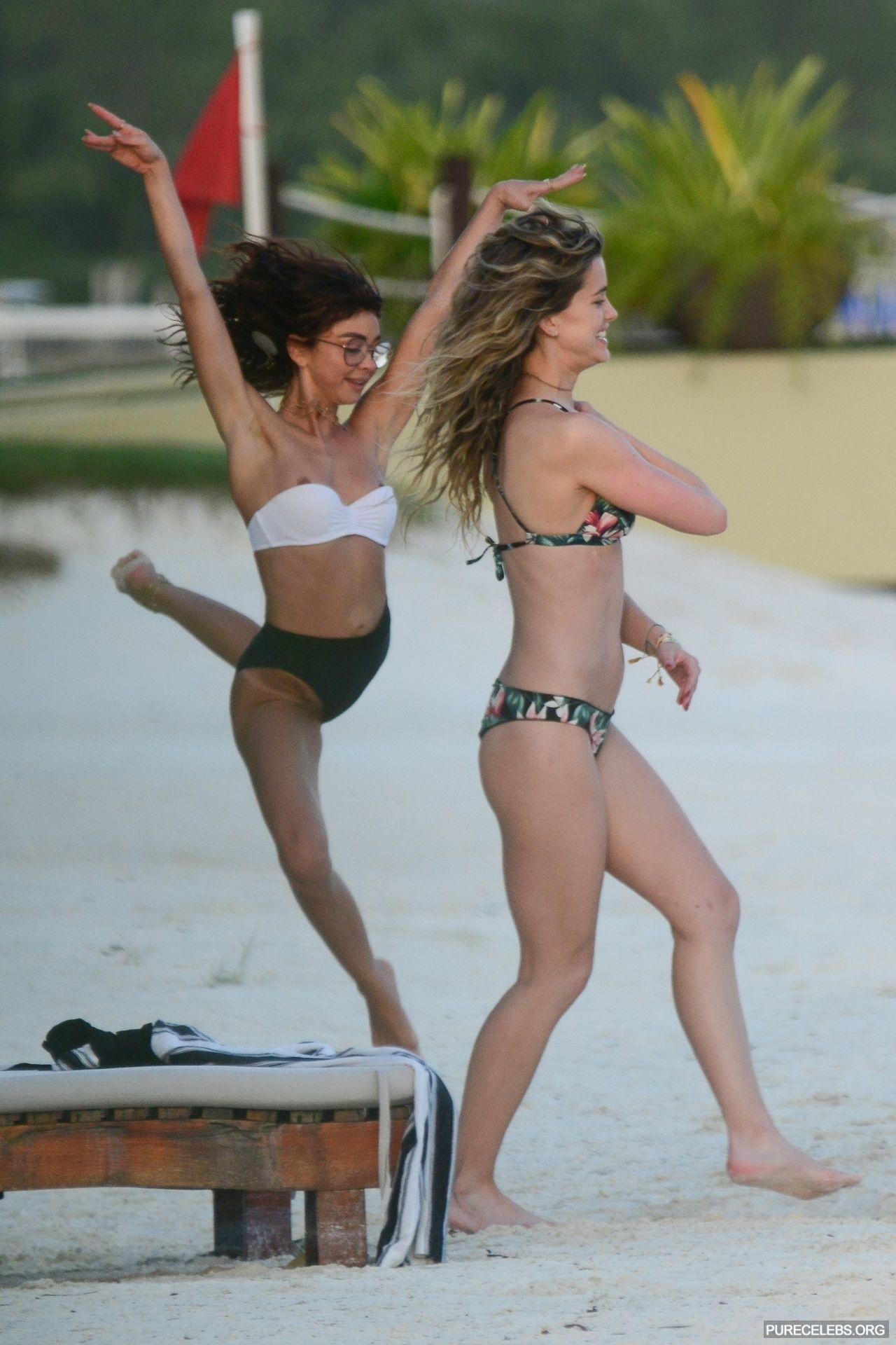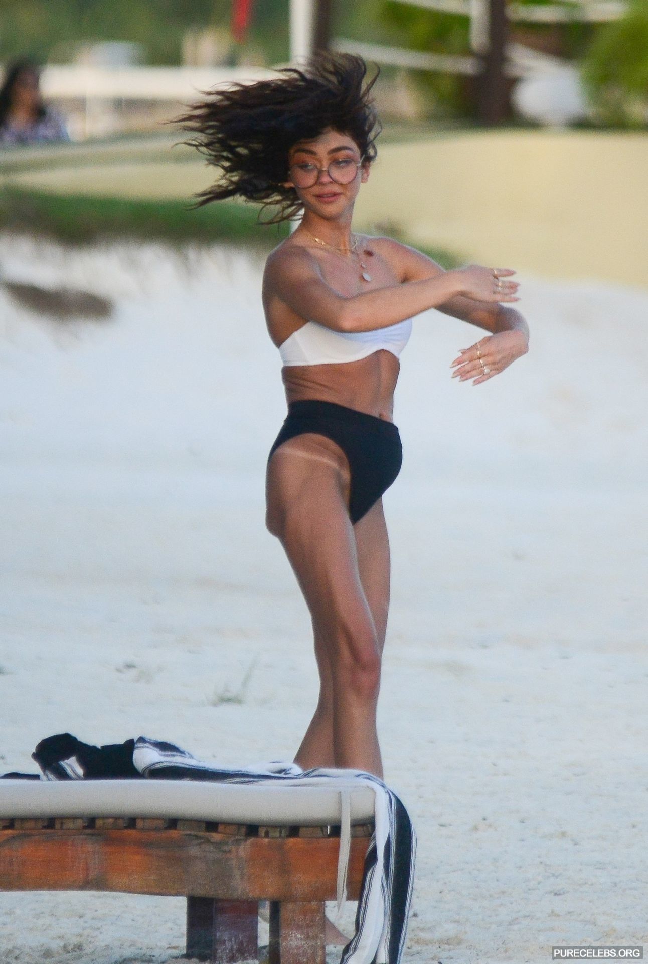 American actress Sarah Hyland can drive everyone crazy with her nude boobies. Paparazzi photographed this beauty in black panties and a white bra when she splashed in the water. The bra was very small and slipped down after one awkward movement. And Sarah Hyland’s tiny titties with brown nipples became visible to everyone around. It really turns me on!