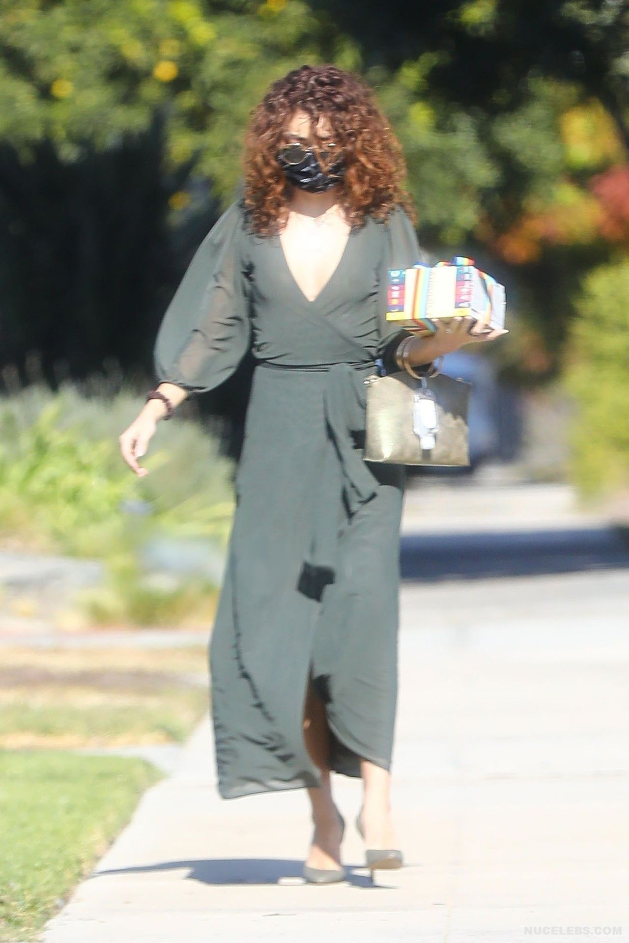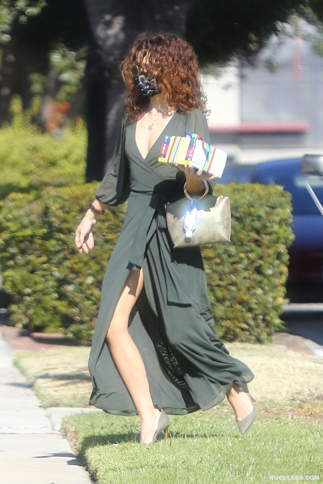 Recently, the paparazzi caught American actress Sarah Hyland in a very provocative outfit on the street. The girl was dressed in a long gray dress, which, however, did not cover her breasts or her legs. Through the thin fabric one could see Sarah Hyland’s nude boobs with hard nipples that just strove to jump out of the deep neckline. In addition, the celebrity also showed off her beautiful slender legs, looking out of a high slit.
