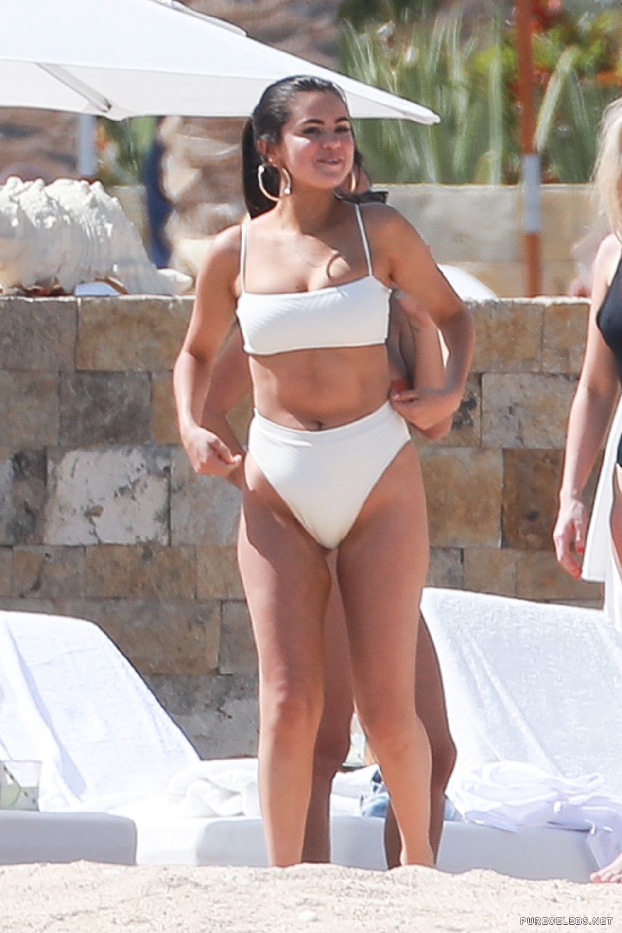 Selena Gomez is out at the beach with her friends and she is showing off her thick curves while she is wearing her white bikini. The little hottie that loves all the attention but that also acts classy does a lot of sexy things while the camera lenses are focusing on her. Sadly, we do not see any nipples or pussies here.