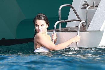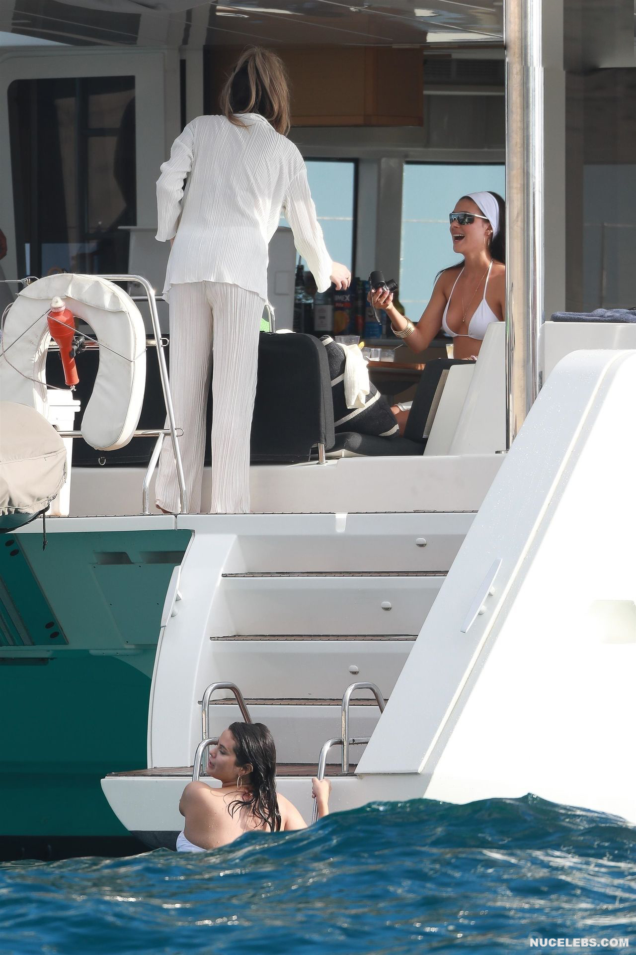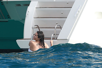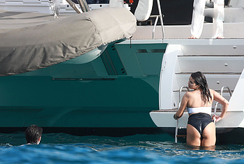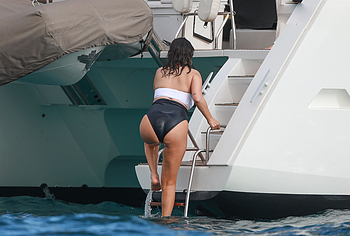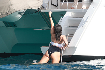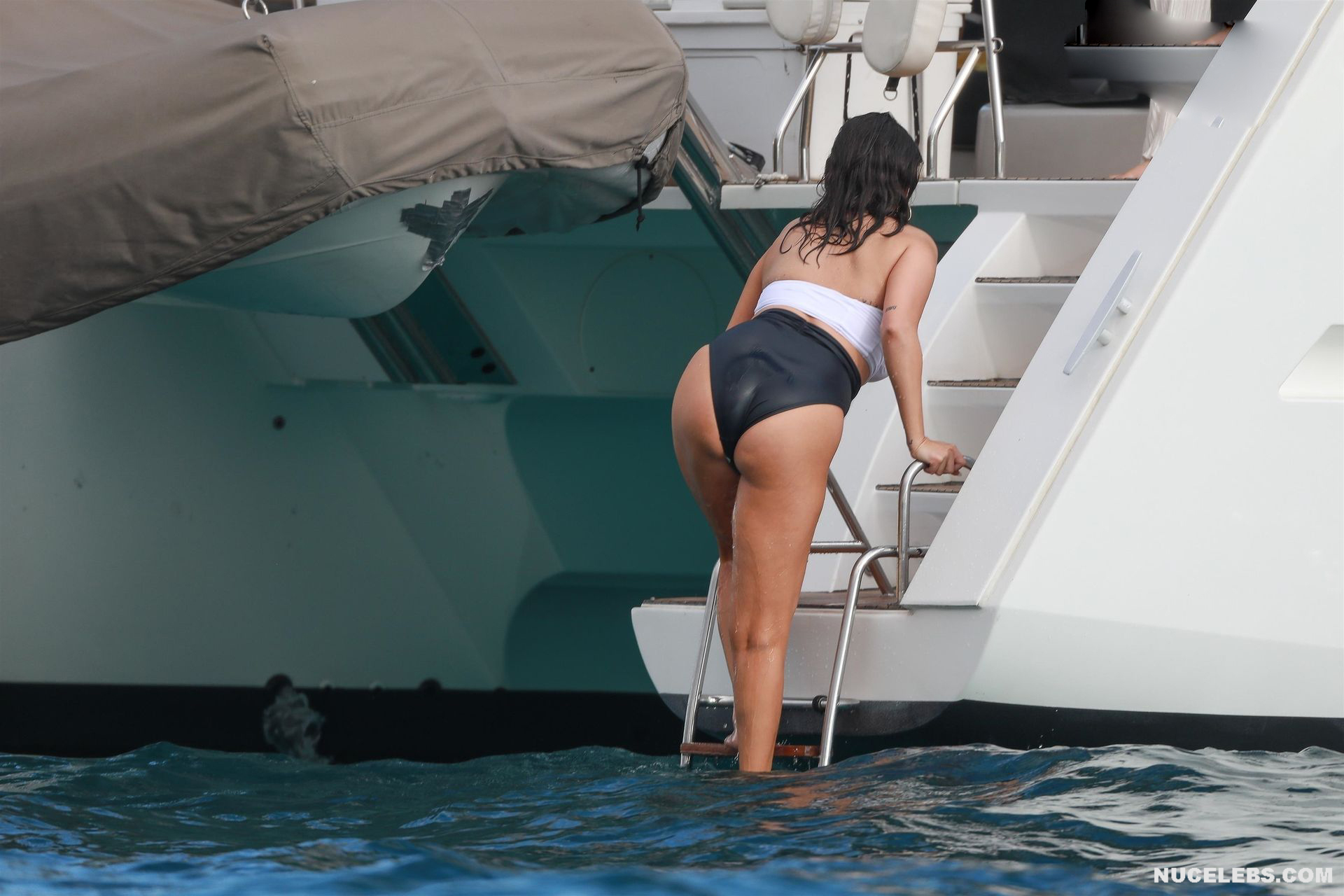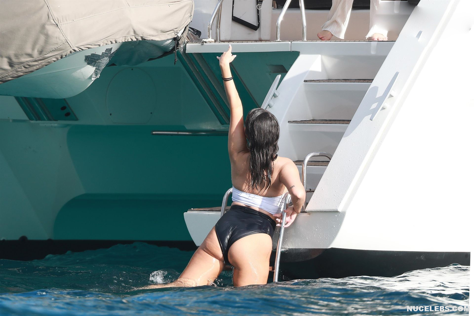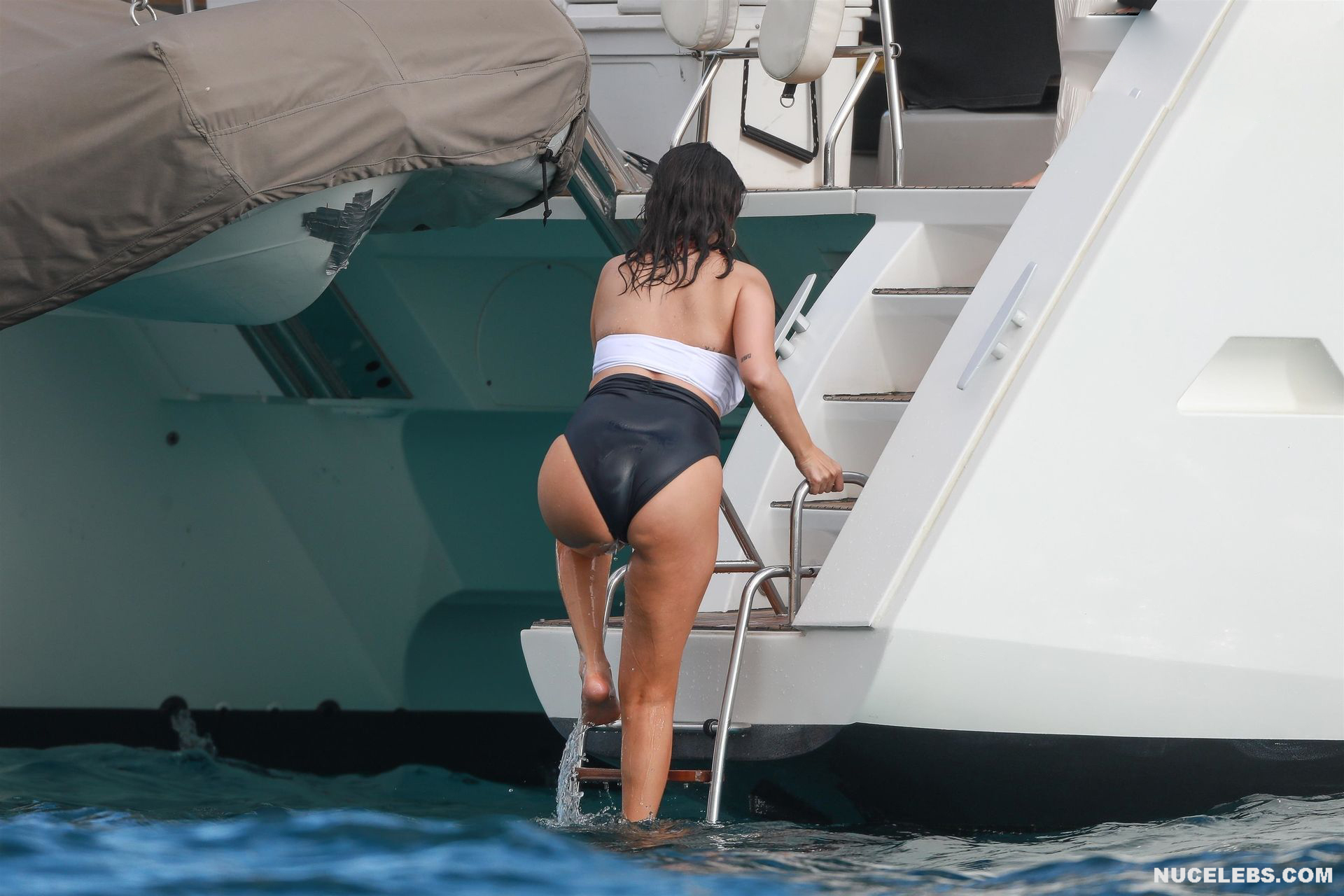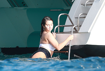 The paparazzi managed to photograph Selena Gomez’s gorgeous booty during her vacation. The 30-year-old beauty was just getting on the yacht after swimming in the sea. The singer was dressed in a black and white bikini that got wet and hugged her curvaceous curves. And especially you won’t be able to look away from Selena Gomez peach ass, which was barely covered by tight black panties.