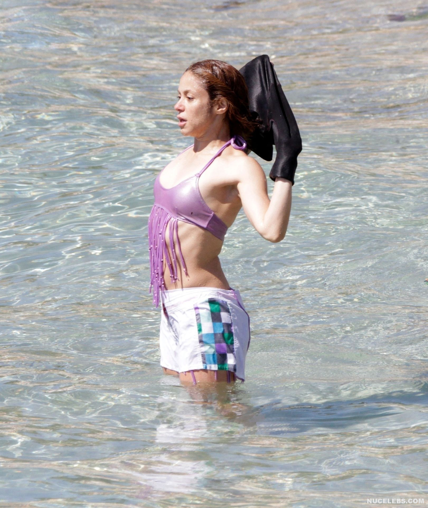 The paparazzi keep following Shakira in hopes of taking nude pictures of her. However, it is not so easy. This celebrity is in no hurry to completely undress, but some hot beach pictures still periodically get on the network. For example, Shakira was photographed wearing a small purple bikini that perfectly hugged her nude tits with poking nipples. Also, this beauty almost showed her bare breasts when she sunbathed in a green and yellow miniature bikini and raised her hands up.
