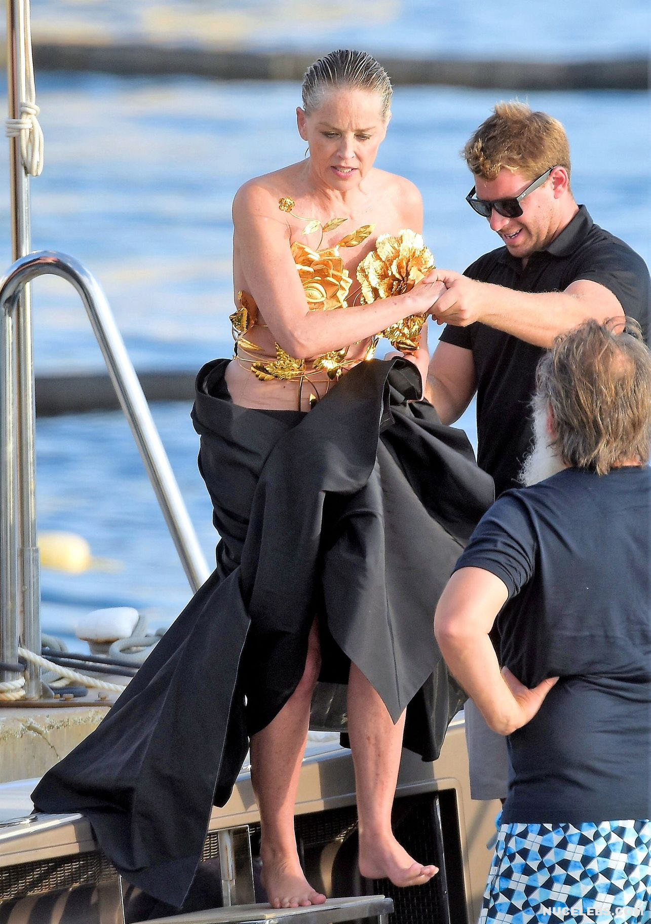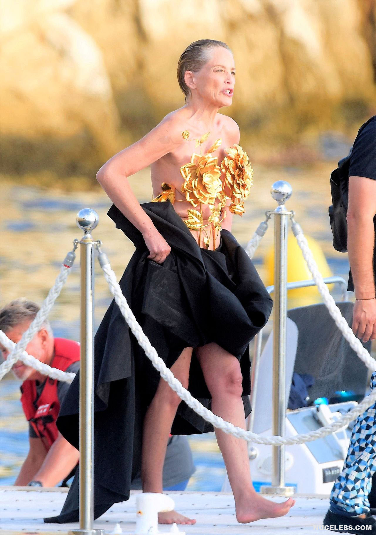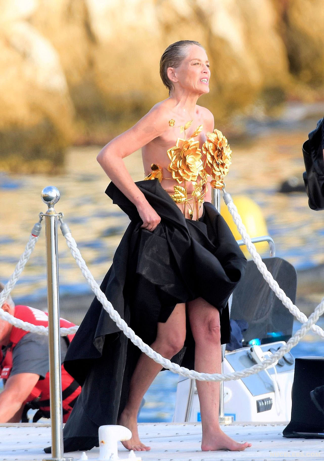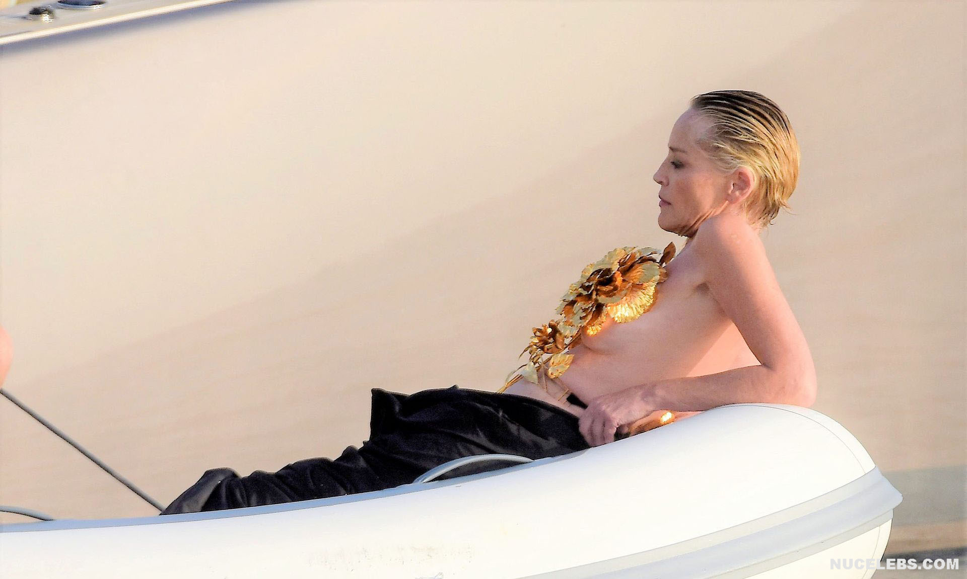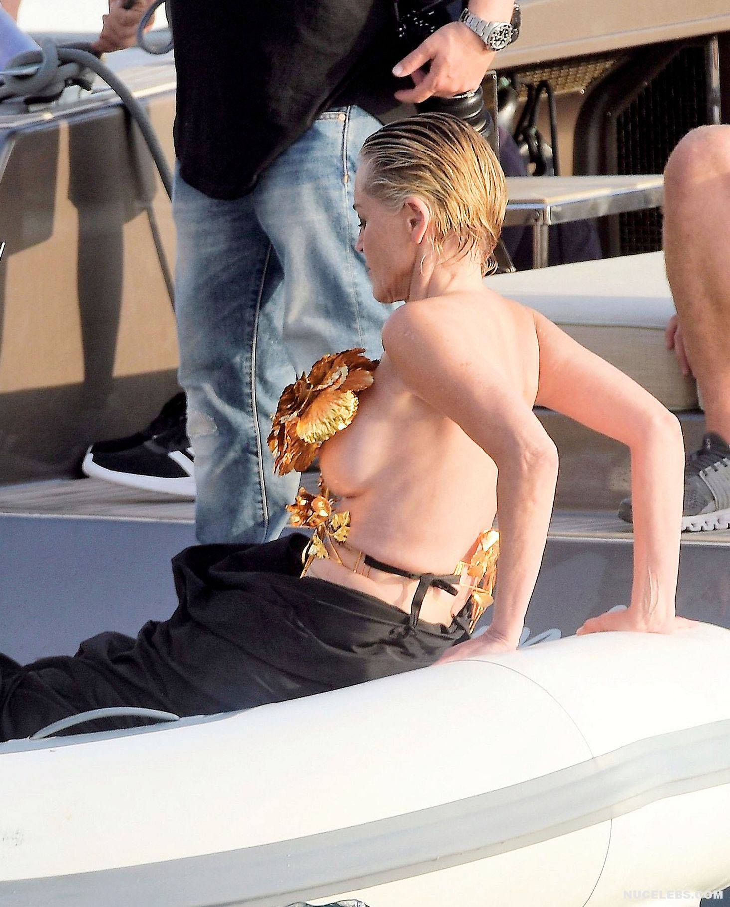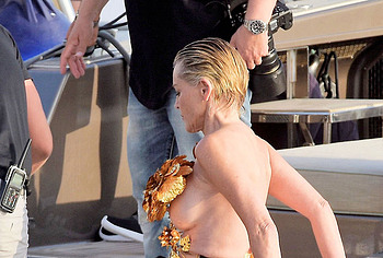 Mature beauty Sharon Stone shows her nude boobies while preparing for a photoshoot! The paparazzi photographed this American actress while she was on a topless yacht! The assistants were just helping to attach the installation of golden flowers to Sharon Stone’s nude titties. However, it’s worth noting that the profile photos show that this golden installation did not hide her awesome breasts at all. This star also flashed her almost bare butt in a petite beige thong when she changed clothes.