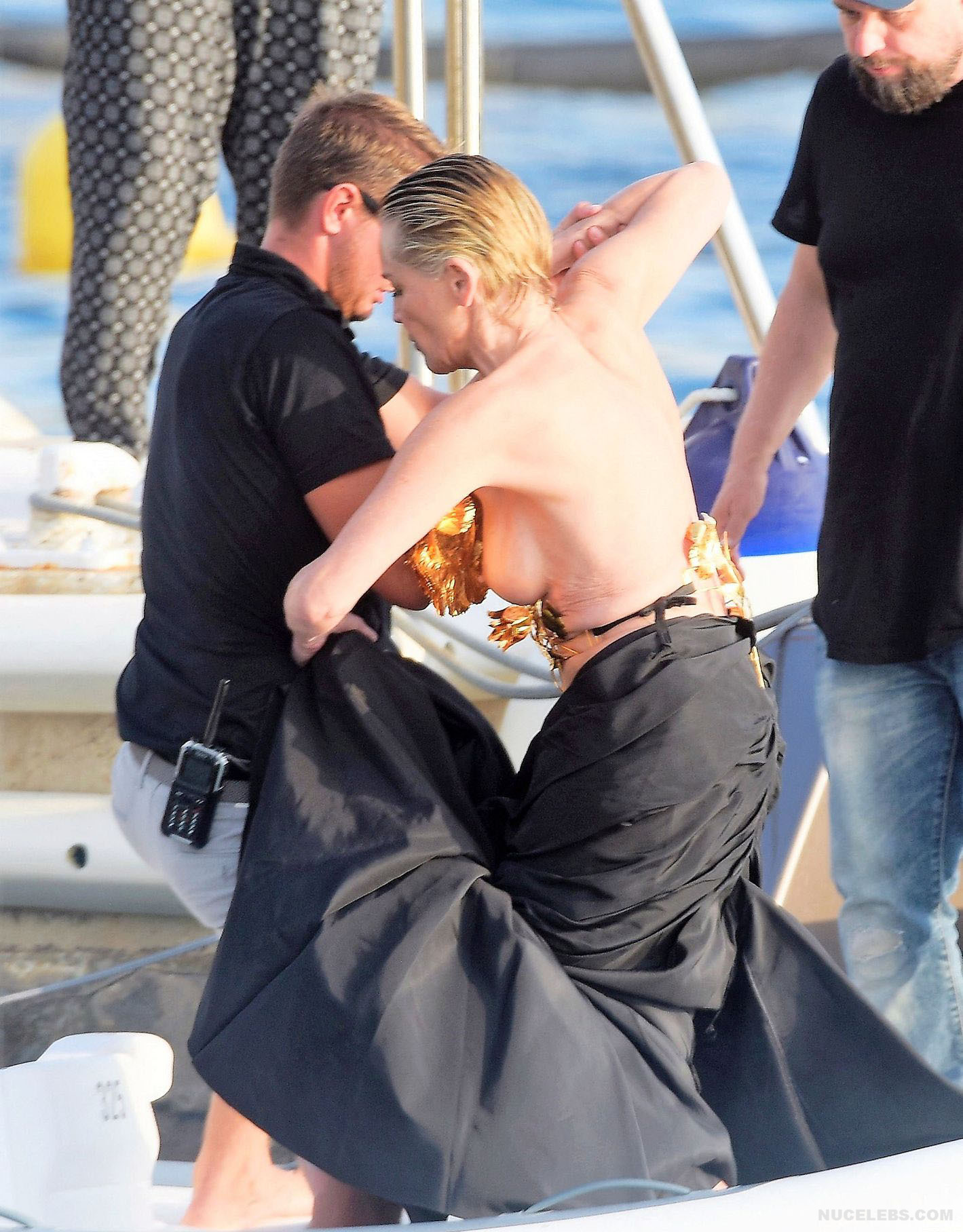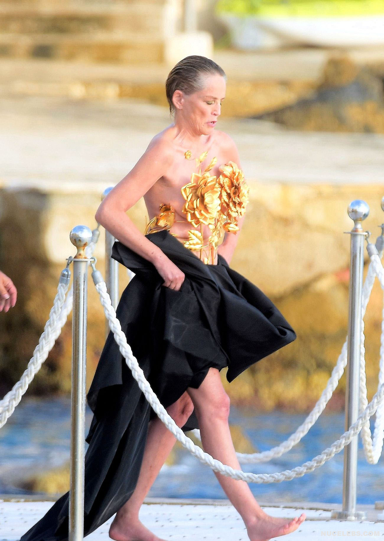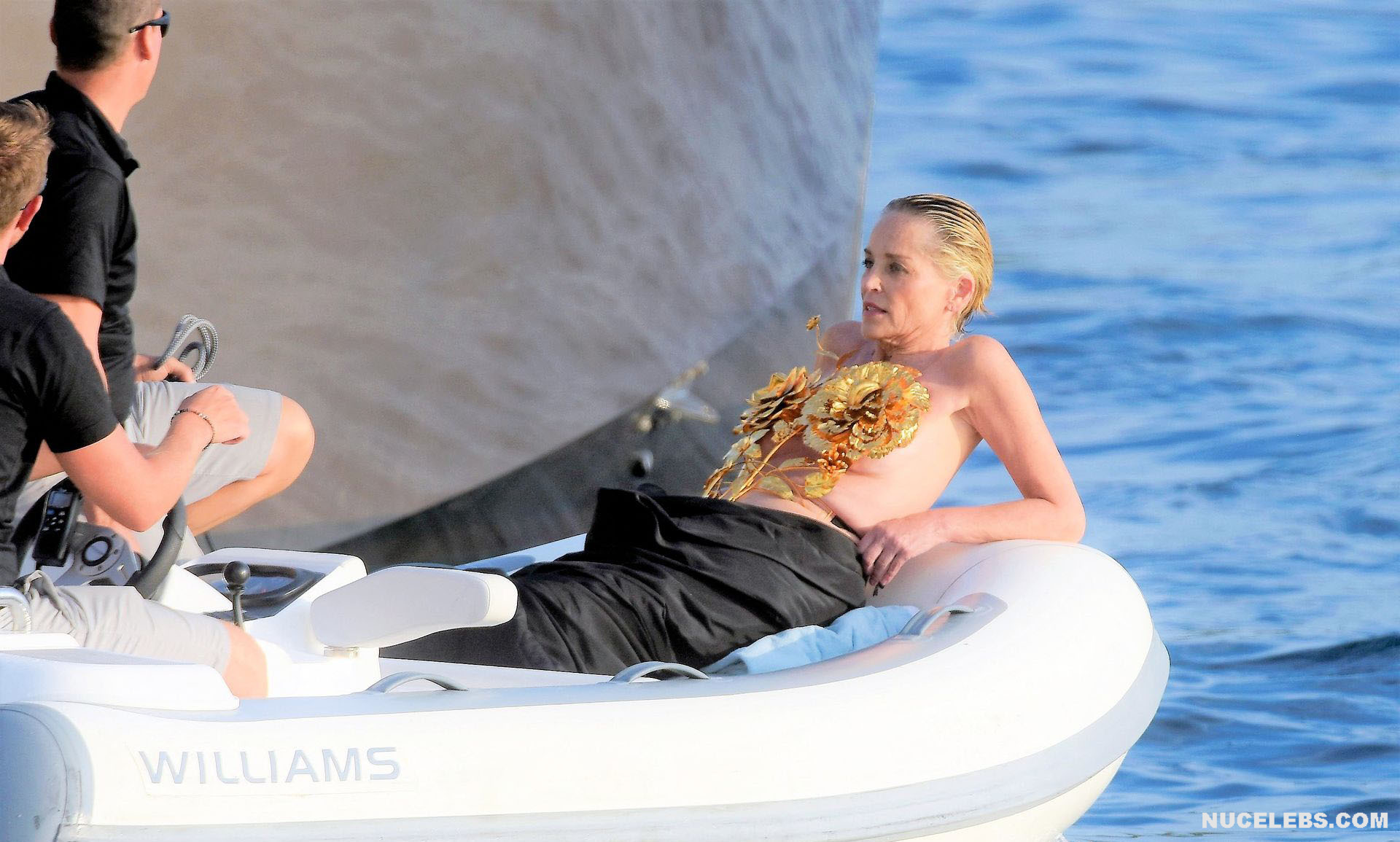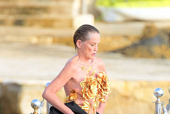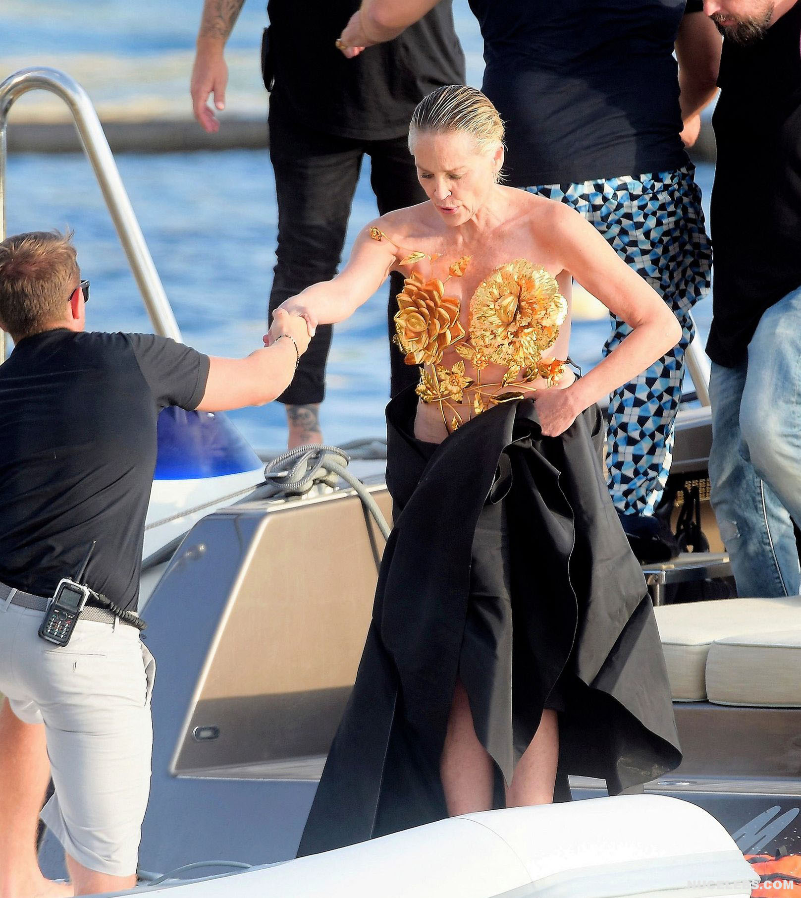 Mature beauty Sharon Stone shows her nude boobies while preparing for a photoshoot! The paparazzi photographed this American actress while she was on a topless yacht! The assistants were just helping to attach the installation of golden flowers to Sharon Stone’s nude titties. However, it’s worth noting that the profile photos show that this golden installation did not hide her awesome breasts at all. This star also flashed her almost bare butt in a petite beige thong when she changed clothes.